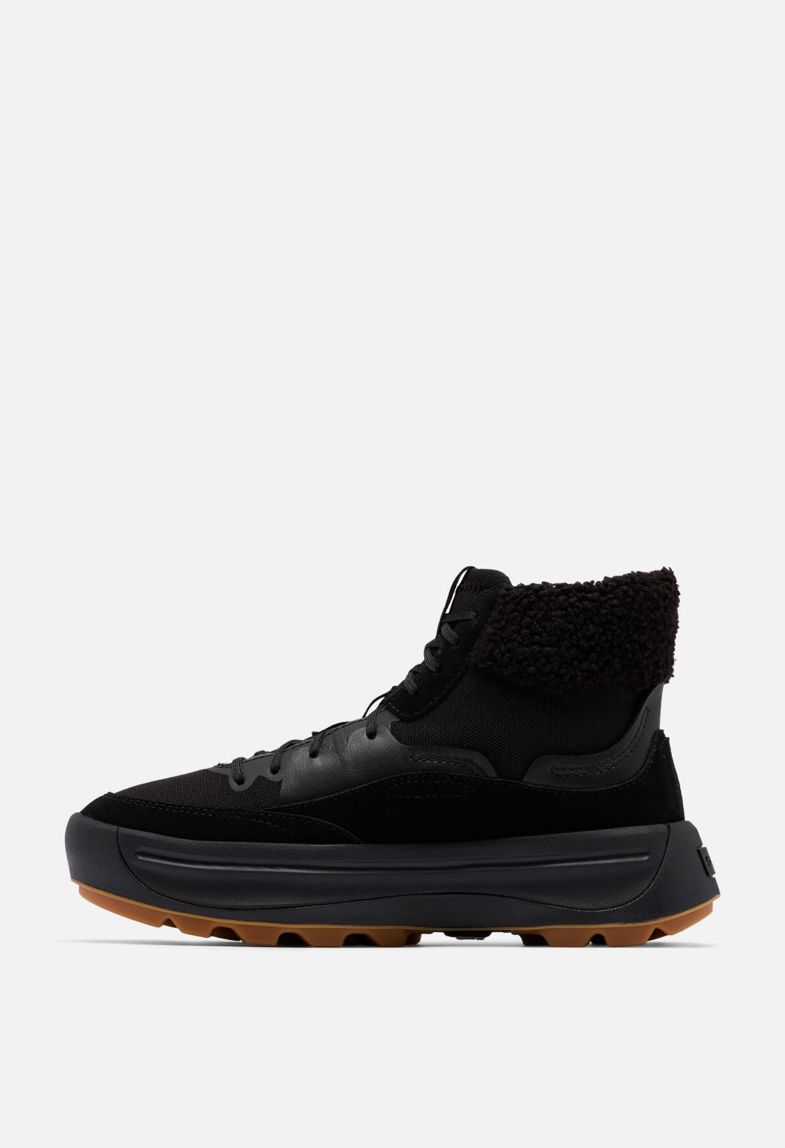 - UPPER: Waterproof materials. Suede, leather and canvas body. Faux shearling collar. Textile lining.