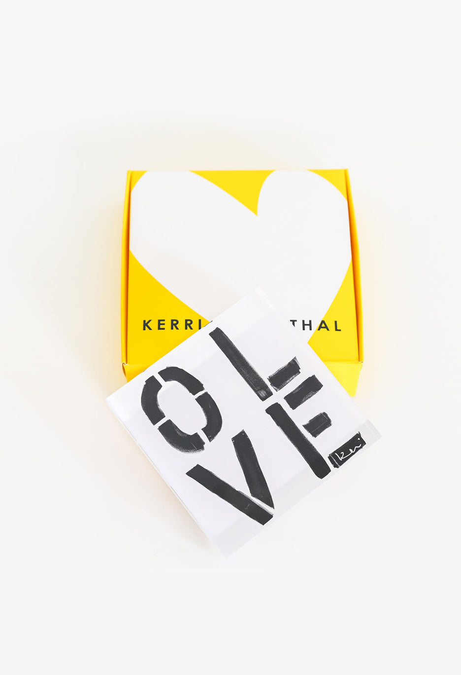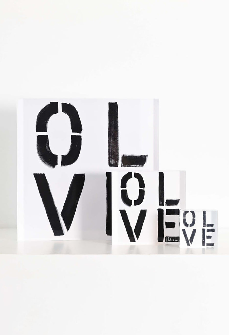 Blocks of Love are signed, mini editions of Kerri Rosenthal's artwork mounted on 3/4" plexiglass. Kerri uses them to style a coffee table, night stand or book shelf. She gives them as gifts to friends and sets one on each plate at her dinner parties.