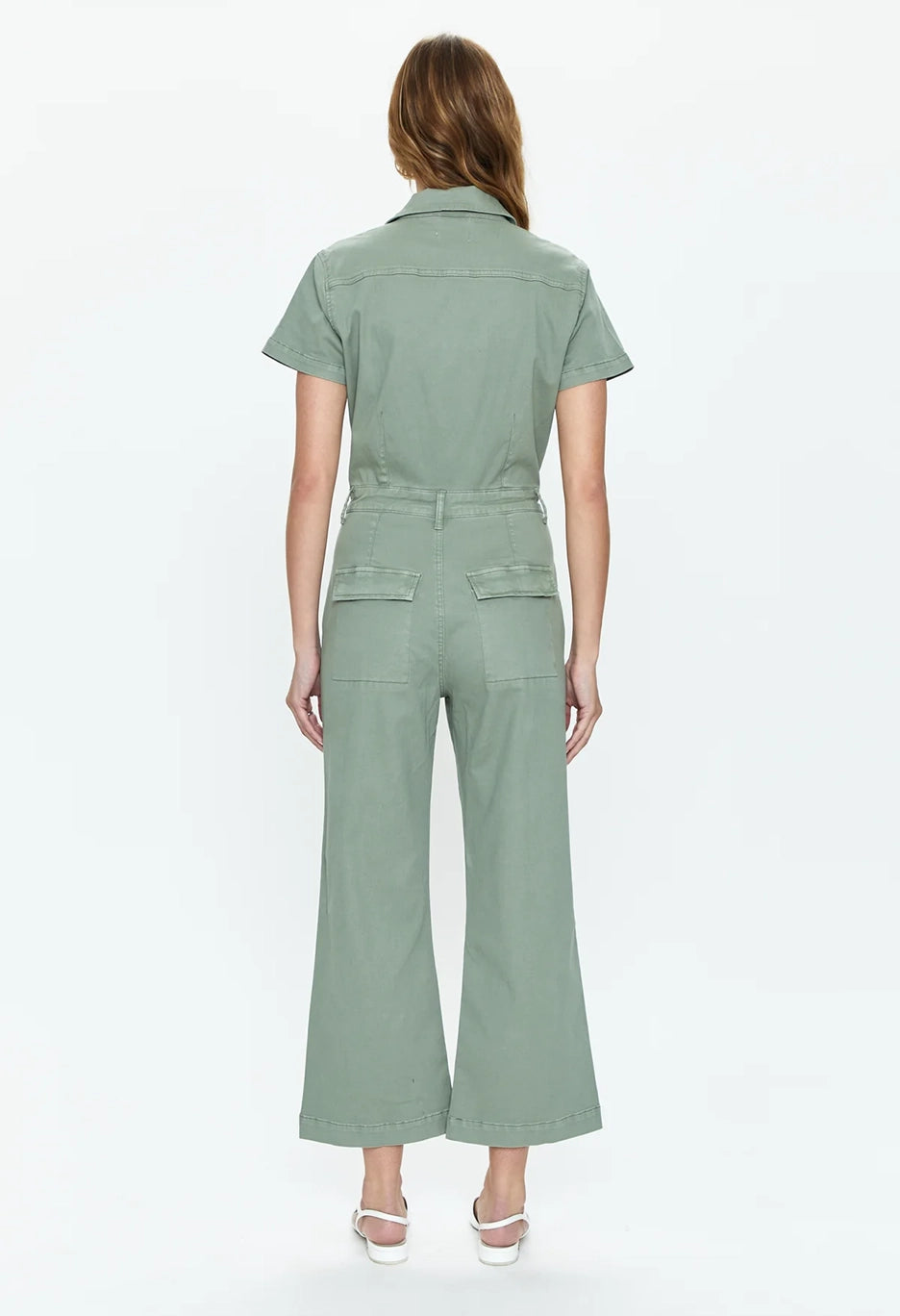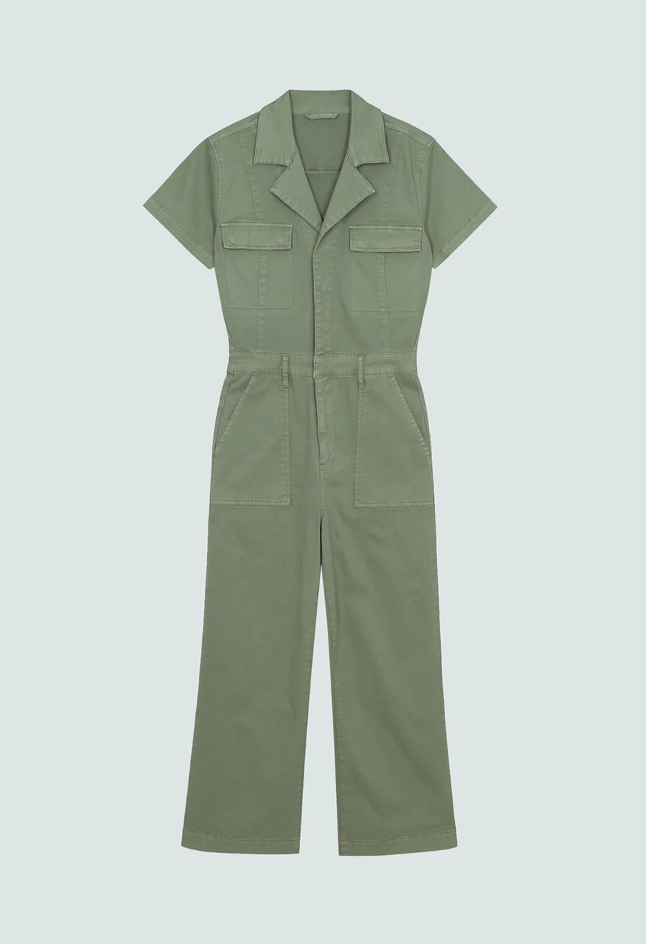 Retro all-in-one jumpsuit defined by a wide leg silhouette and cropped length. A thoughtful blend of utility and aviator inspired design notes is realized through an open neckline, camp collar, front flap pockets, defined seaming details throughout.