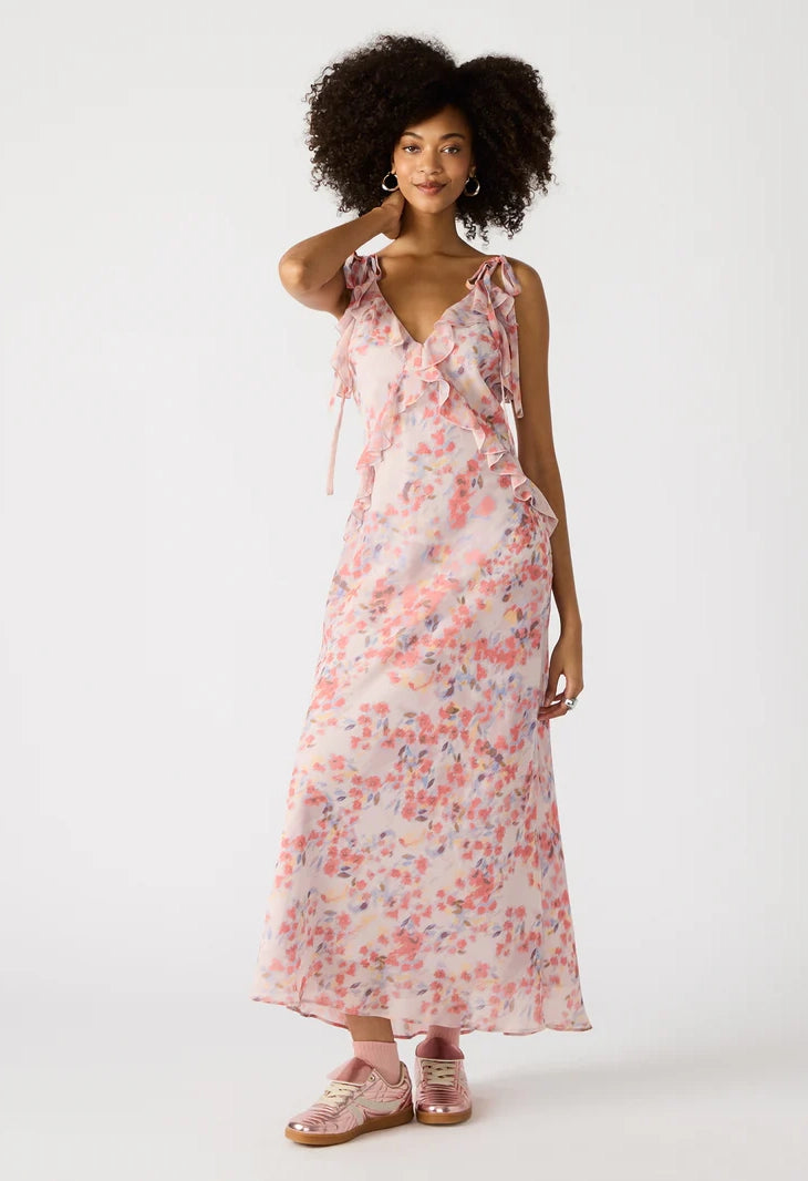 Take center stage with the elegant Adalina dress. Its v-neckline and ruffle detail will make you shine at any event. The sleeveless design makes it a versatile piece for your wardrobe. Make a statement with this stunning maxi dress.