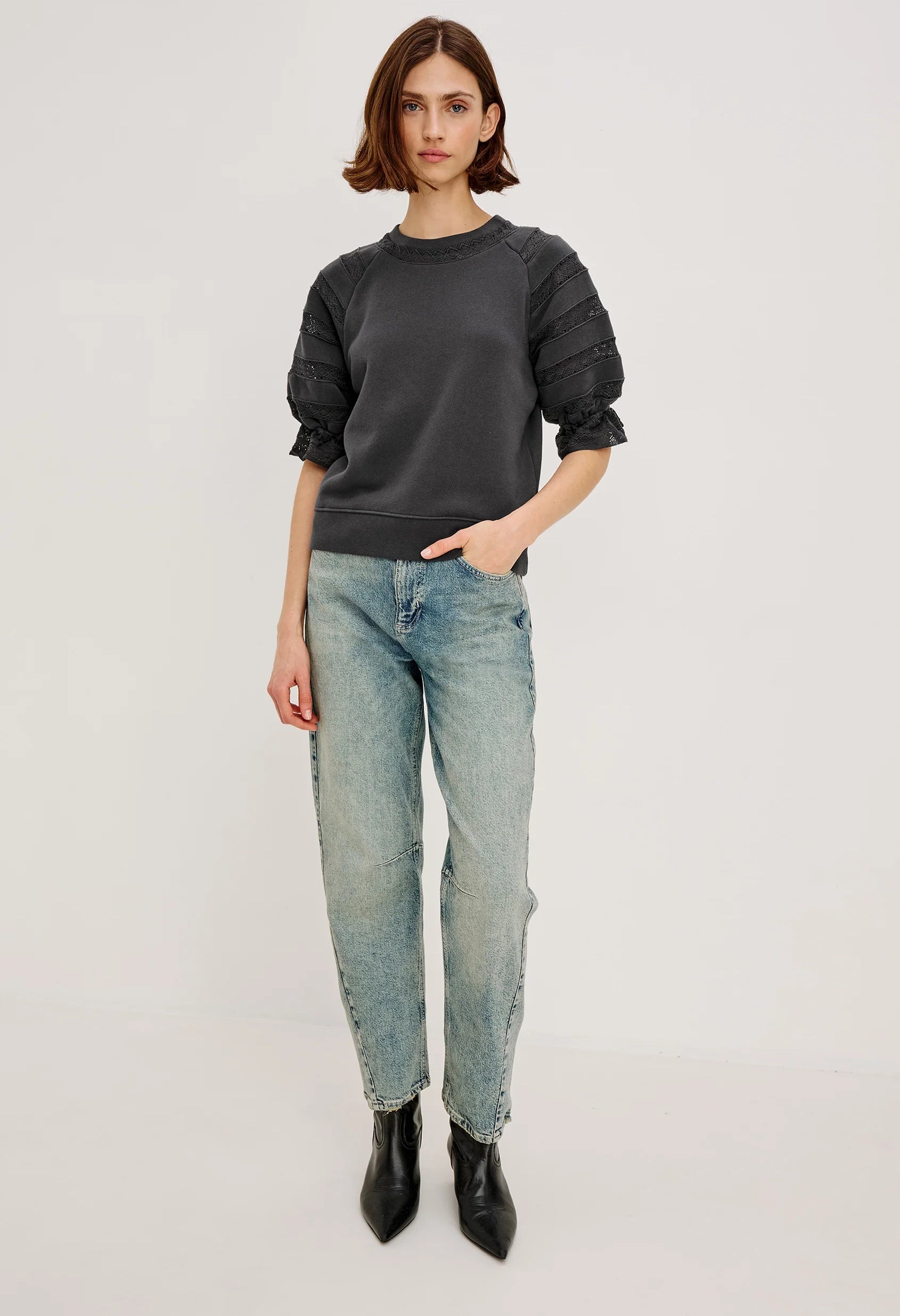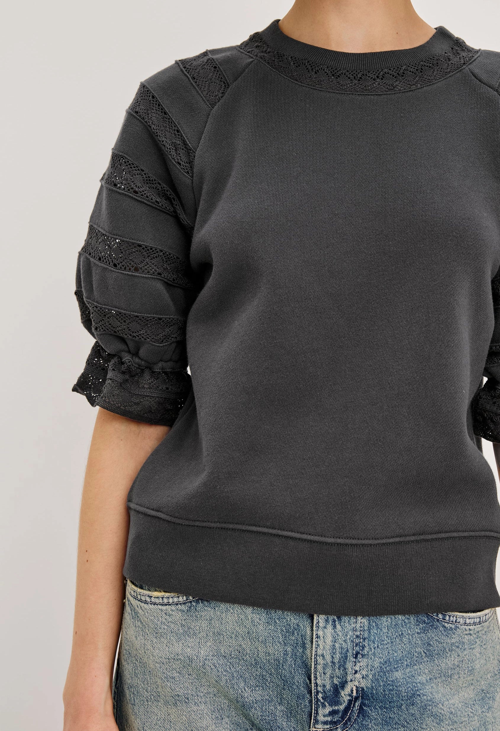 The Aggy sweatshirt features a luxurious French terry fabric and a relaxed, easygoing fit. Its design is enhanced with inset cotton lace and ruffled sleeves, adding a delicate and feminine detail.