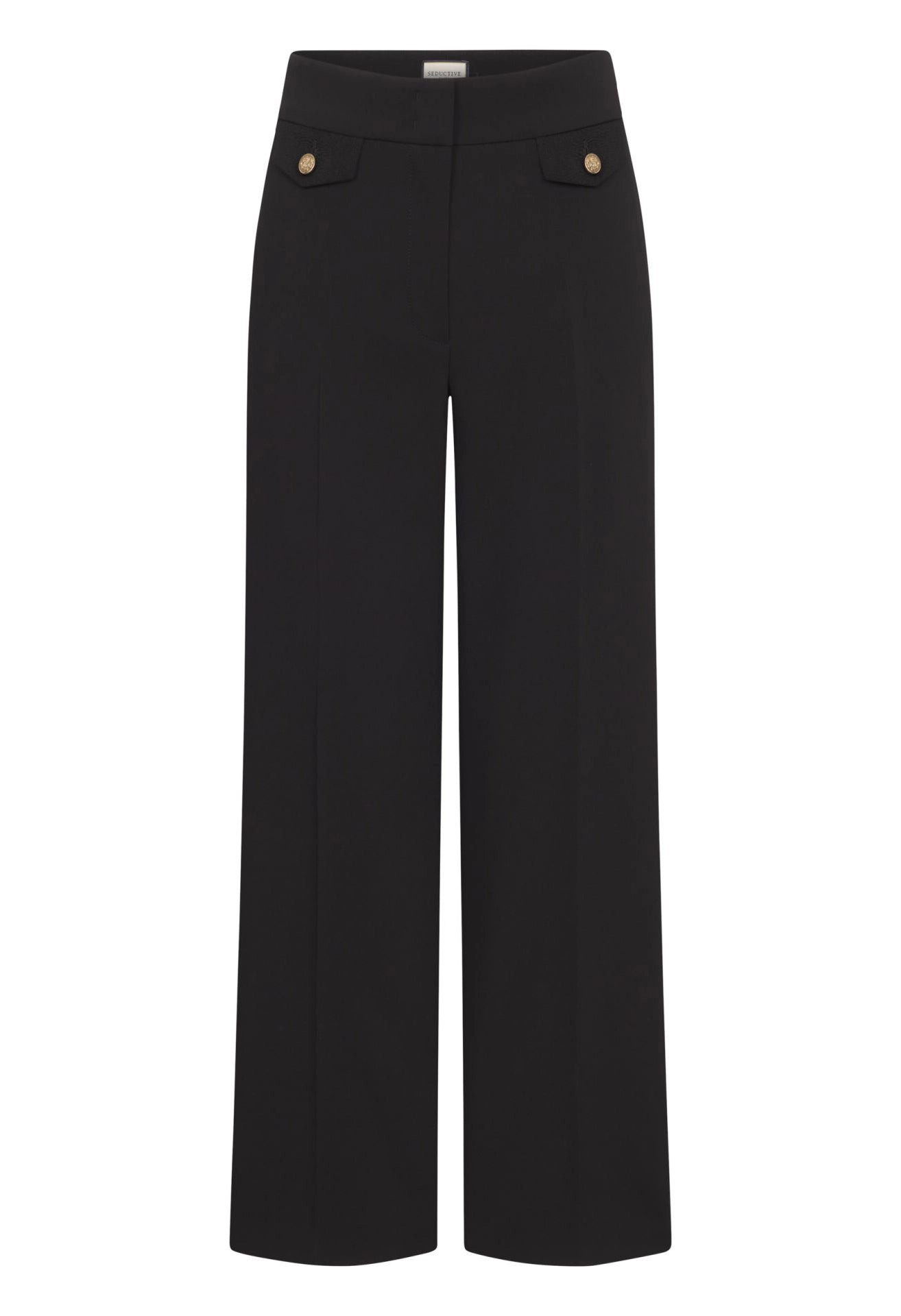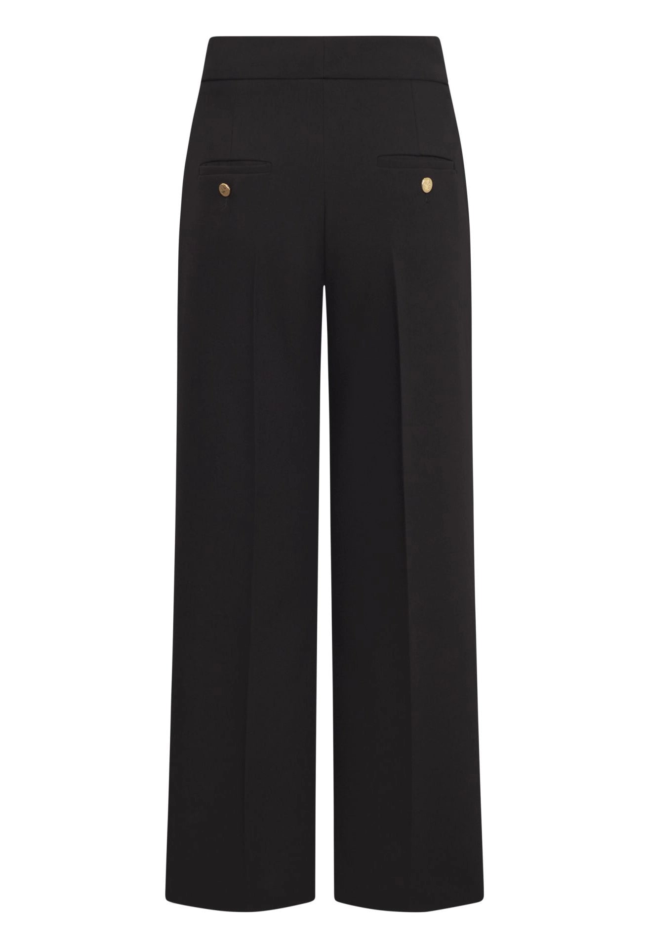 The Alara trousers feature a mid-waist cut with straight legs for a classic silhouette. The front showcases imitated pockets with flaps and buttons, while the back has welt pockets also secured with buttons for a refined look. Crafted from a soft, flowing fabric with a lightly textured surface and cross-stretch, these trousers provide comfort and flexibility throughout the day.