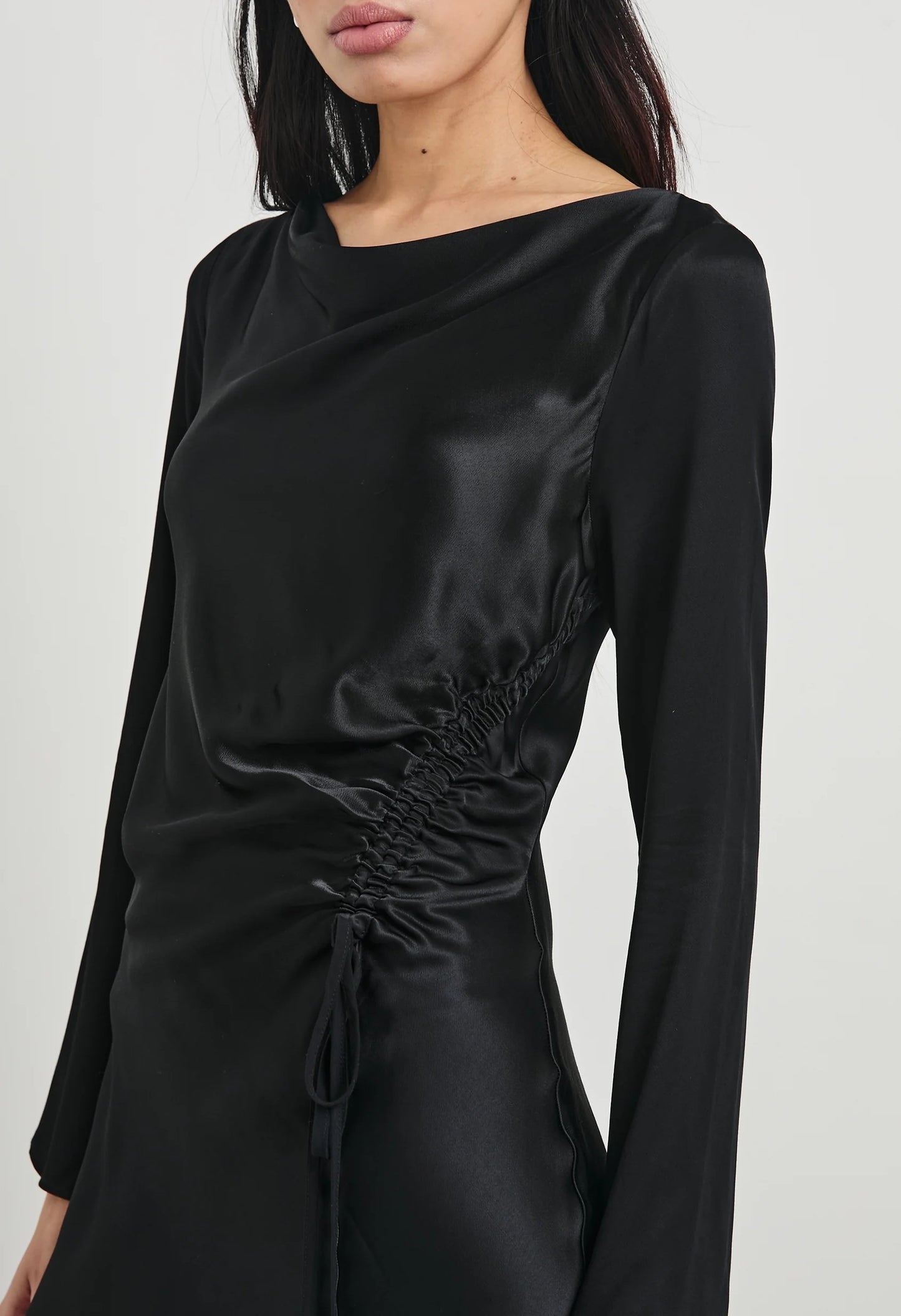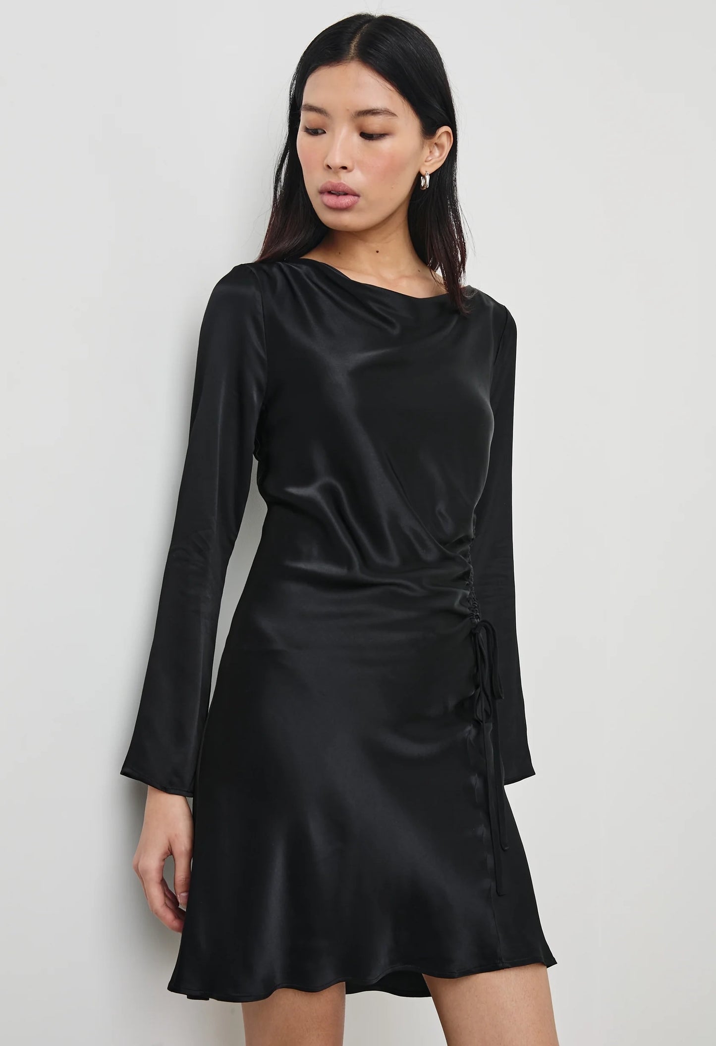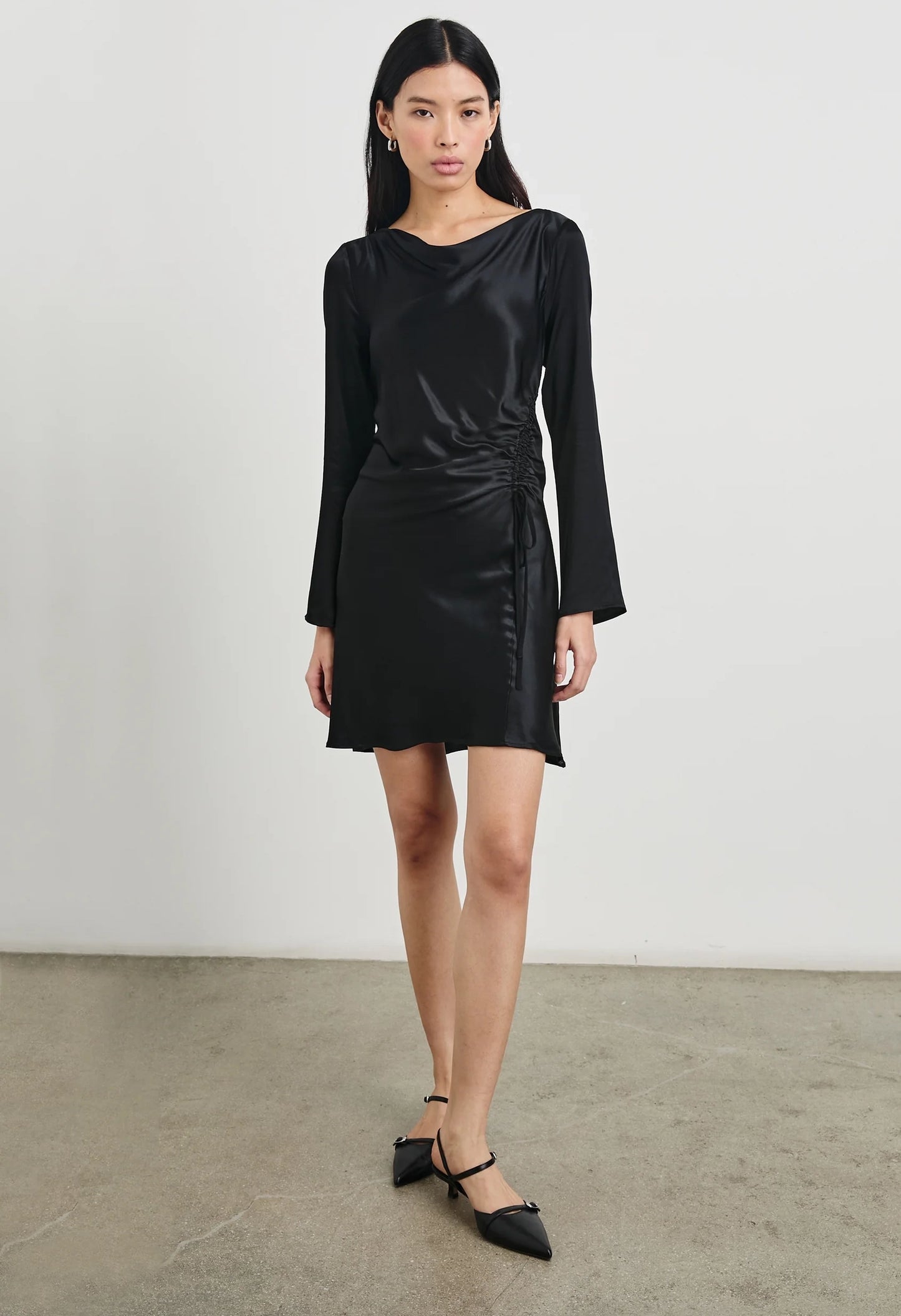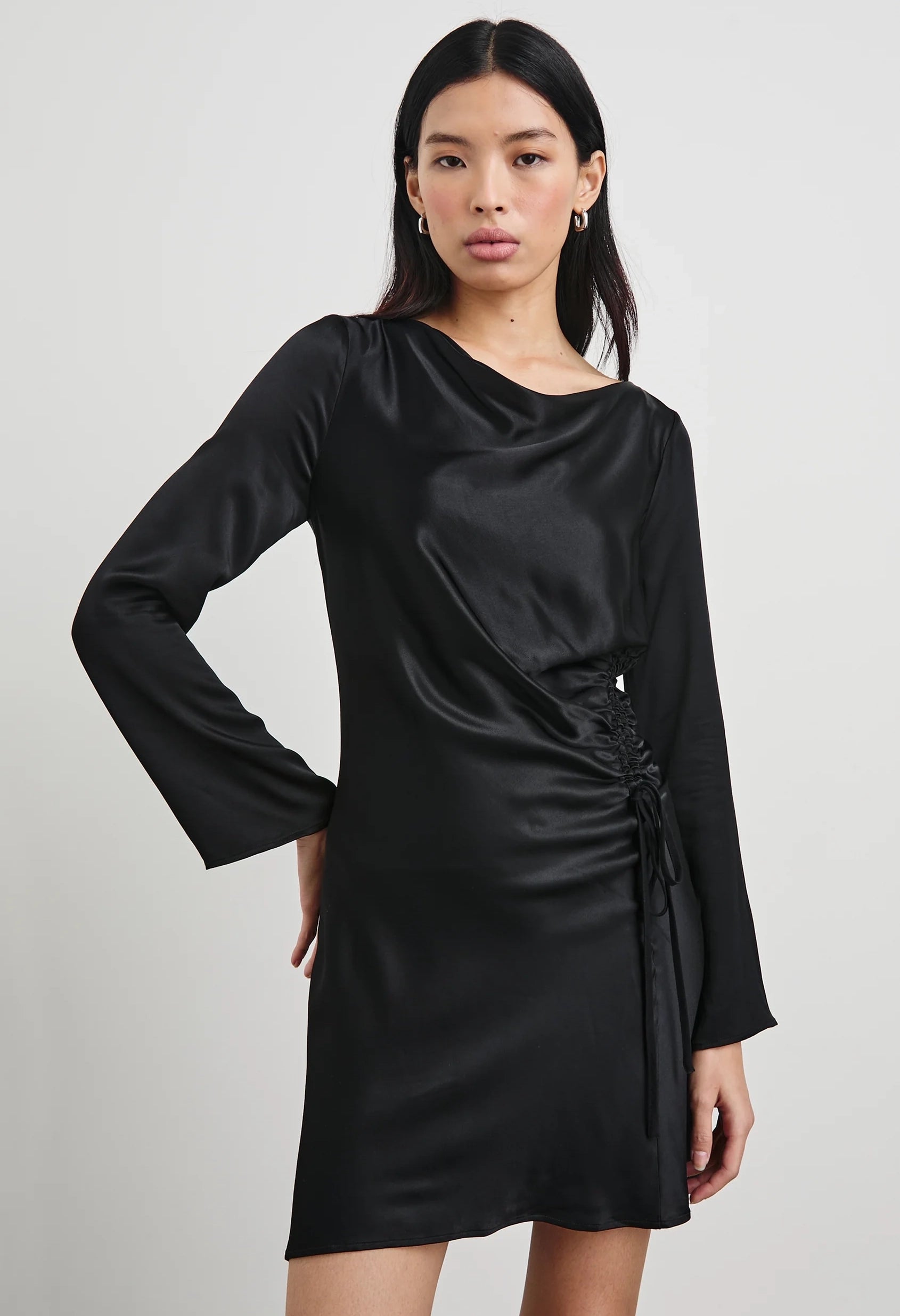 Make a maximum impact in this mini-dress. The Alessandra has a slight cowl, boat-neck opening with subtly-flared sleeves, and an adjustable scrunch at the waist that hugs your curves. Wear for your next event and leave a lasting impression.