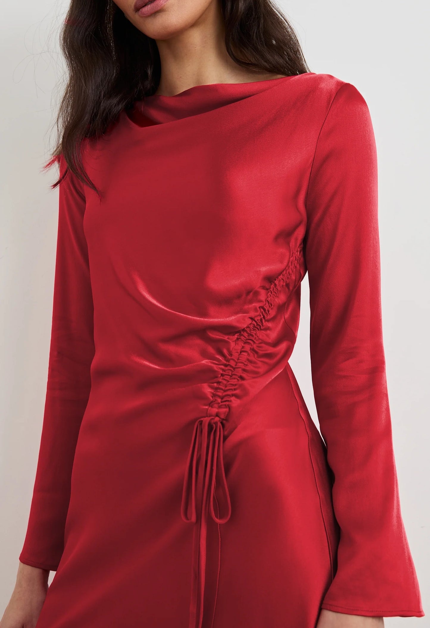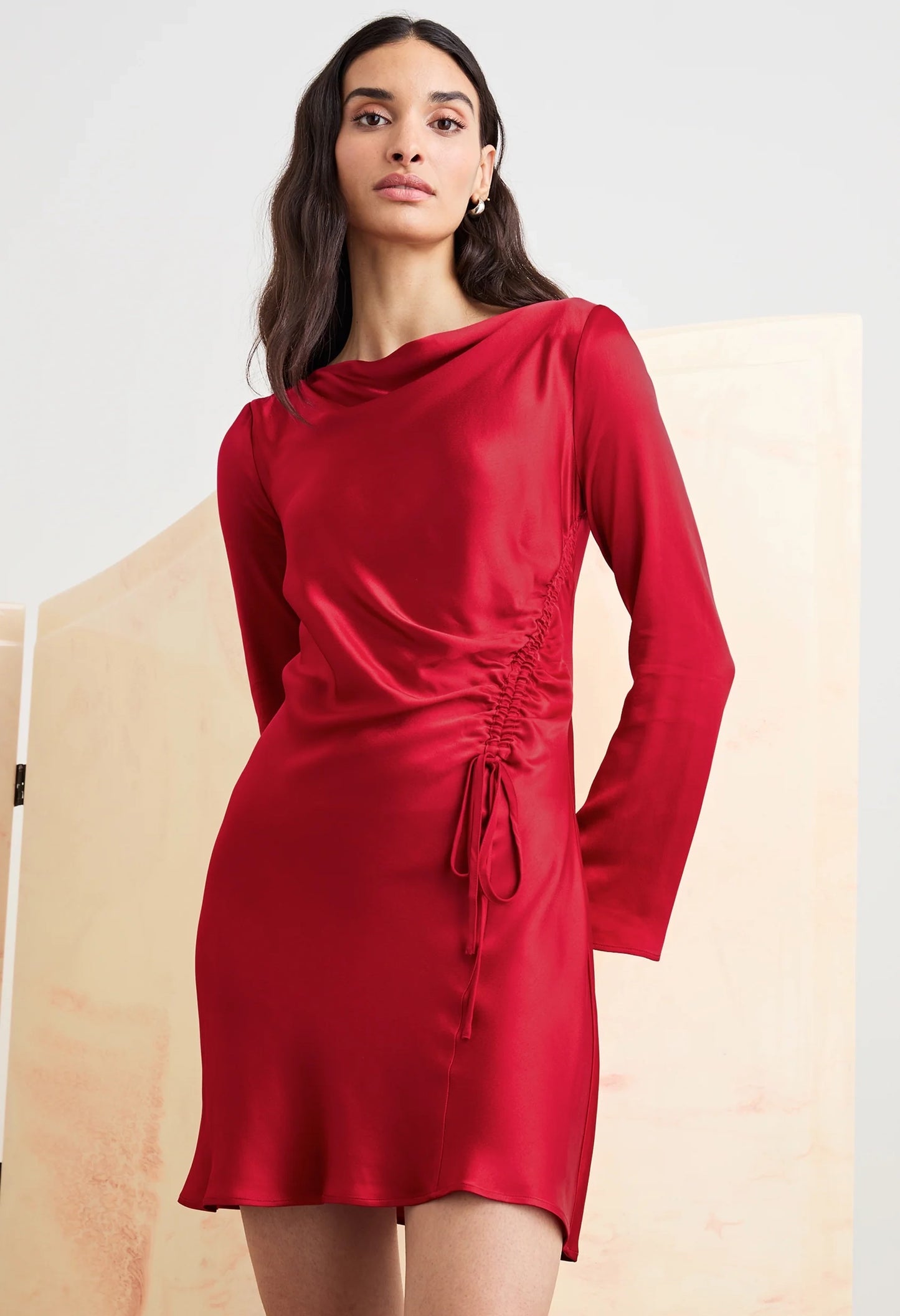 Make a maximum impact in this mini-dress. The Alessandra has a slight cowl, boat-neck opening with subtly-flared sleeves, and an adjustable scrunch at the waist that hugs your curves. Wear for your next event and leave a lasting impression.