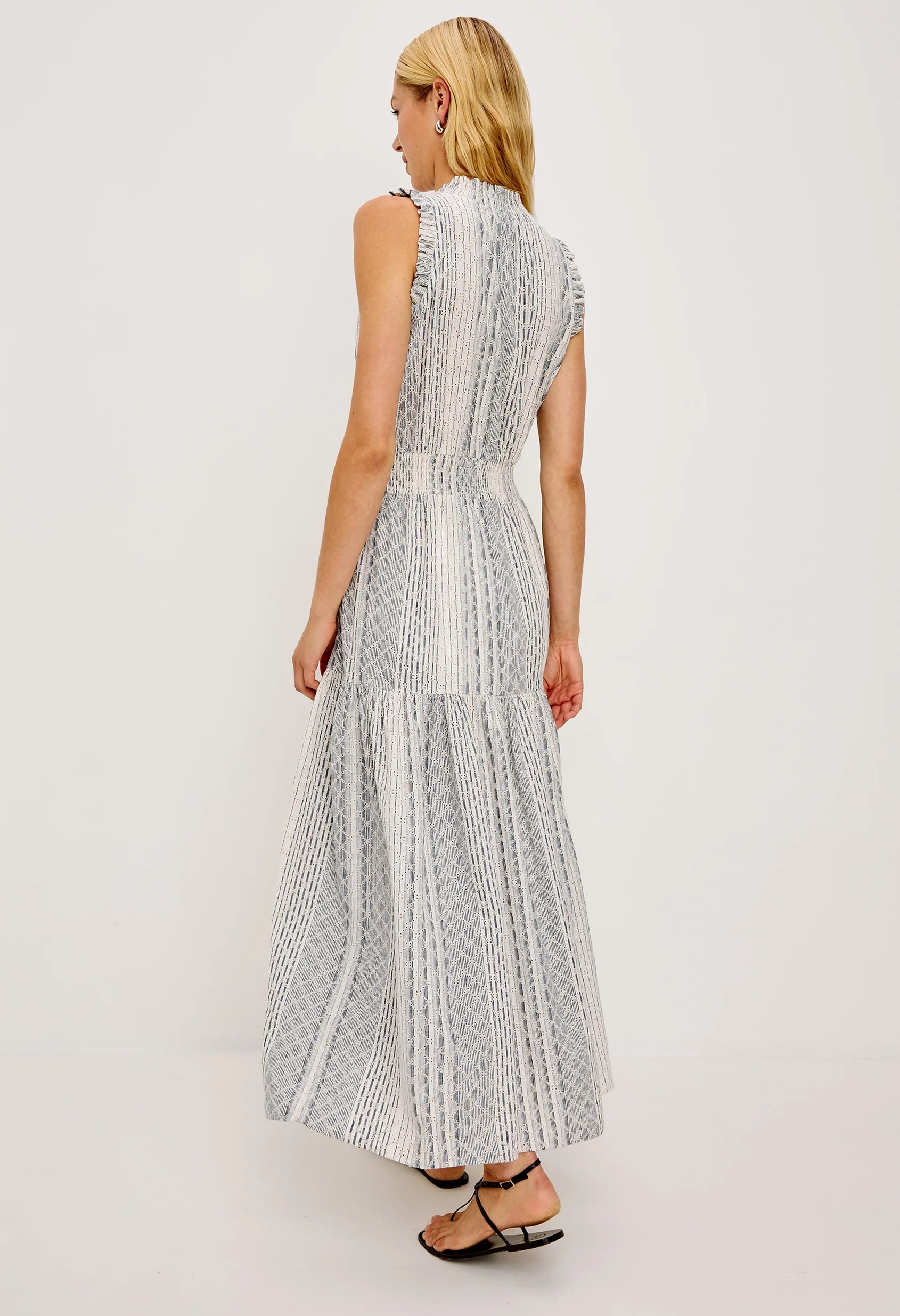 Crafted from luxe linen, the Alessi maxi dress combines timeless elegance with thoughtful details. Diamond eyelet accents frame the smocked split V-neckline, secured with delicate center-front ties, while ruffled sleeveless armholes add movement and charm. A smocked waist defines the silhouette before flowing into a fully lined tiered skirt for effortless sophistication.