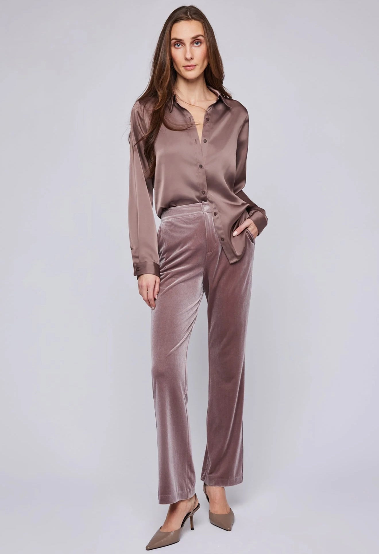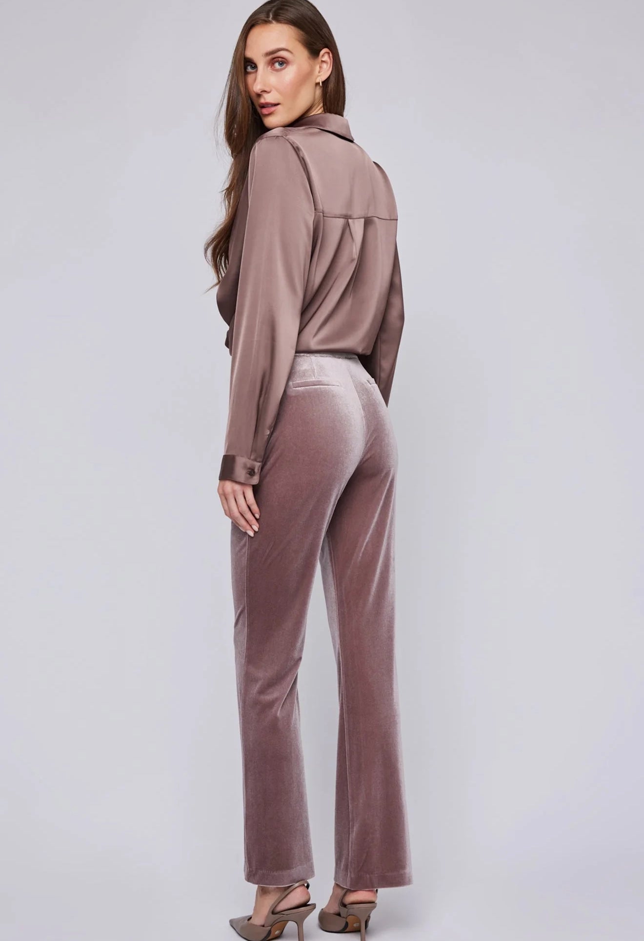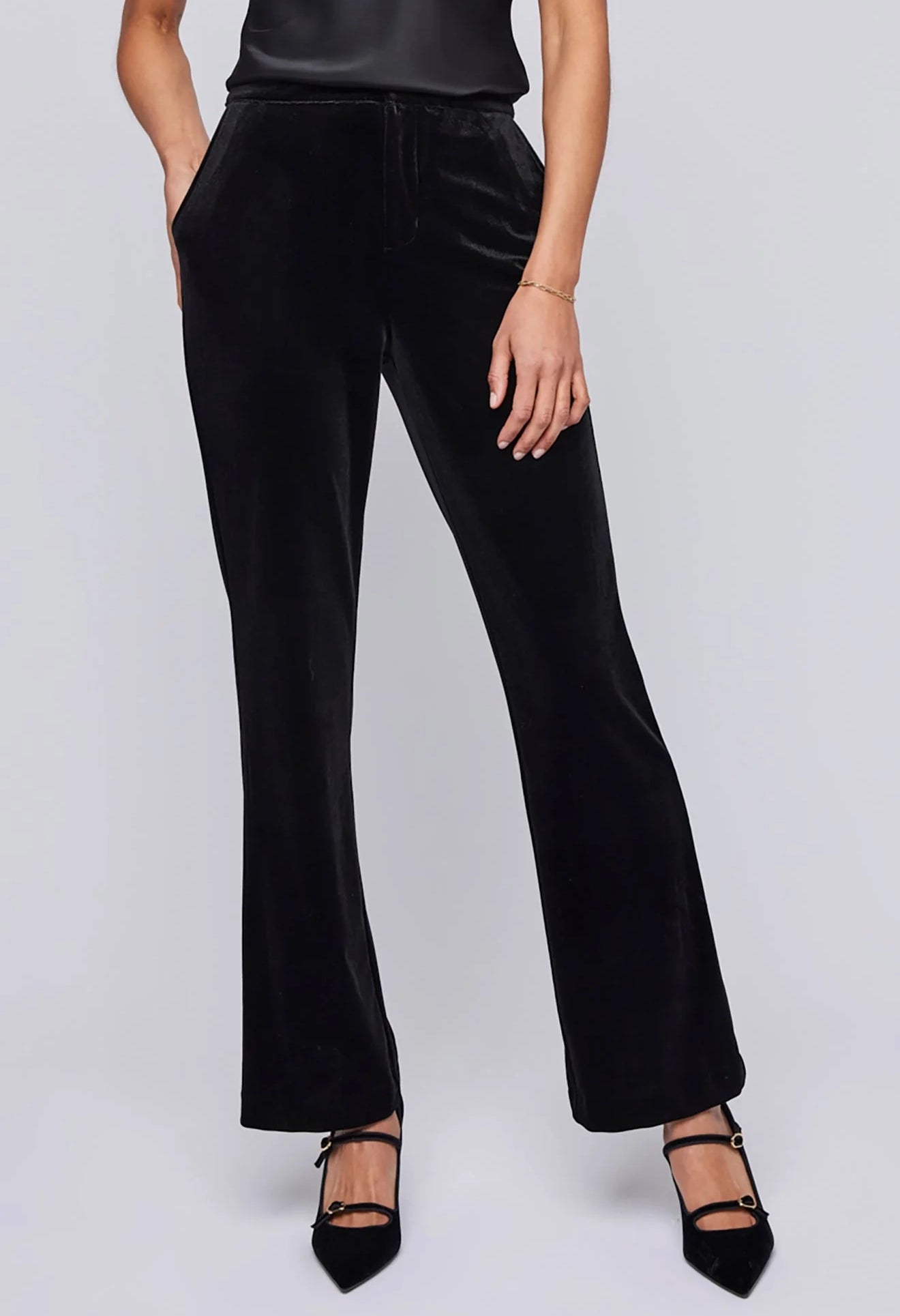 The Alice pant is made of a luxe velvet fabric. Features include slash pockets, a front fly zipper and back elastic for ease of wear. Complete the look with the Caroline blazer.