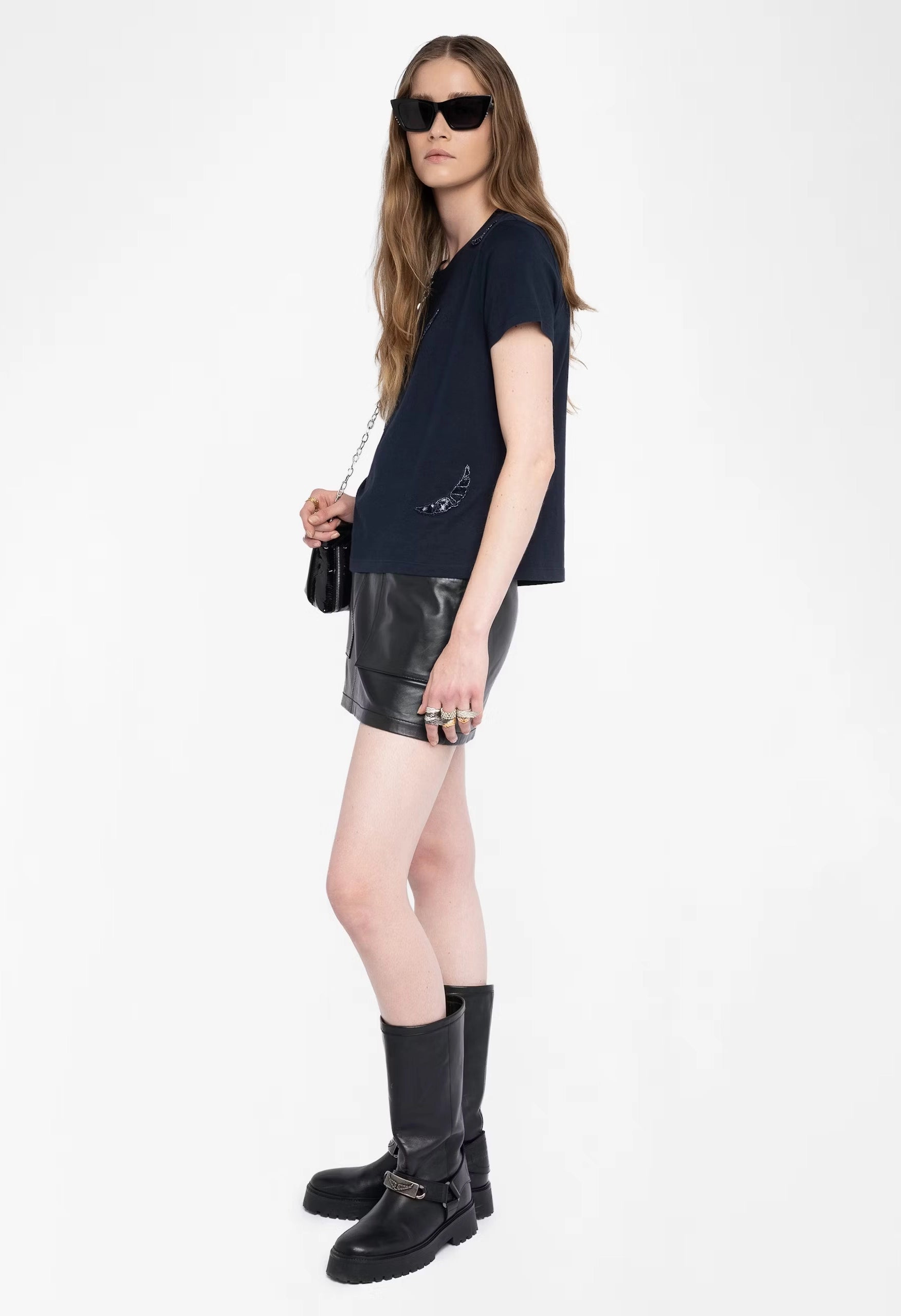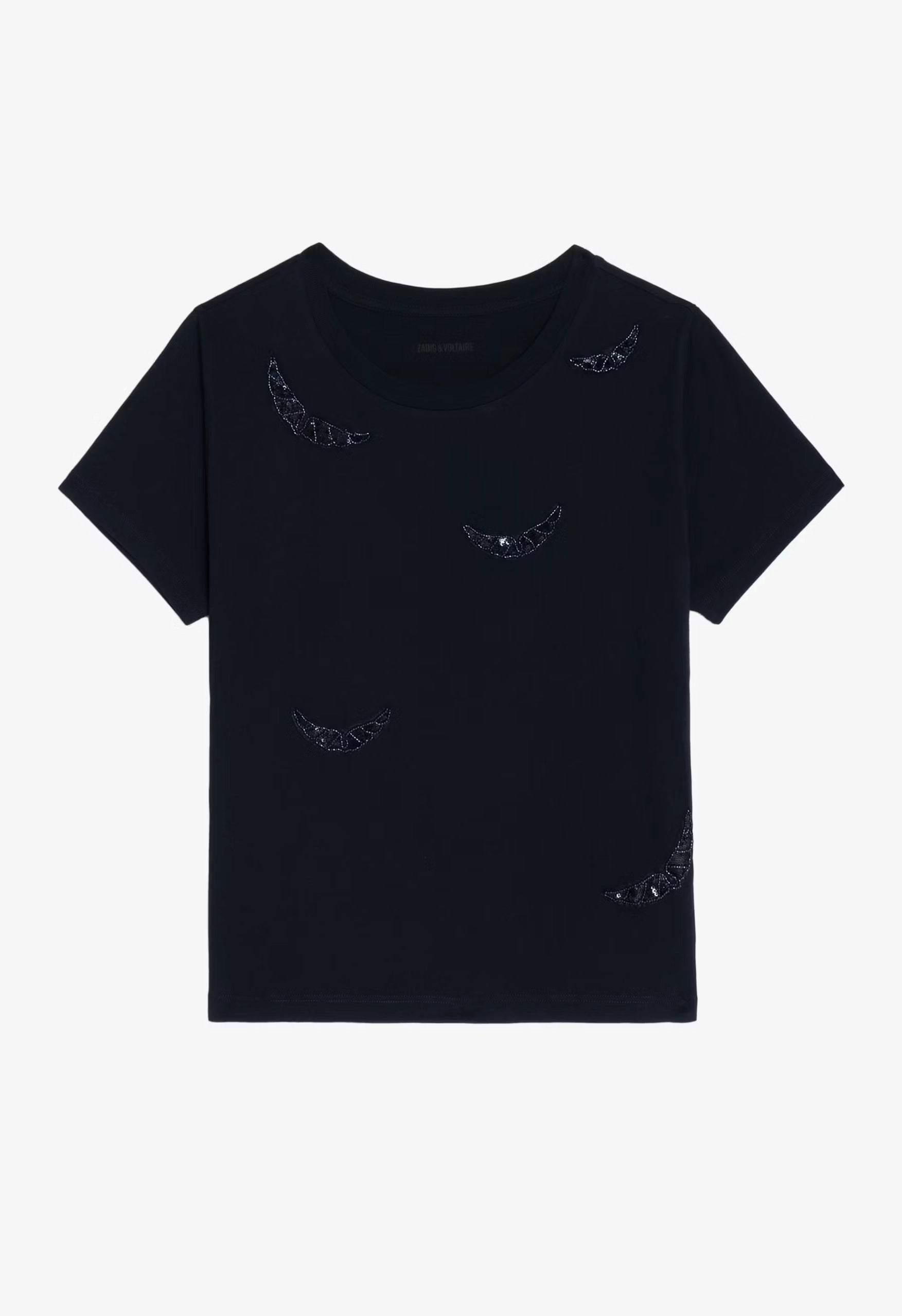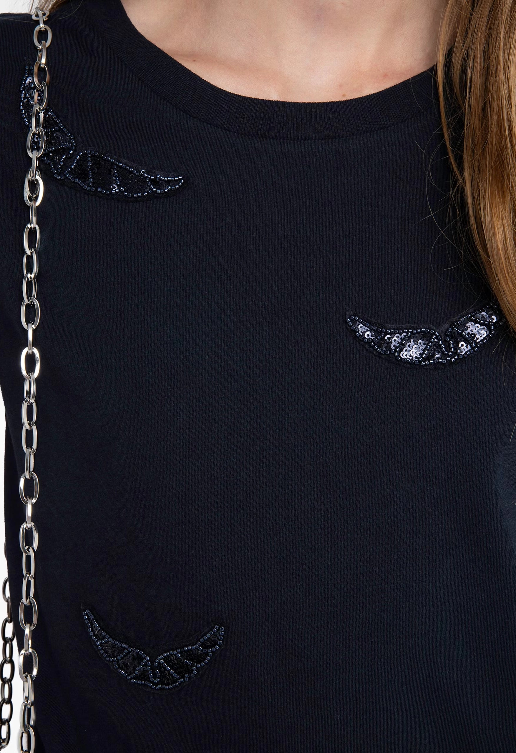 The Alys T-shirt features a classic round neck and short sleeves, enhanced with delicate wing embroidery for a subtle, stylish touch. This design combines comfort with a unique detail, making it an ideal choice for everyday wear.