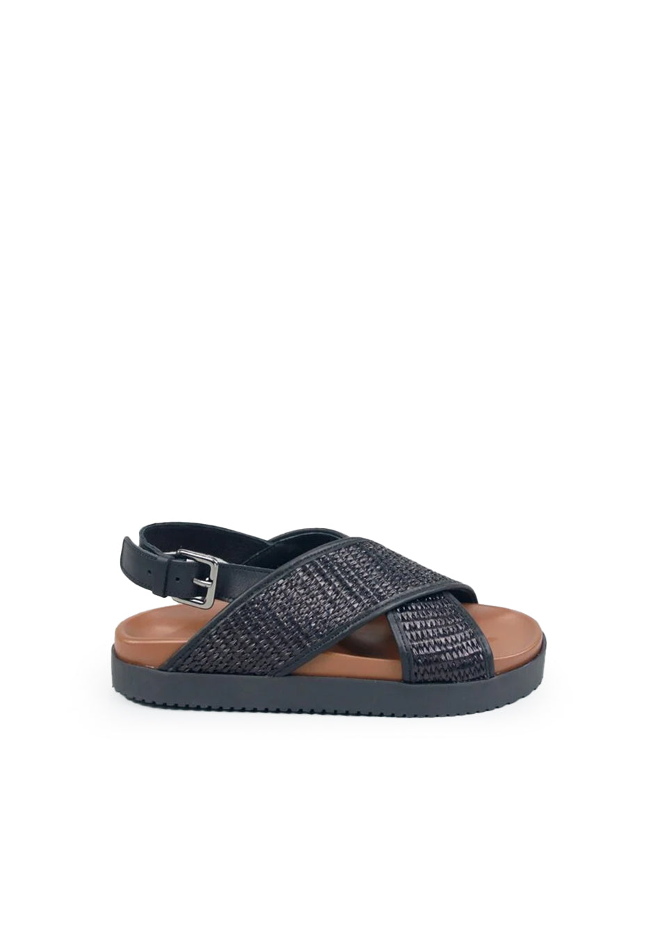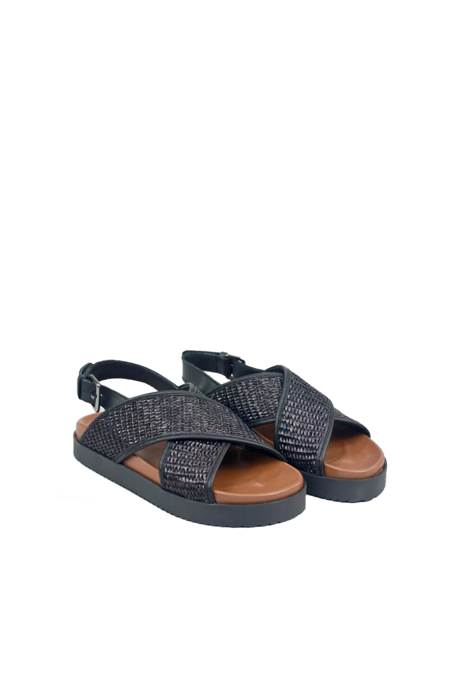 Stylish everyday sandals with woven raffia cross straps in tan or black with a buckled slingback strap and contoured footbed.