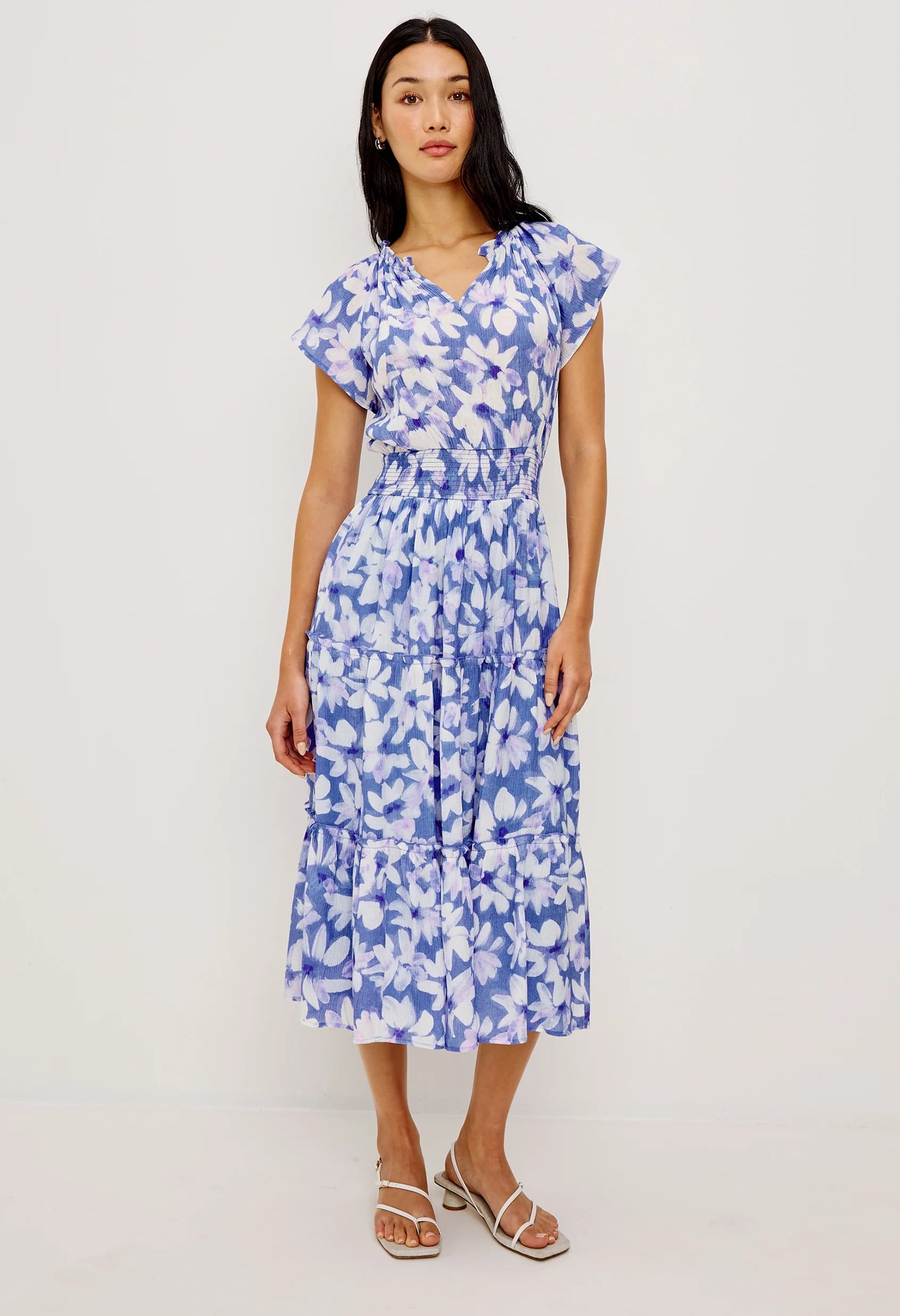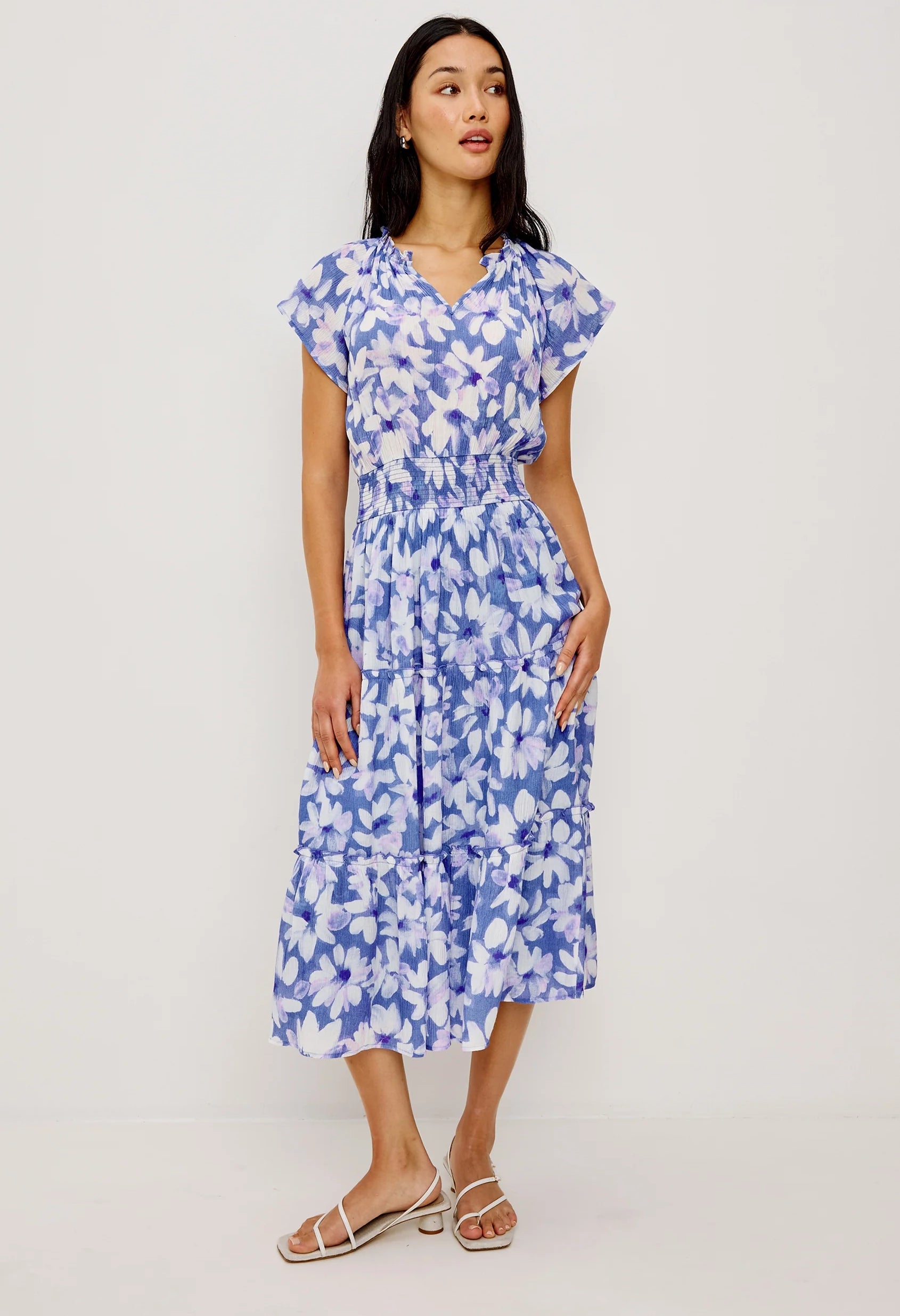 Channeling retro elegance, the Amellia Dress captures '70s glamour in sumptuous chiffon. This midi features a dramatic ruffled split V-neckline, delicate flutter sleeves, a fitted smocked waist, and a gracefully tiered A-line silhouette that moves with effortless sophistication.