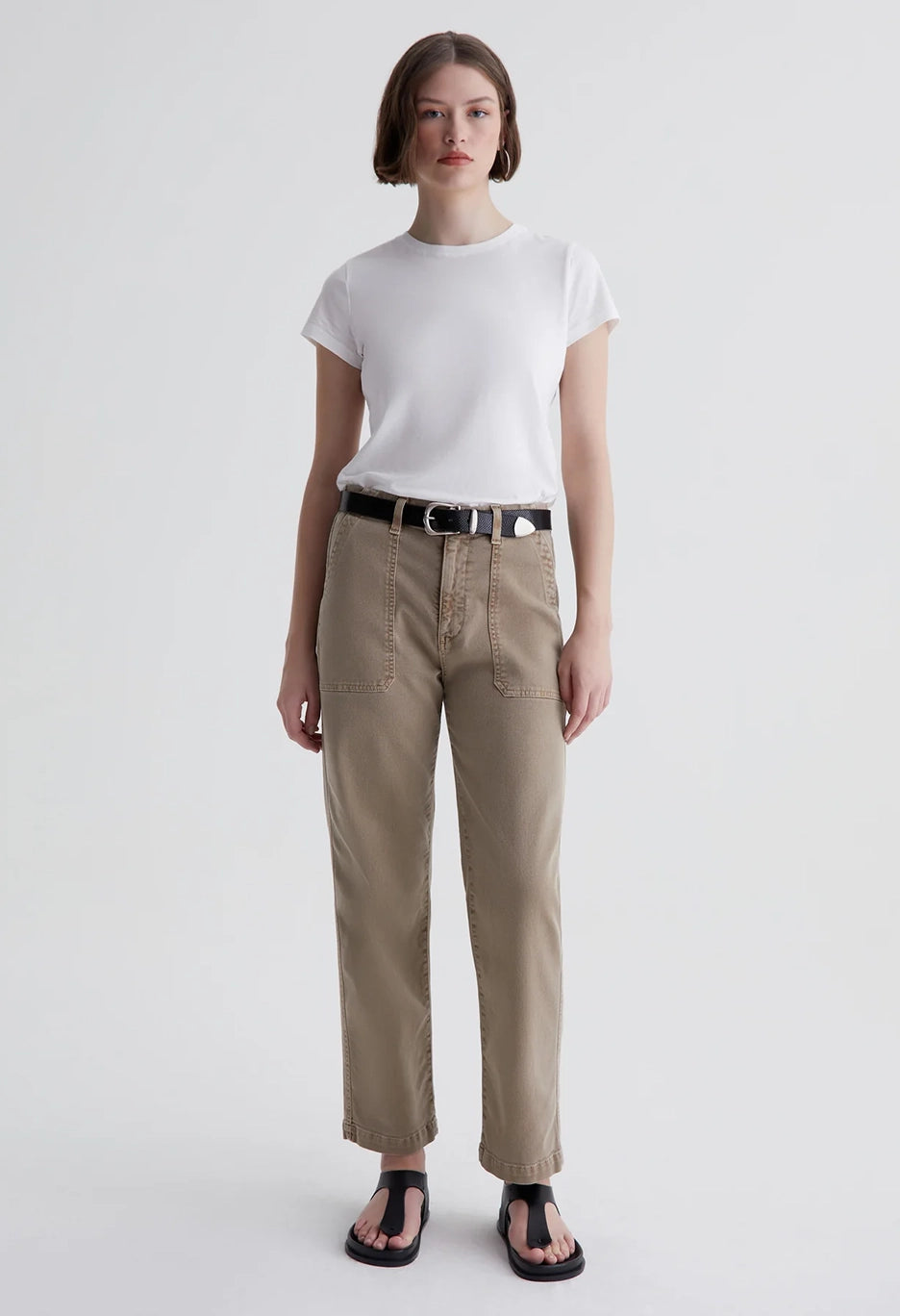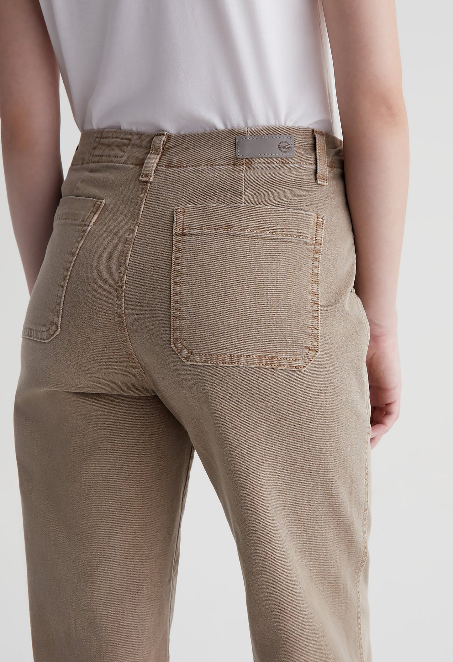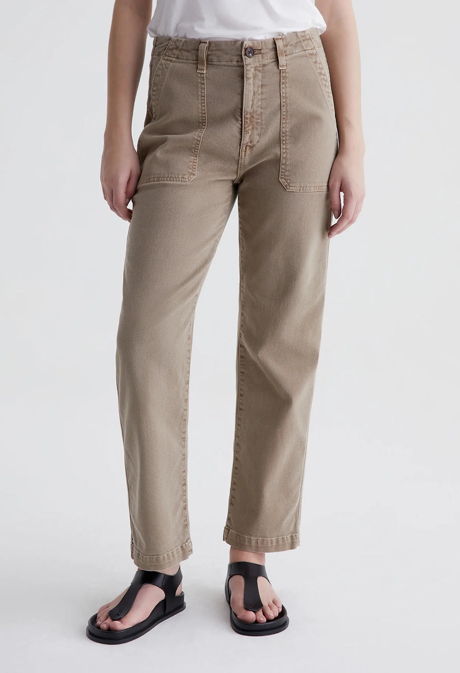 The Analeigh is the new high-rise straight crop in AG Cloud Soft Denim™ that's been sulfur-dyed for a faded khaki shade. This ankle-baring style sits high on the natural waist and features a straight-leg silhouette with workwear-inspired pockets. It's made from 8.7 oz. Hyper Soft Bull Denim, a left-hand twill fabric that allows the yarns to gently relax and untwist for a supple, velvety-soft feel. Designed for increased softness with every wear, the fabric has superstretch construction for ultimate comfort and enhanced recovery.