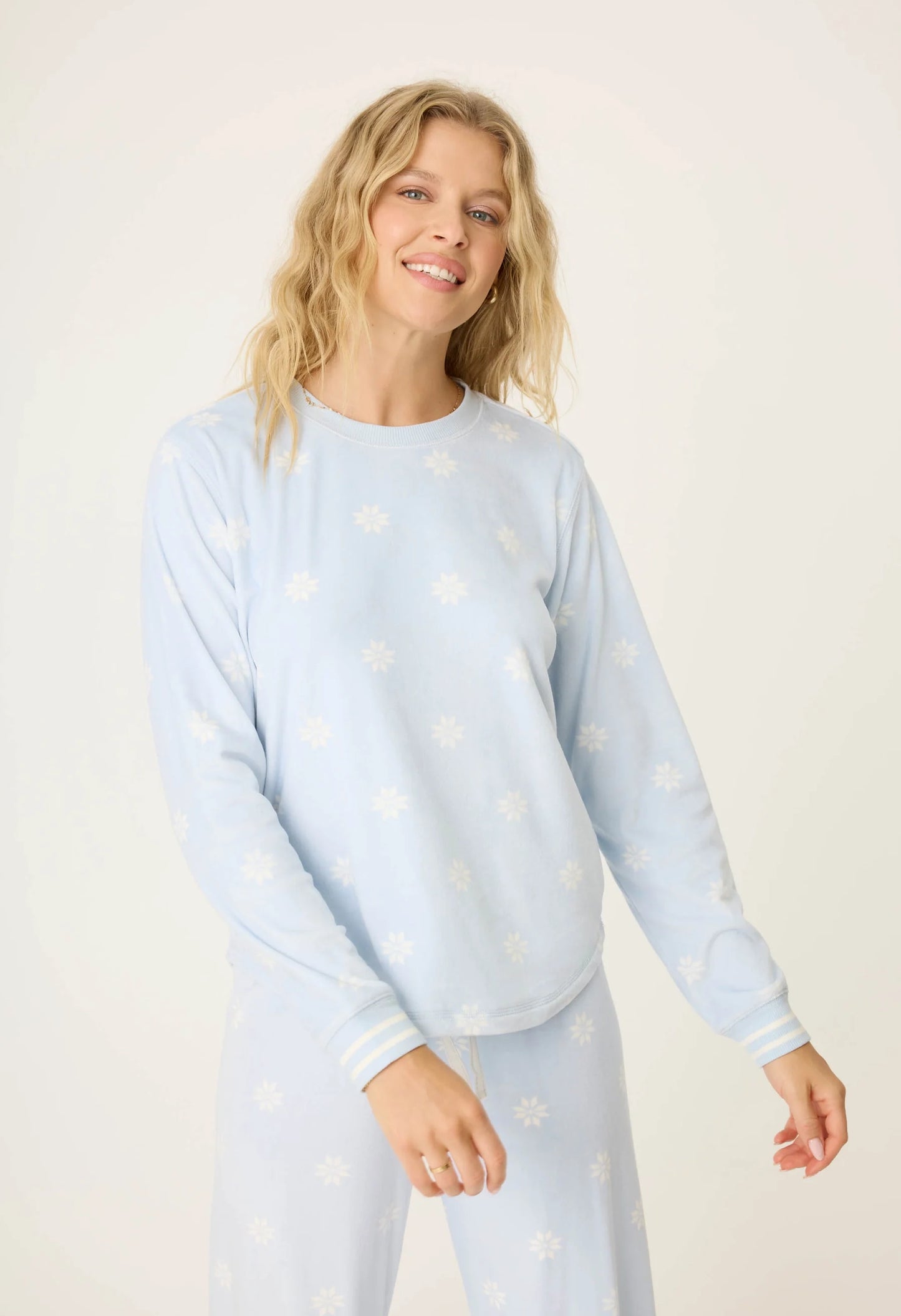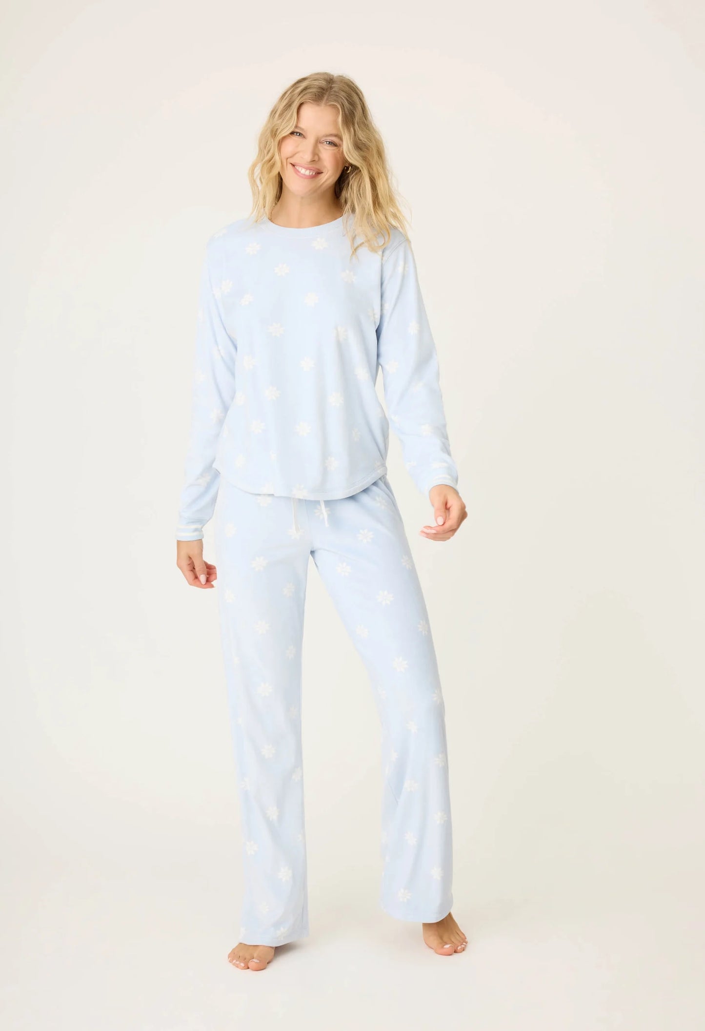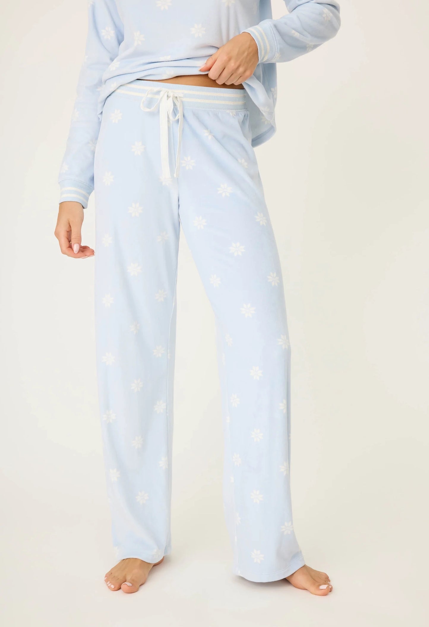 Experience the cozy comfort of winter with this soft velour pj set. Adorned with a charming white snowflake print on a soothing pale blue background, these pjs are perfect for lounging or sleeping. The tie waist allows for a customizable fit, ensuring both style and relaxation.