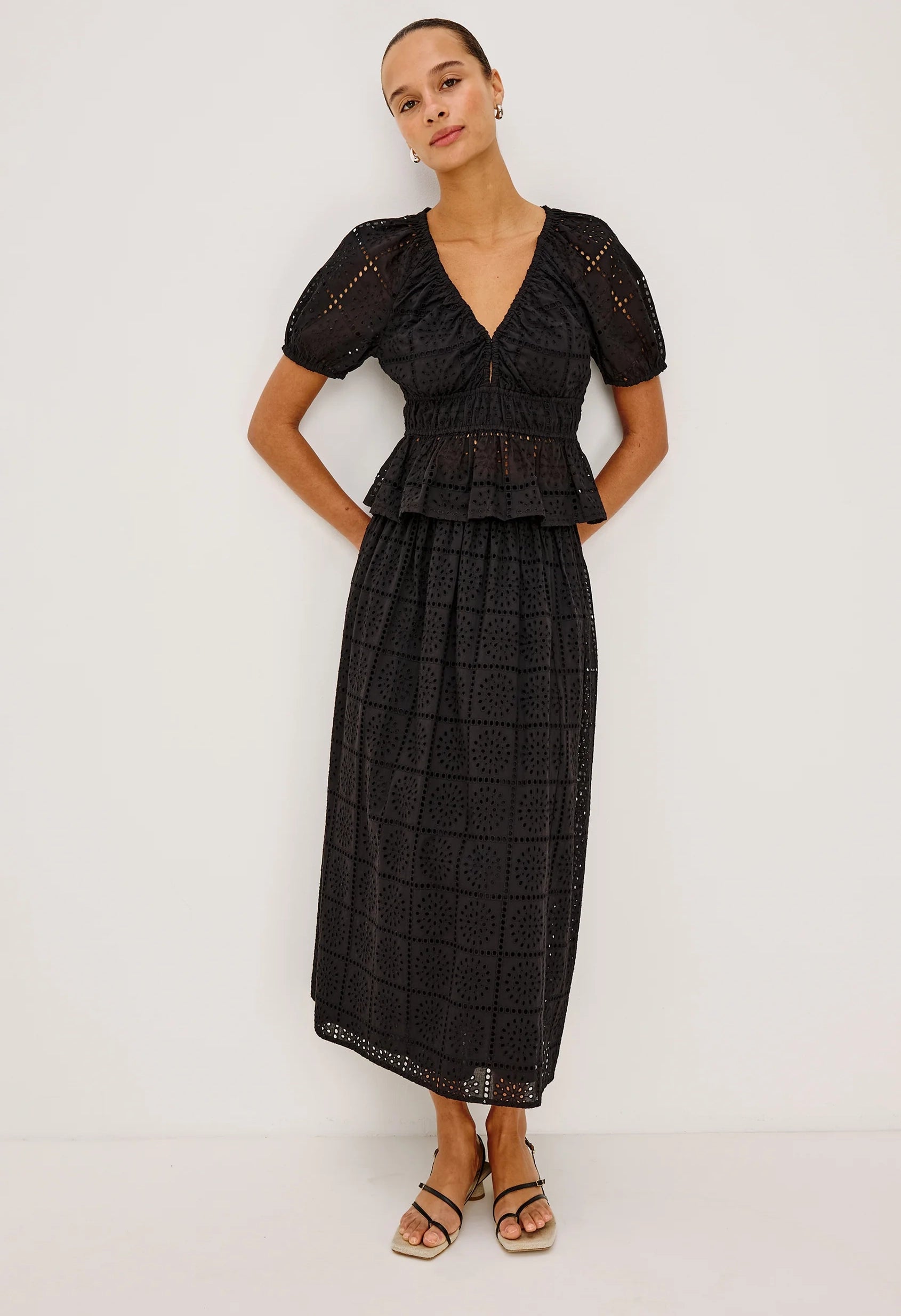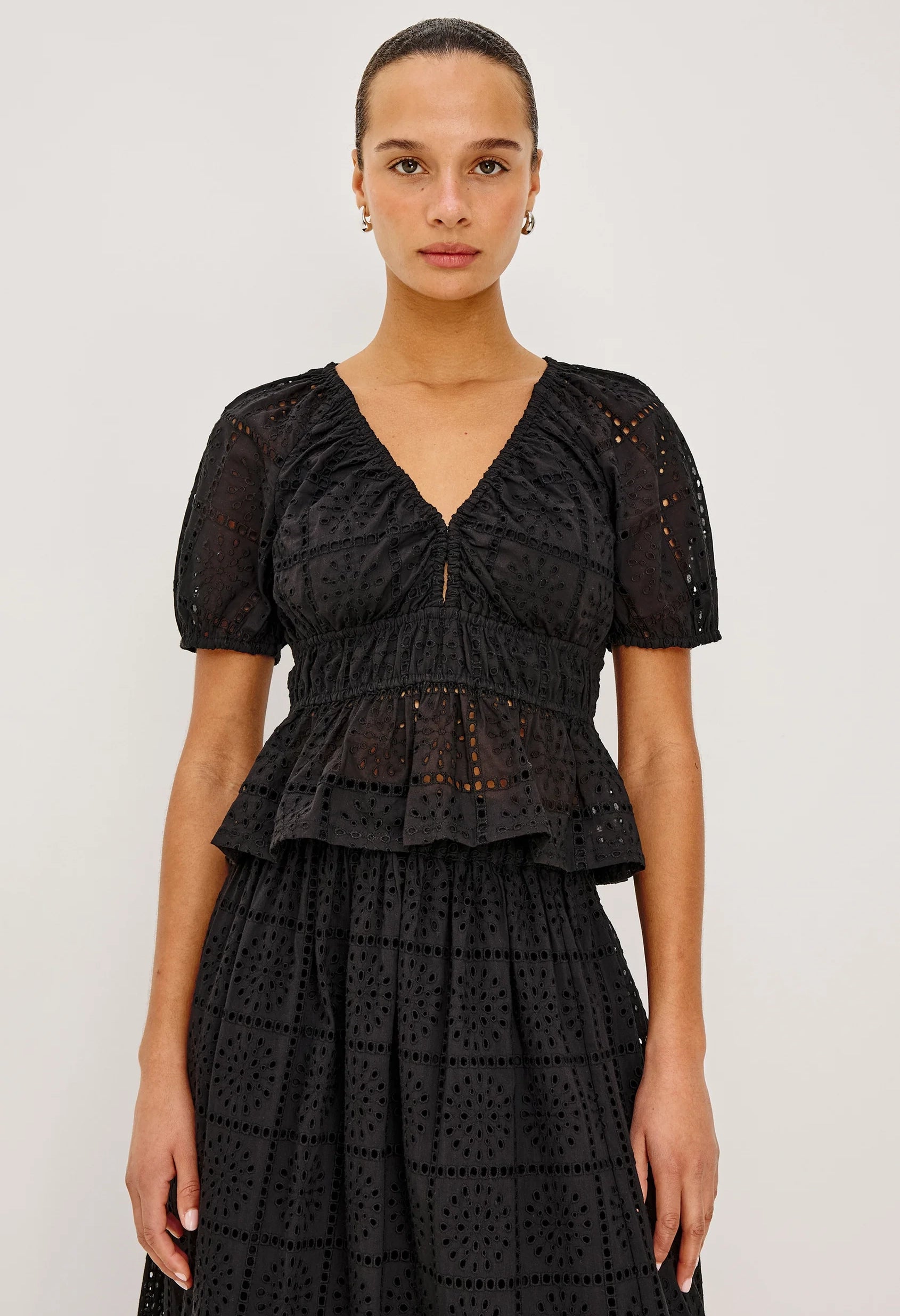 Discover effortless elegance with the Argenta Top, a charming cropped silhouette crafted from delicate broderie anglaise eyelet cotton. Designed with a flattering V-neckline and cinched waist, both finished with soft elastic trim, this piece features short raglan sleeves and a gently flared ruffle hem for a playful, feminine touch. Perfect for layering or wearing solo, the Argenta brings timeless sophistication to any warm-weather wardrobe.