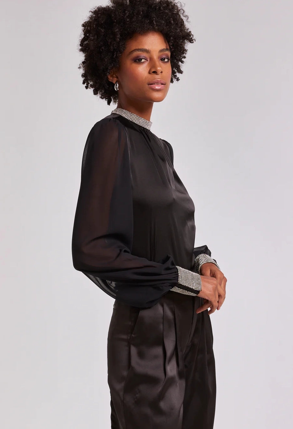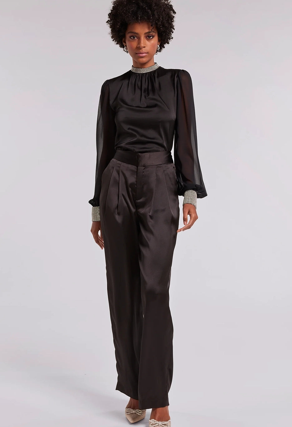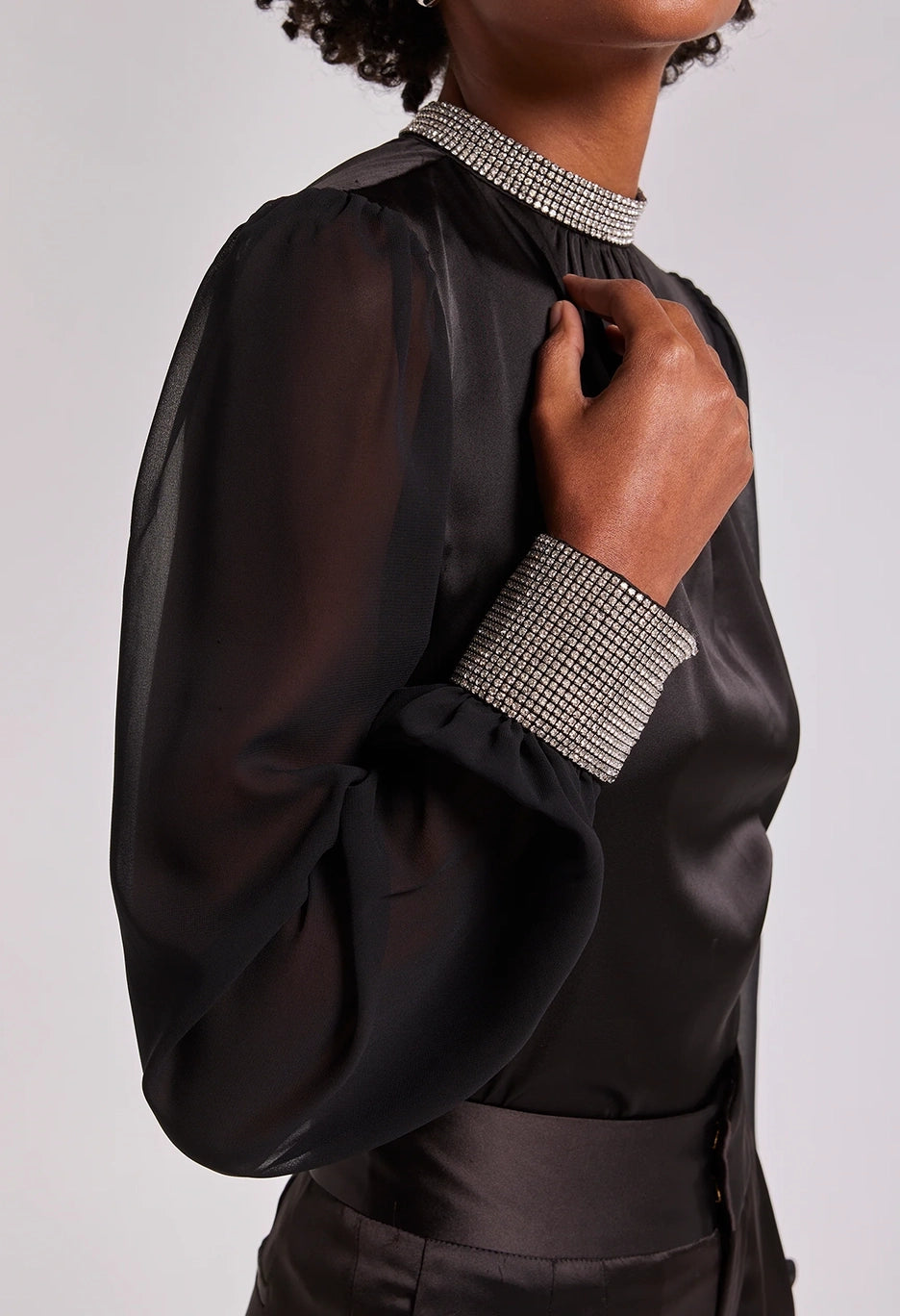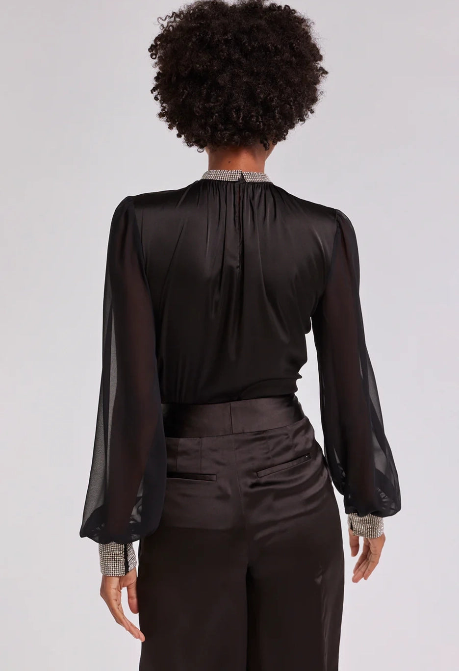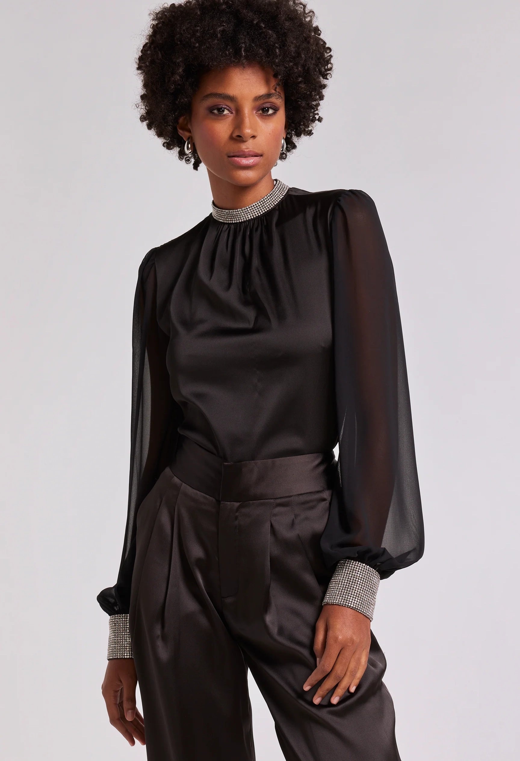 Show off your sheer side in the Ashley. With soft satin and billowy sheer balloon sleeves, this statement blouse will bring an ethereal touch to any look. Pair with a silky skirt and heels for dinner and drinks out on the town.
