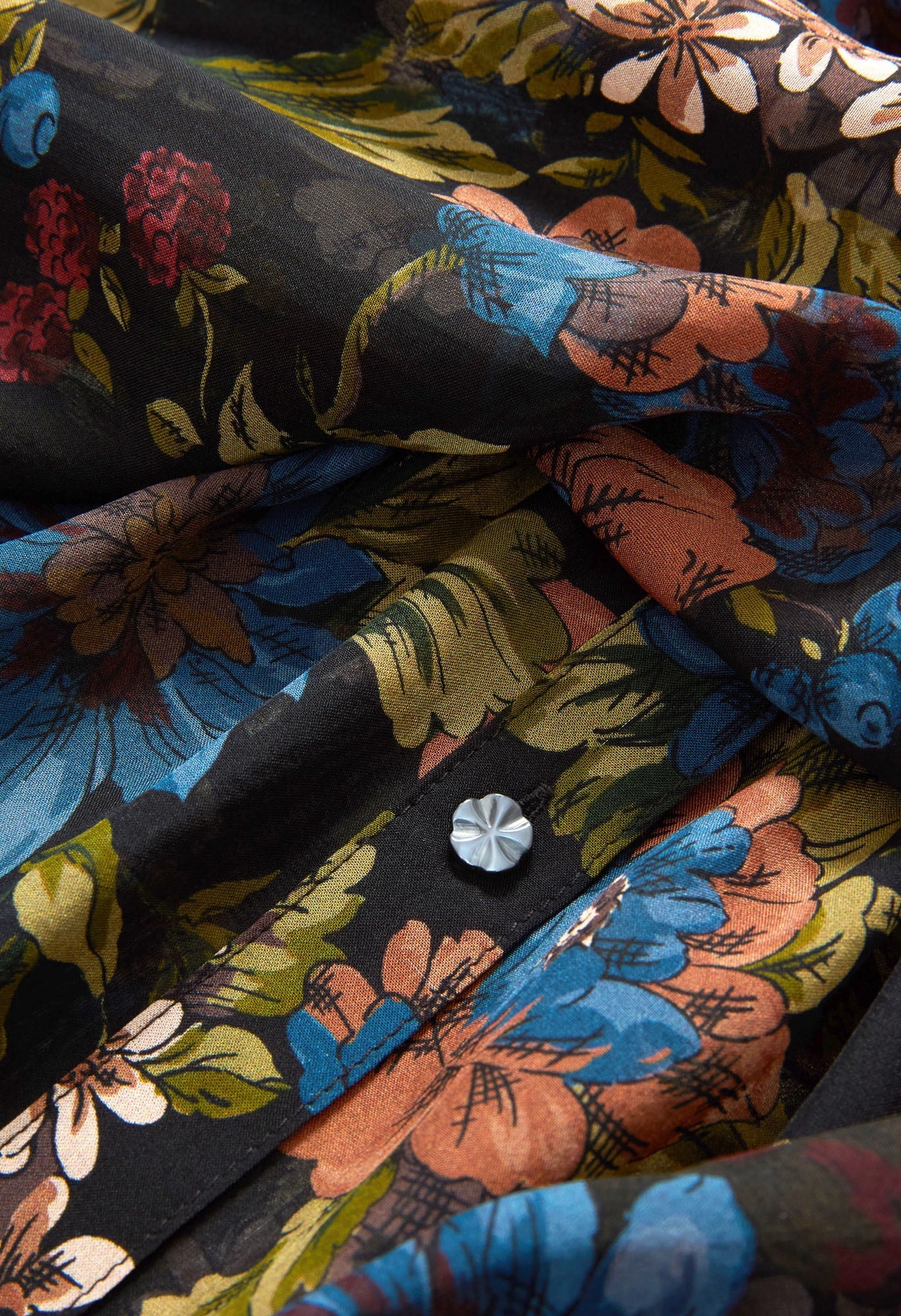 The Ashlynn blouse is a timeless silk top with a warm floral pattern. It features soft ruching, airy sleeves, and mother-of-pearl buttons. Perfect for year-round wear, it pairs well with jeans, trousers, or skirts.