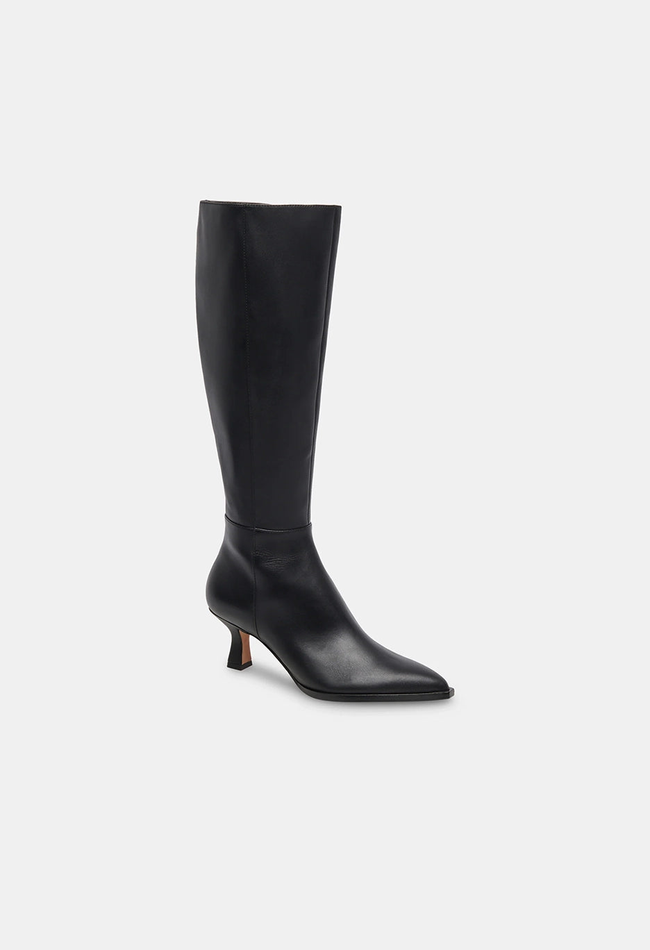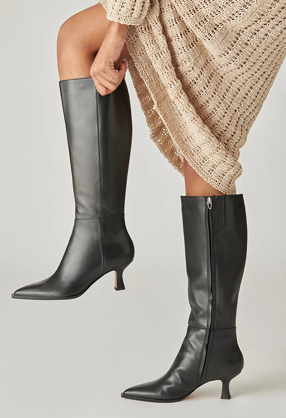 We'll get right to the point: AUGGIE's sleek and sophisticated point-toe silhouette makes her the style you need this fall. We'll be pairing this luxe knee-high boot with pleated midi skirts and even mini dresses this season.