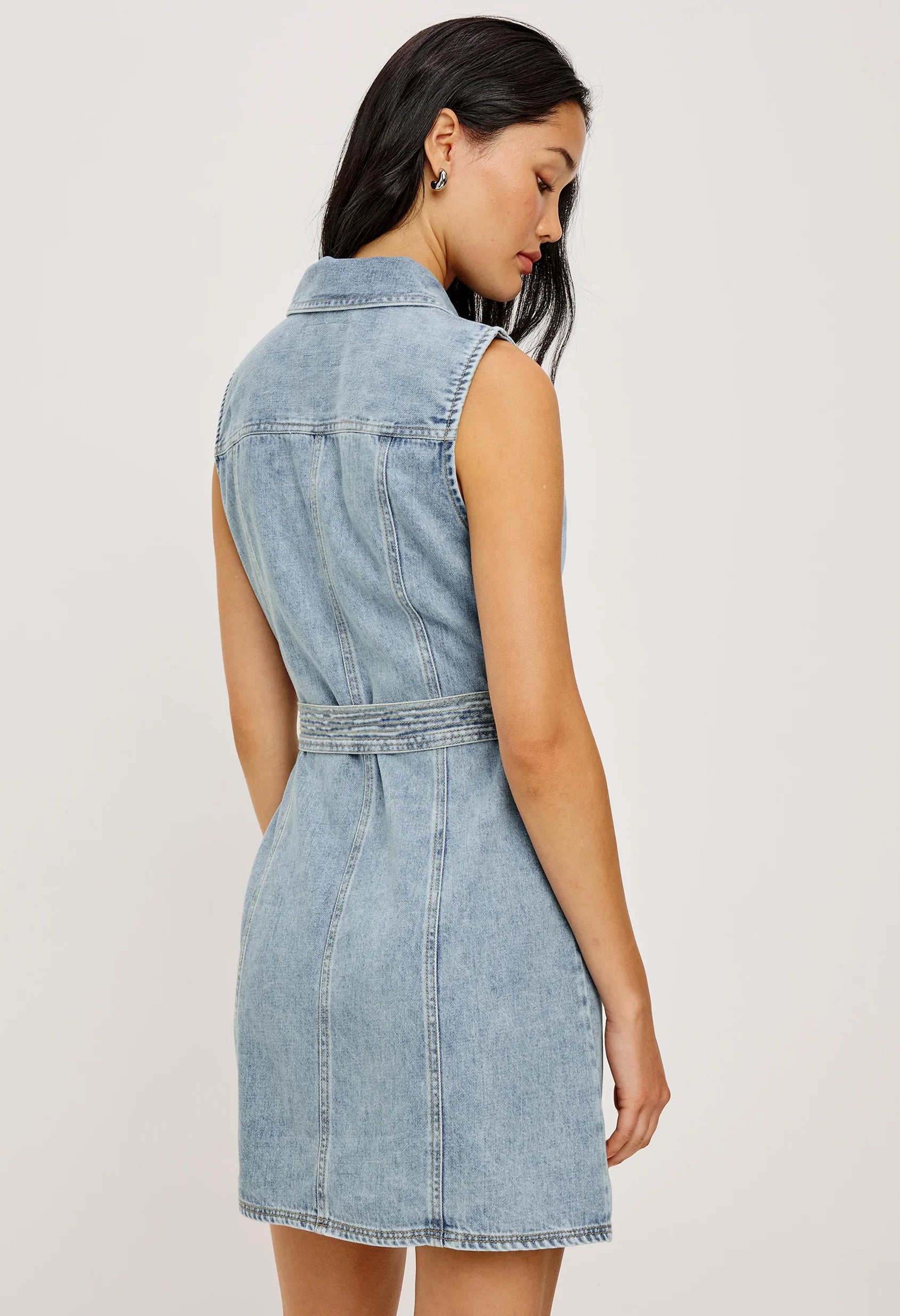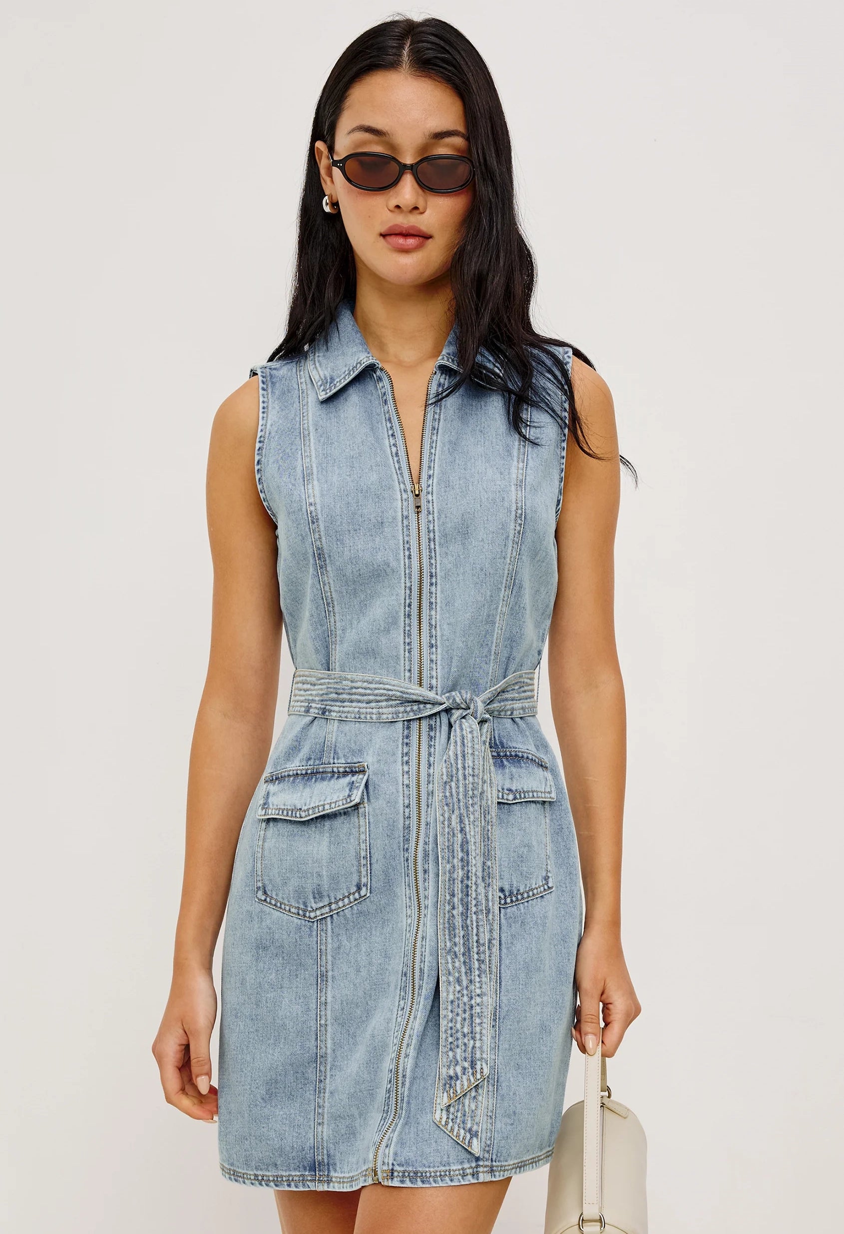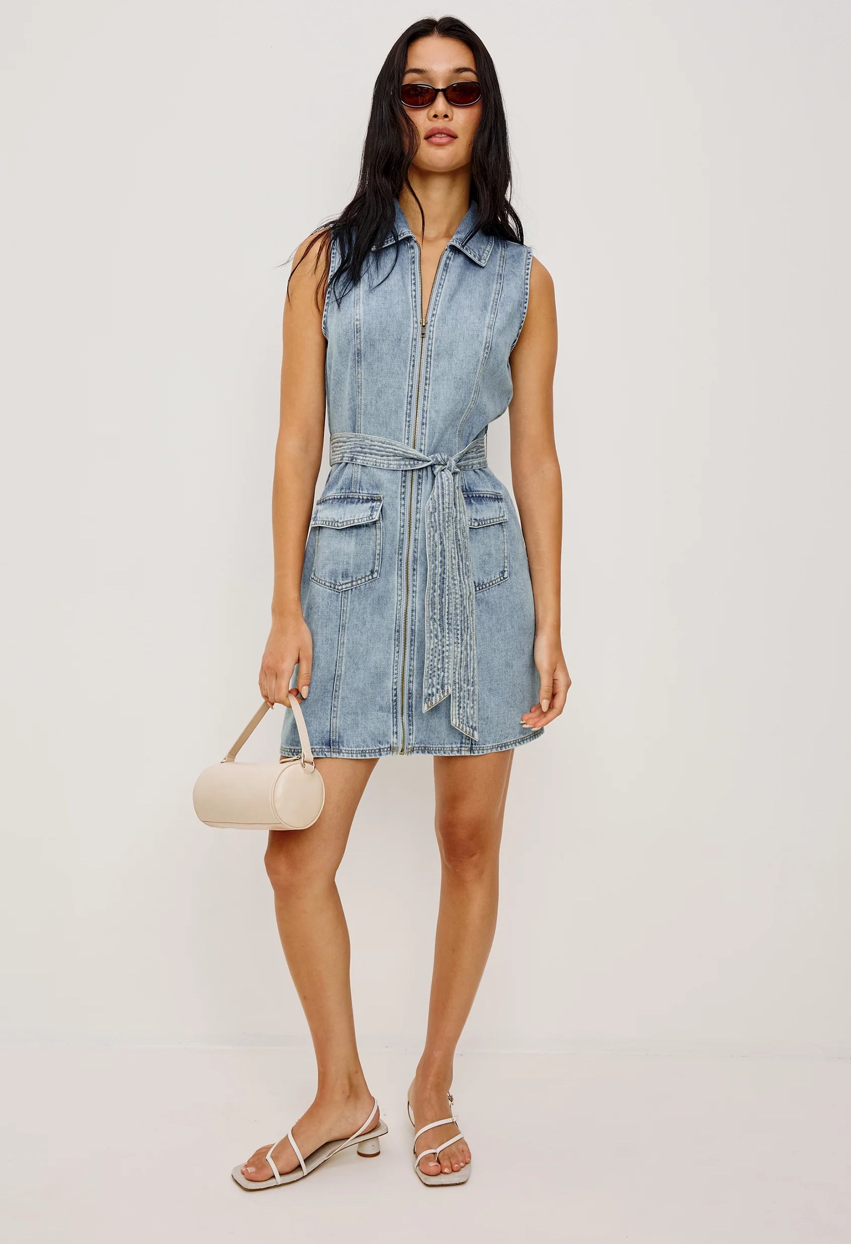 Introducing the Aurora—a luxuriously soft TENCEL denim mini dress designed for effortless style. Featuring a timeless collar, full-length exposed zipper, refined front seam details, functional flap pockets, and an adjustable tie belt for a customized fit. The perfect blend of comfort and contemporary design.