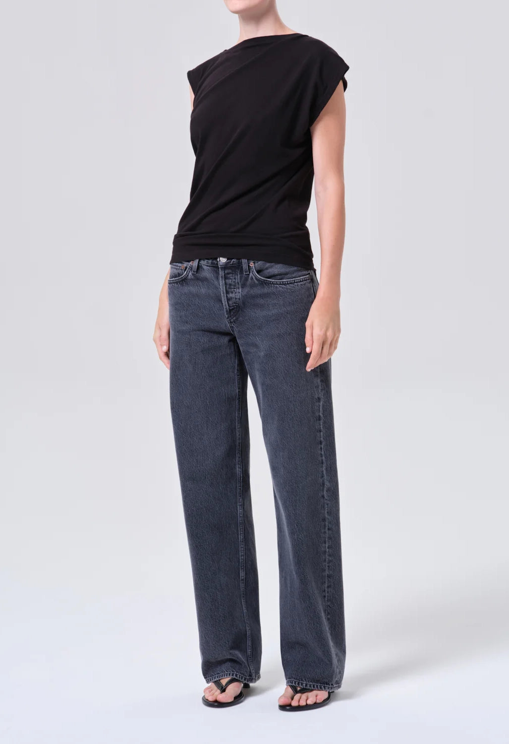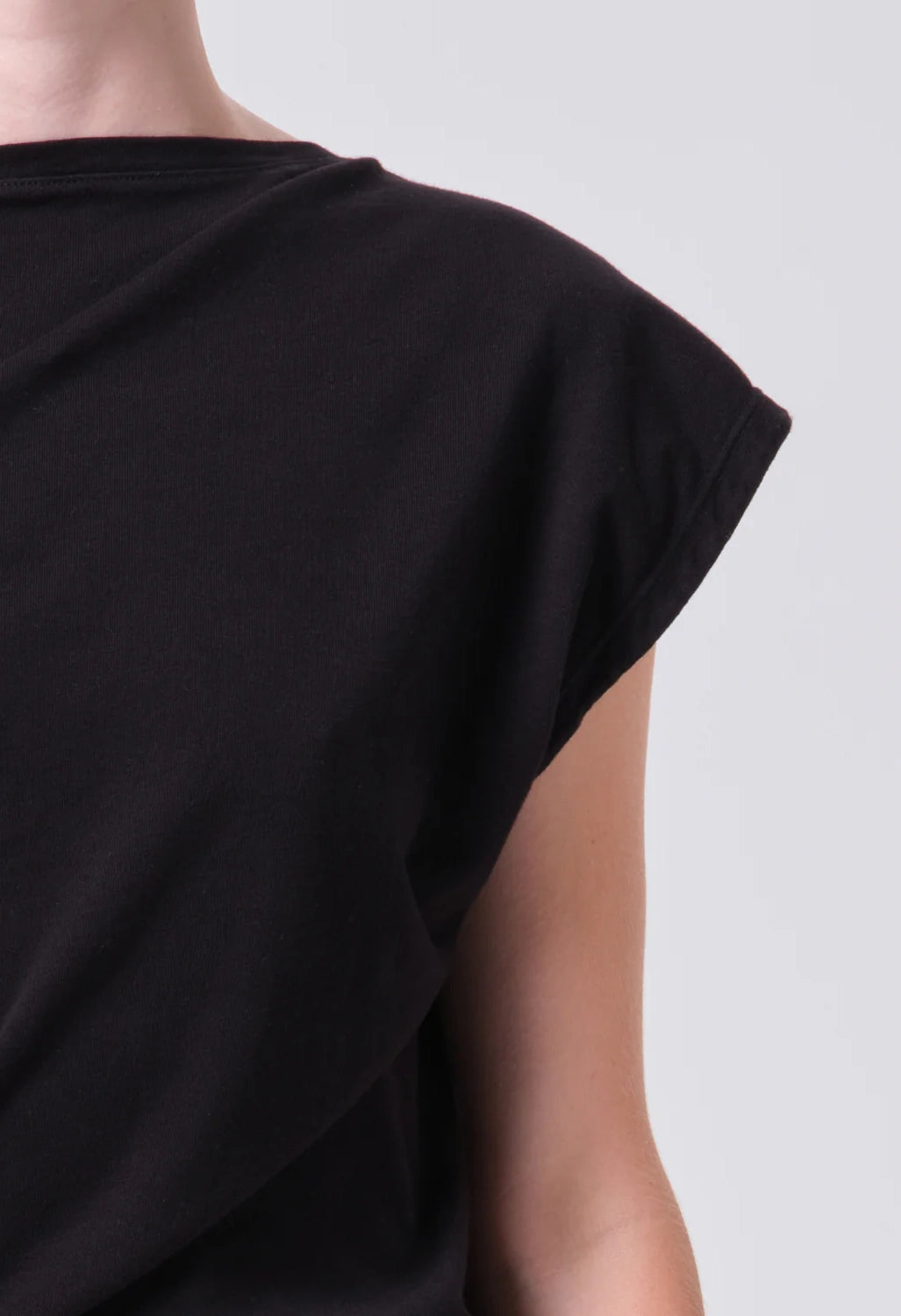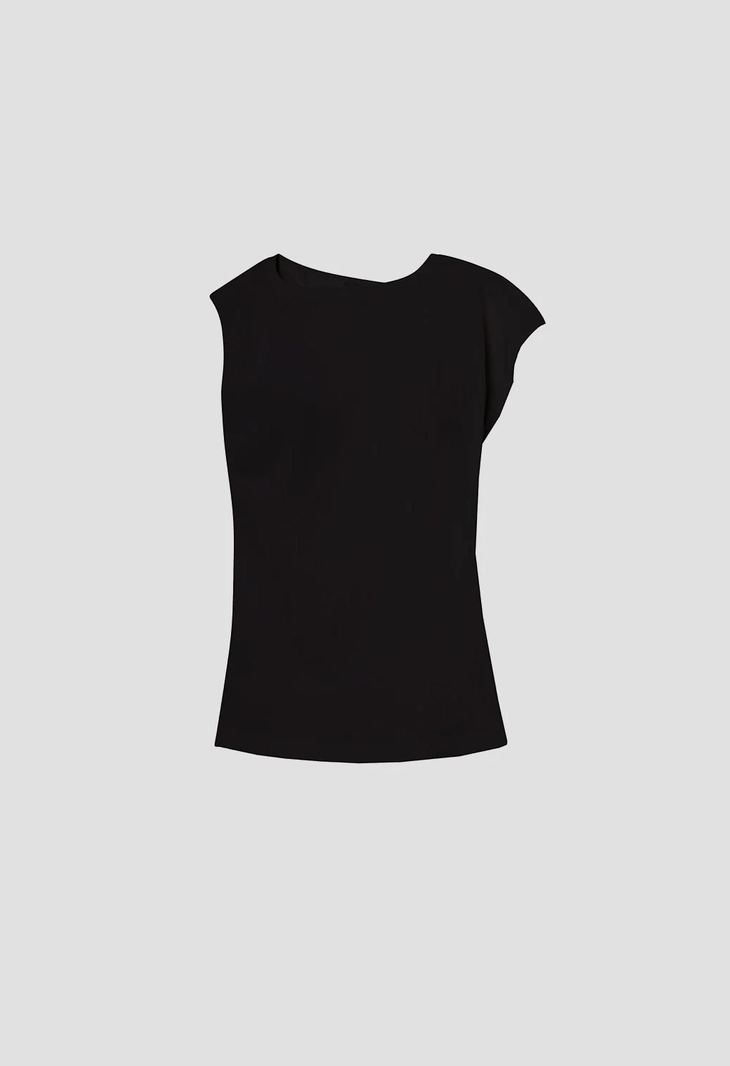 A refined black tee with an asymmetrical neckline and cap sleeves, made from soft organic cotton. Perfect for pairing with high-rise bottoms.