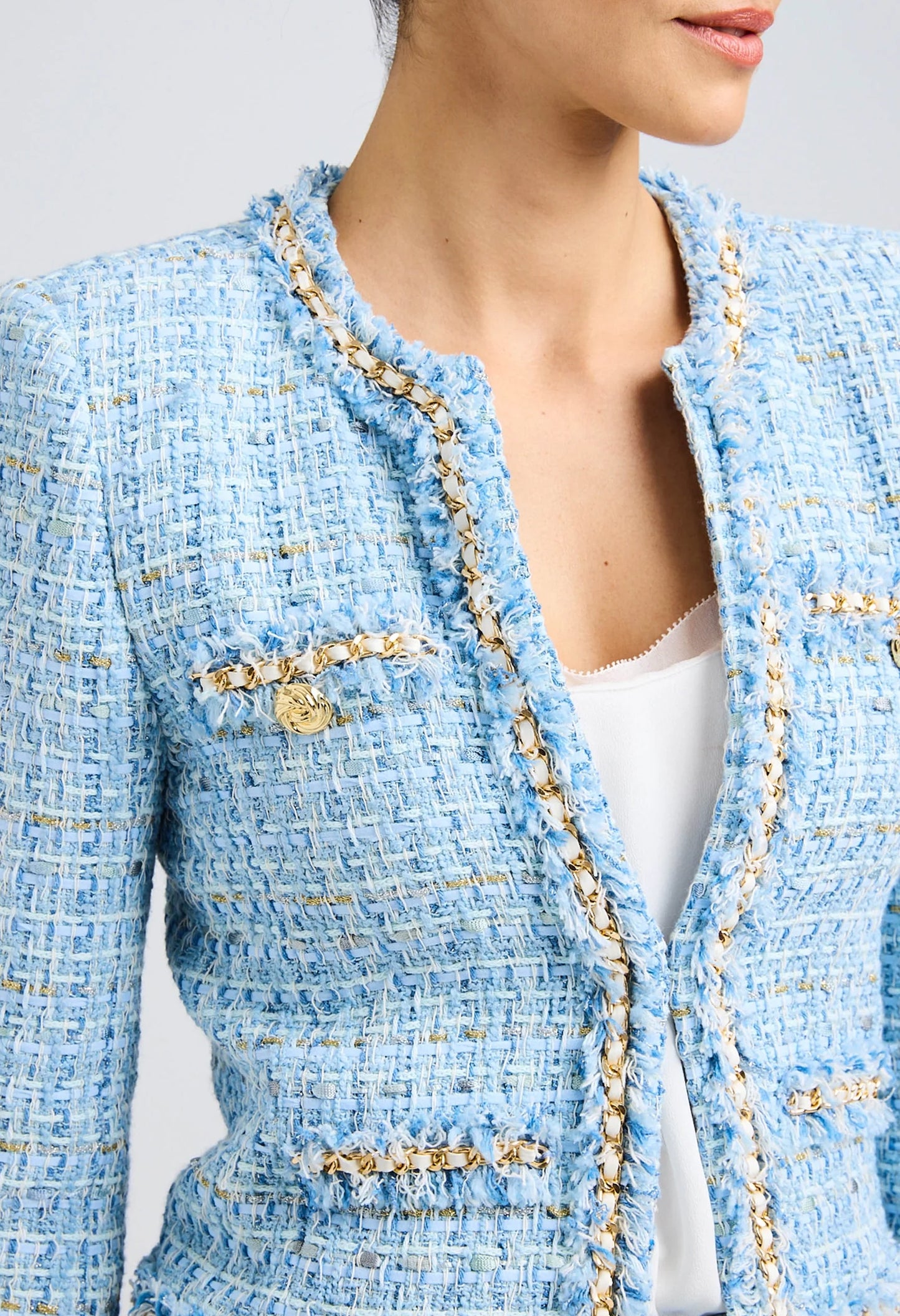 This blazer has a collarless design and incorporates a subtle touch of shimmer with its chain embellishment and frayed accents. It provides a contemporary take on the traditional style and is a great option for a sophisticated appearance. Easily matched with jeans and a cami or dressed up with a skirt, this blazer is made with recycled Italian fabric for a sustainable choice.