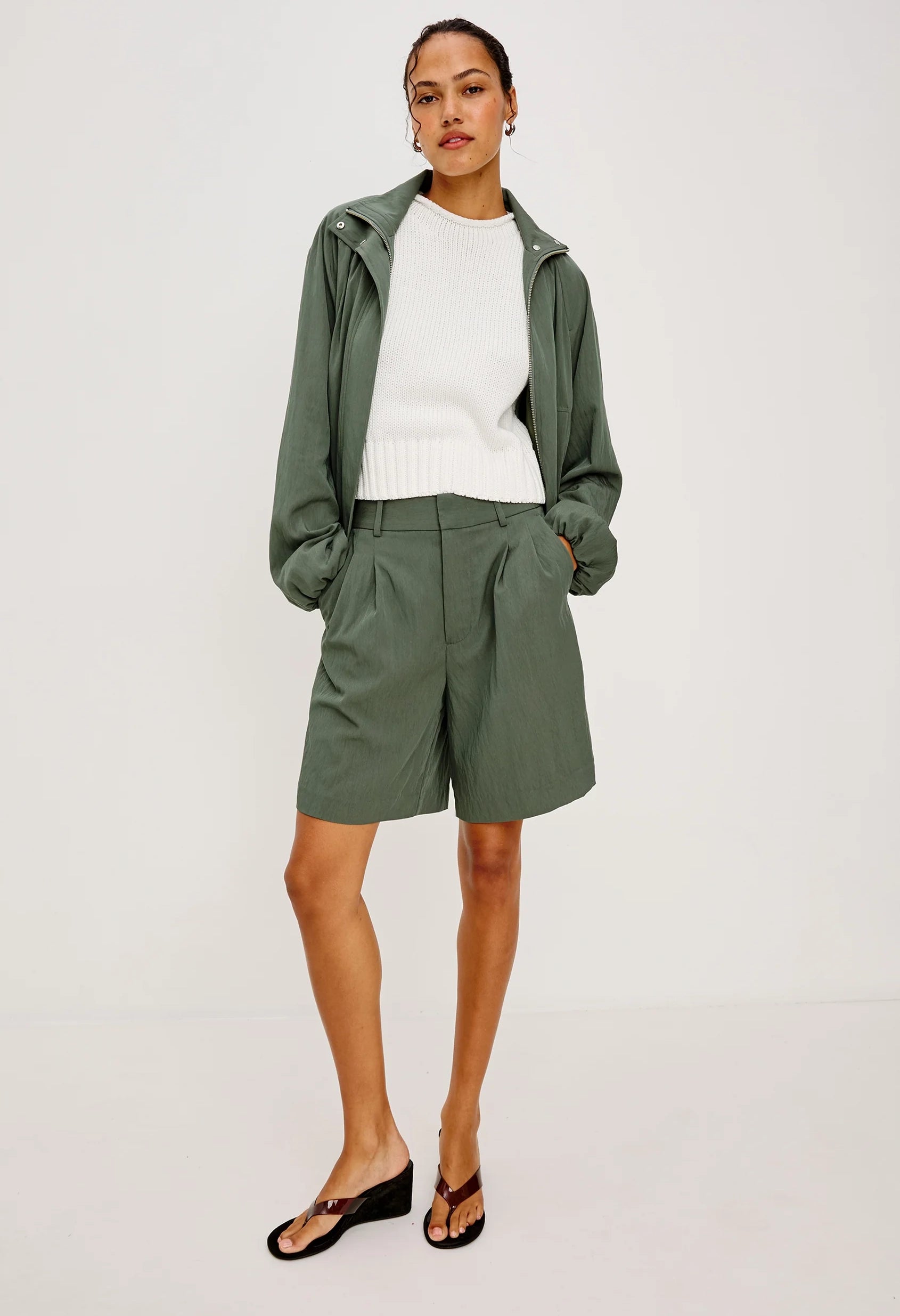Softly draped, perfectly shaped. The Blake Jacket has a relaxed, oversized fit with a high funnel neck and double-button closures, long dropped-shoulder sleeves with elastic cuffs, and a cropped drawstring hem.