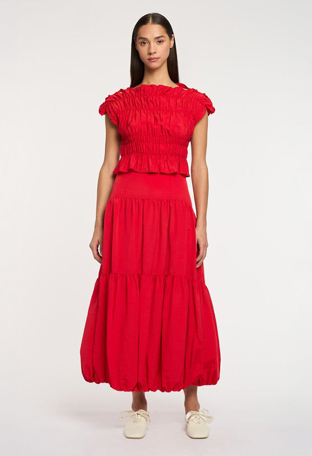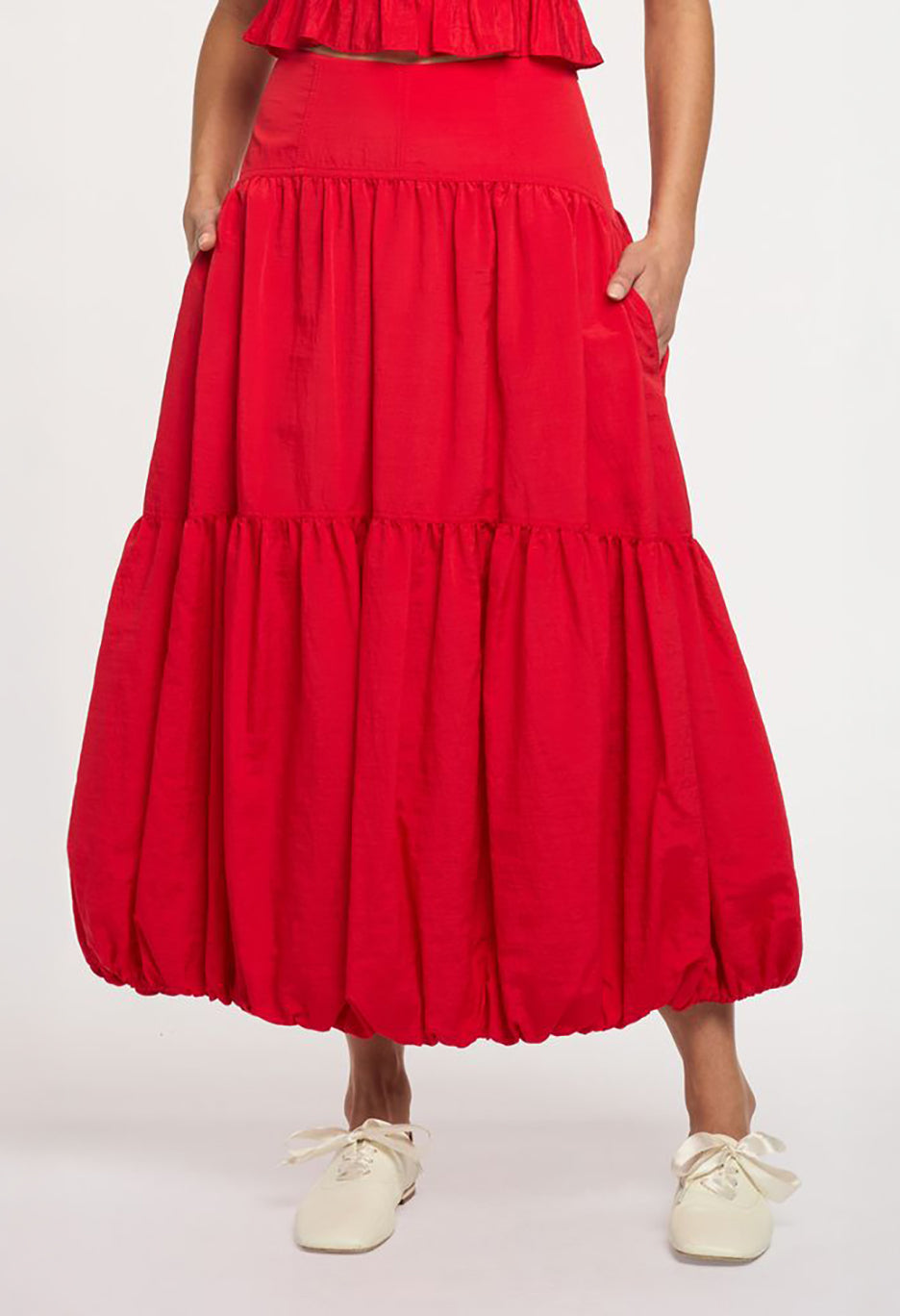 The Cinq à Sept Blythe skirt brings effortless elegance to your wardrobe with its thoughtfully tiered construction. The full midi length moves beautifully with every step, while the distinctive bubble hem adds a playful touch of sophistication.