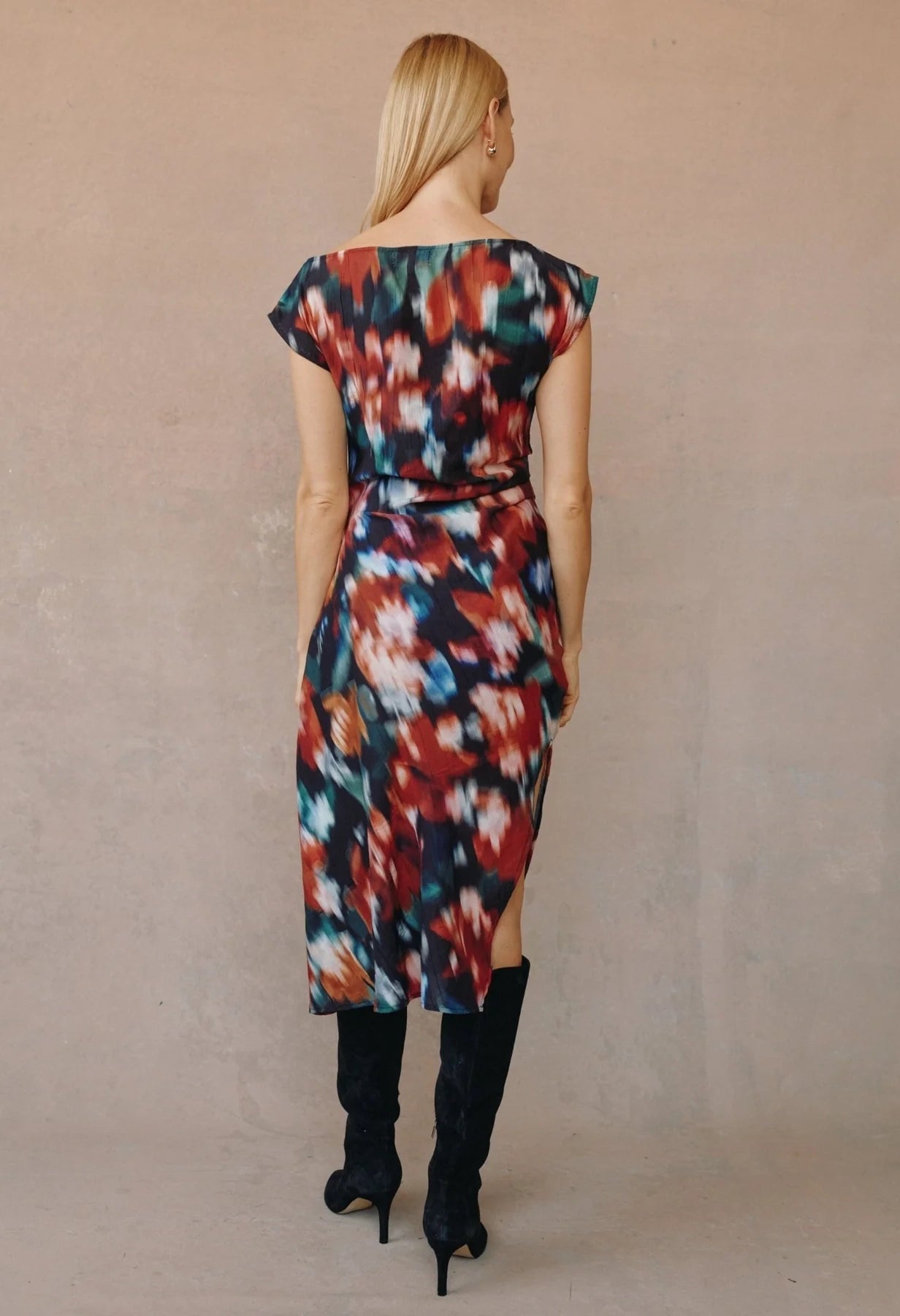 The Boat Neck Cap Sleeve Midi Dress combines feminine elegance with effortless style, perfect for transitioning from late summer into fall. Its boat neckline and cap sleeves gently frame the shoulders, while the elastic cinched waist ensures a flattering silhouette and comfortable wear. The asymmetric hemline and side slit add graceful movement to the classic midi length. Featuring a blurred floral print, this dress offers a subtle, moody take on seasonal florals, making it a versatile addition to your wardrobe.