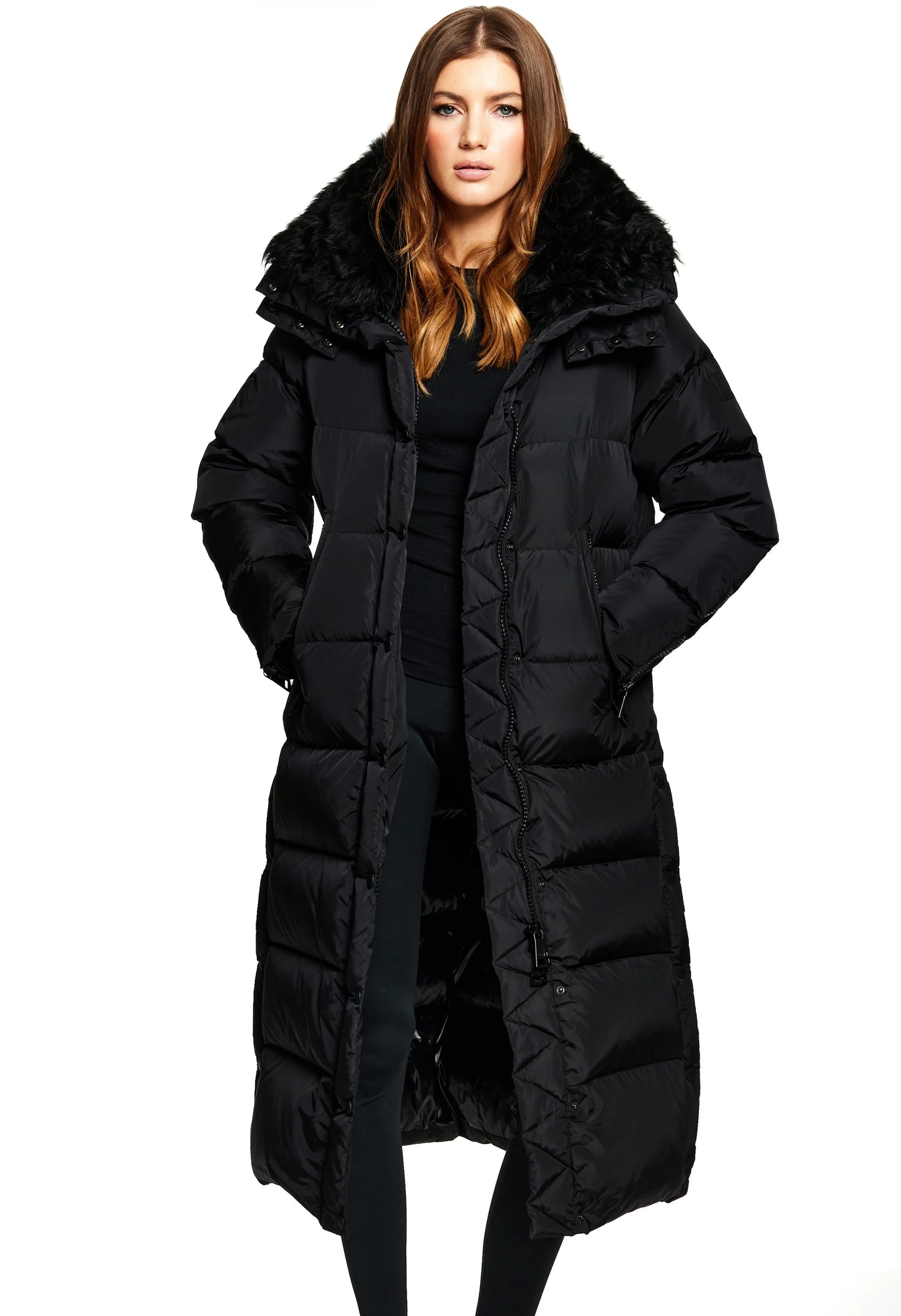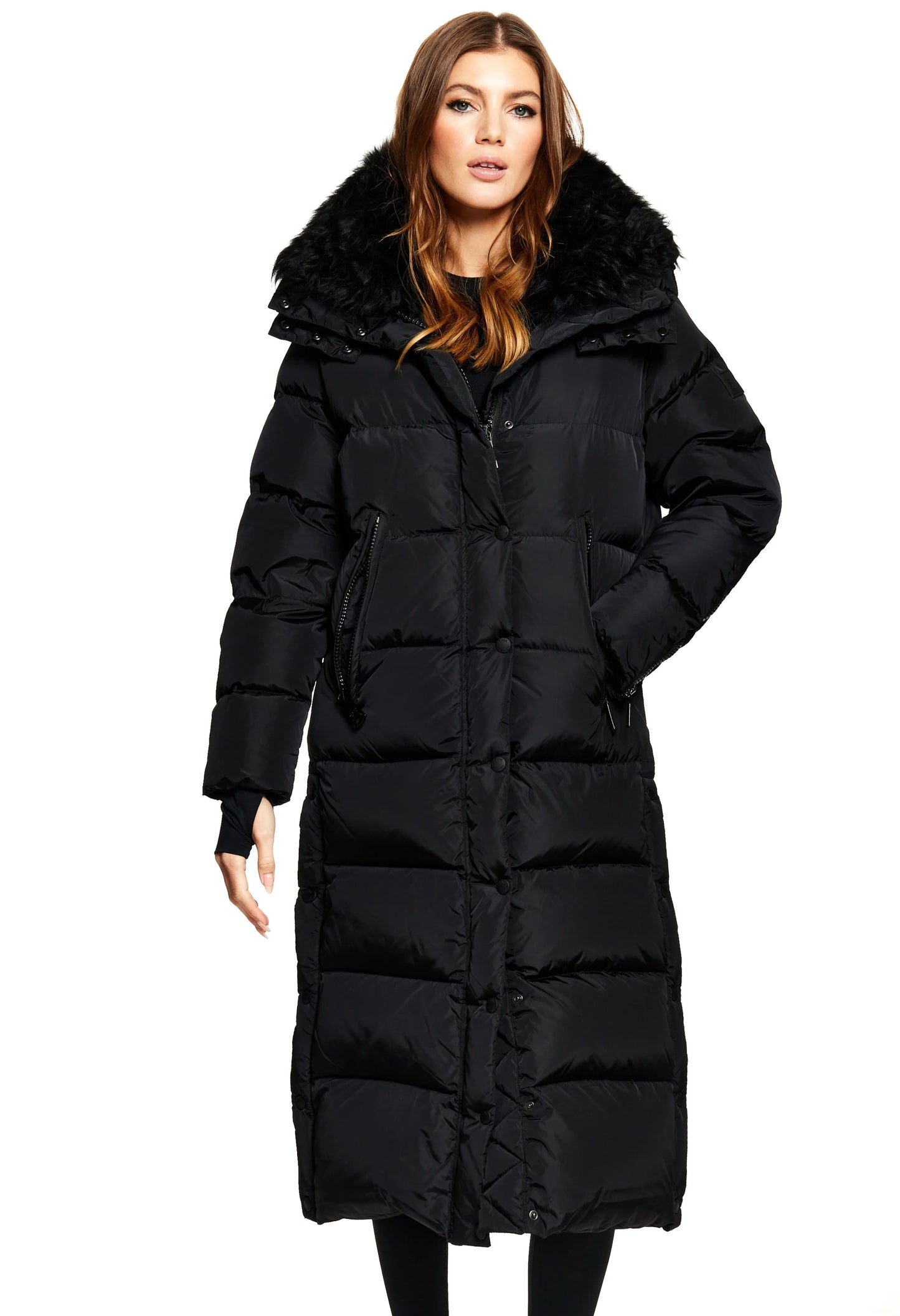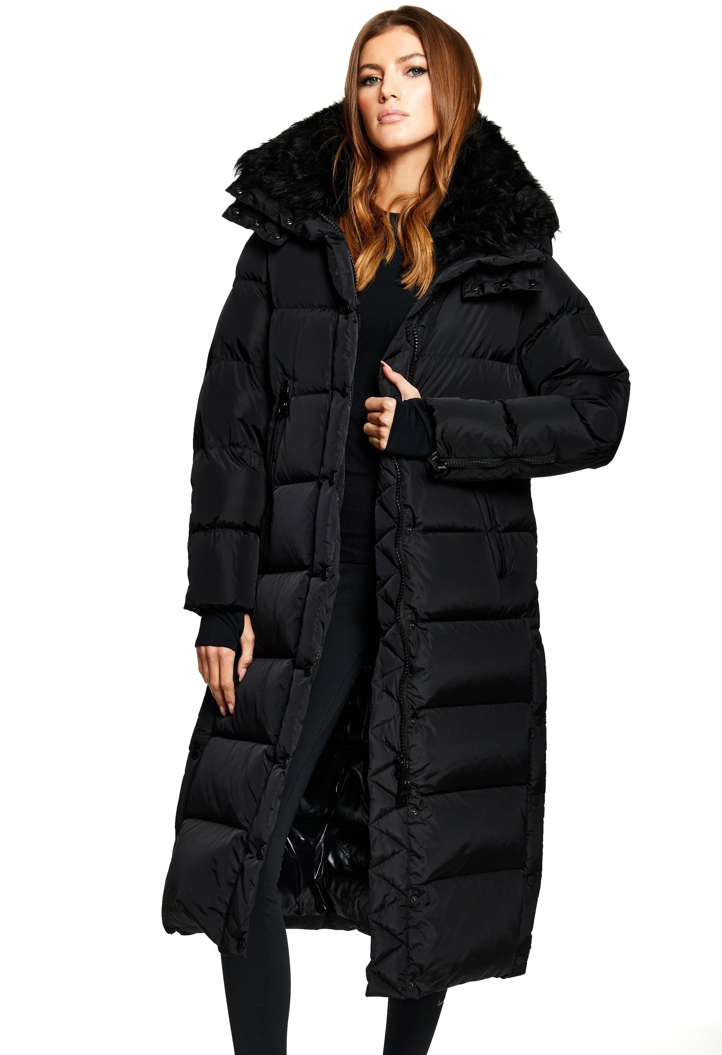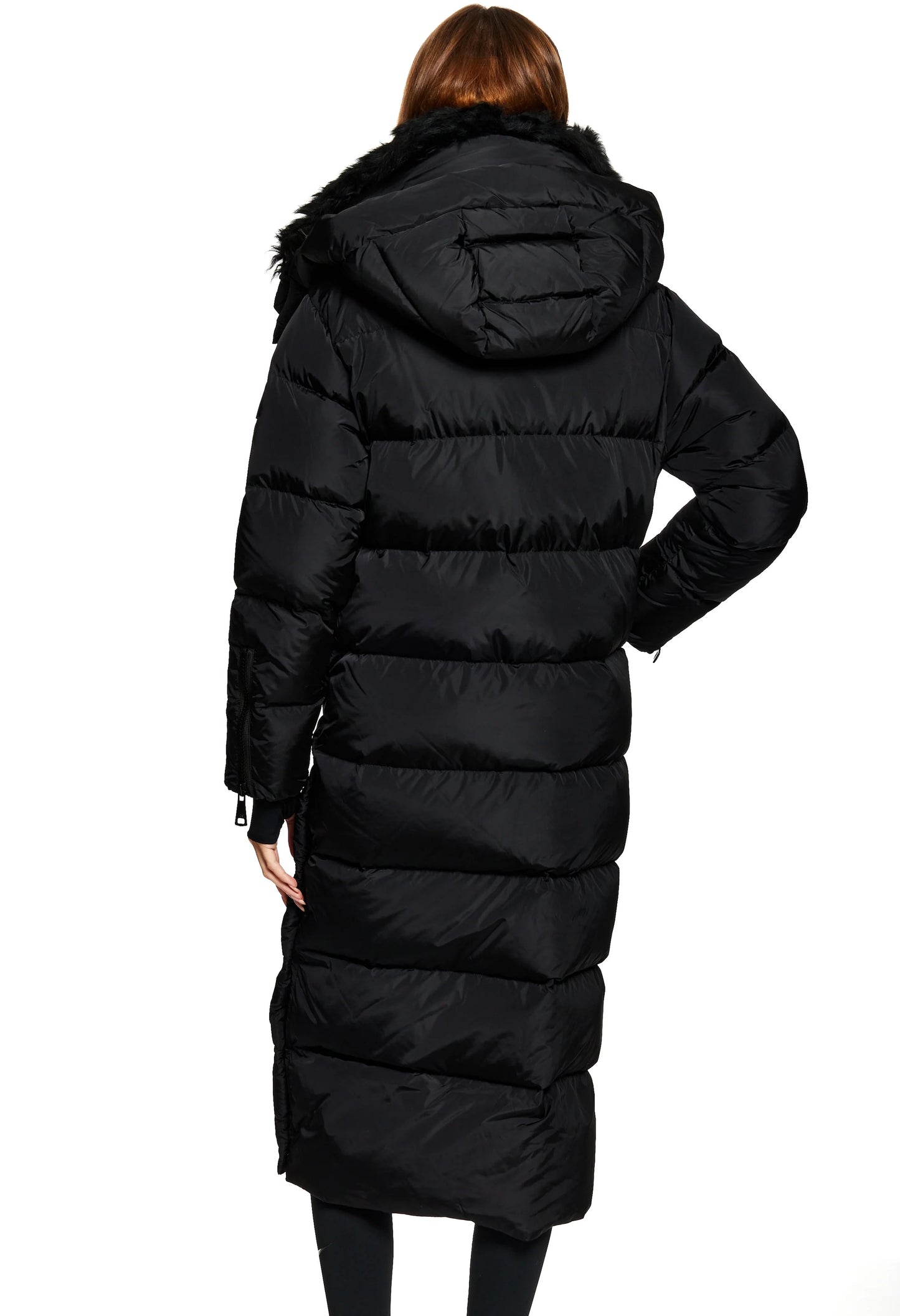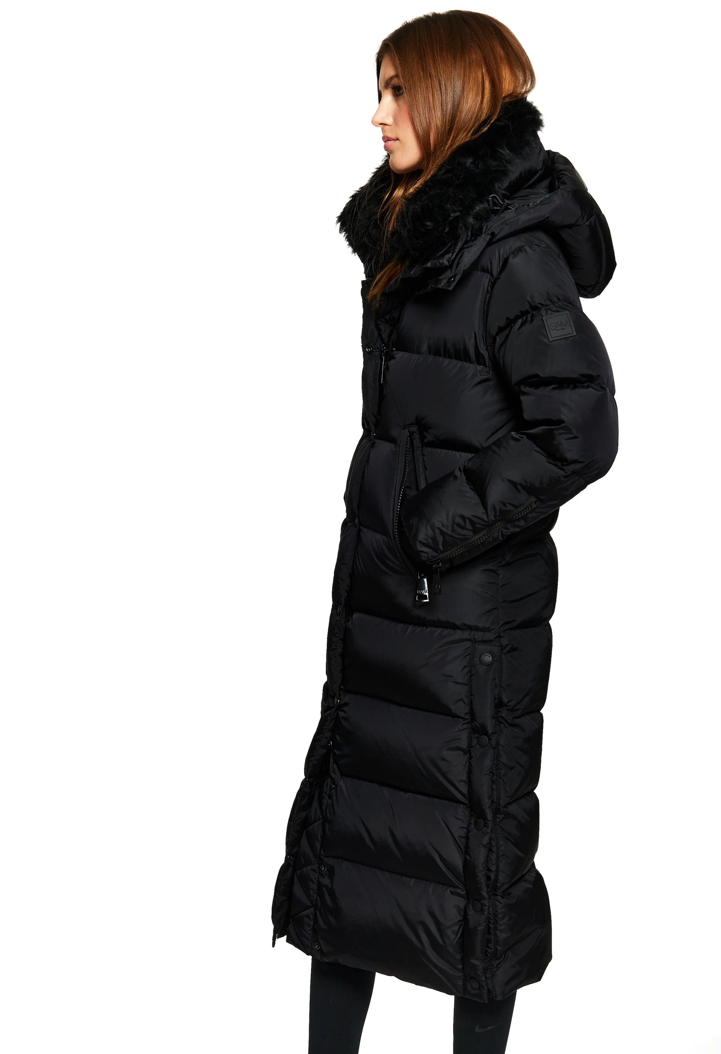 This coat boasts a high-quality, densely-woven nylon construction and plush down filling for superior warmth and a luxurious texture. With a calf-length design, it is both lightweight and resistant to wind and water. The Brooklyn also includes spandex wrist cuffs with thumbholes, a detachable shearling collar, a detachable zip-off hood, zippered cuffs, and two lower zip pockets.