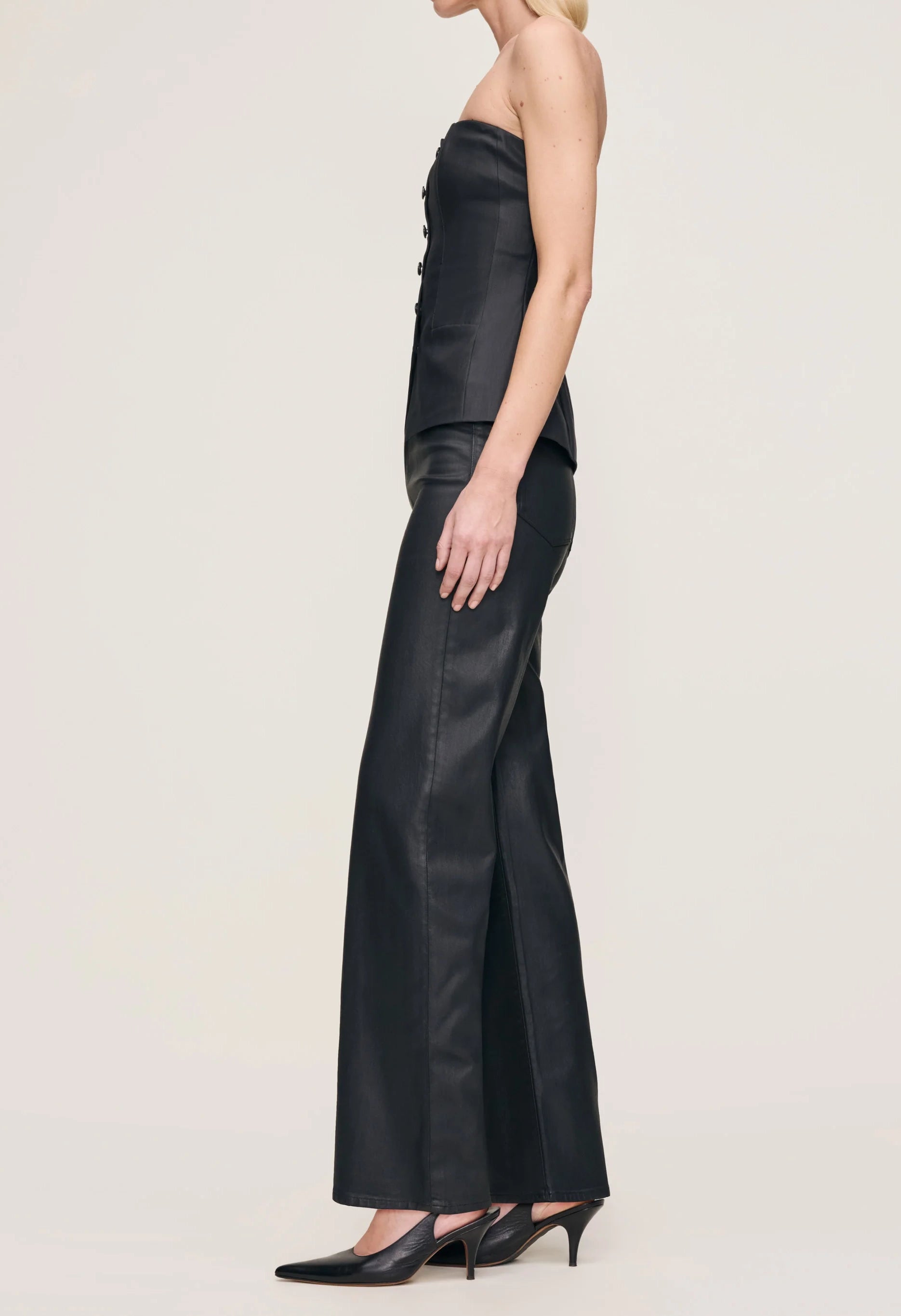 This strapless bustier offers a flattering silhouette with a button-front closure for easy wear. Crafted from Black Coated denim, it combines a wax-coated true black fabric with a sleek leather-like finish. Highlighted by silver zippers, tonal stitching, and clean finishing, this piece balances edgy style with refined detailing.