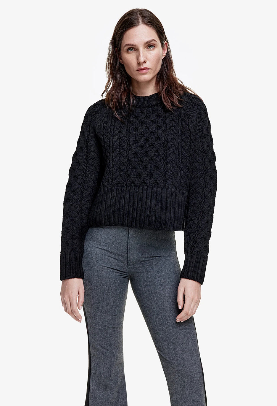 Oversize and cropped, this best-selling sweater ends at the waist and features a classic cable knit pattern and exaggerated rib. This garment fits true to size, take your usual size.