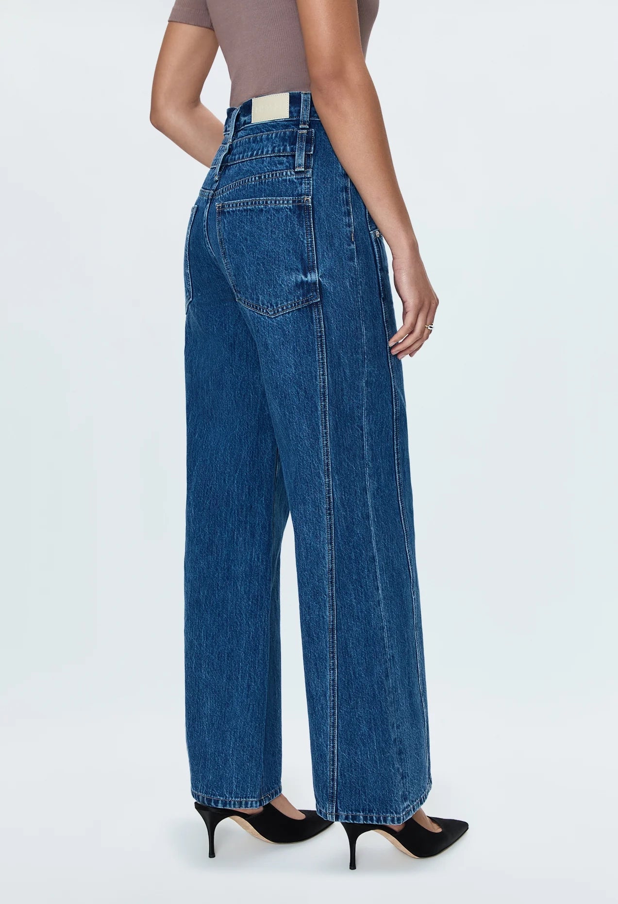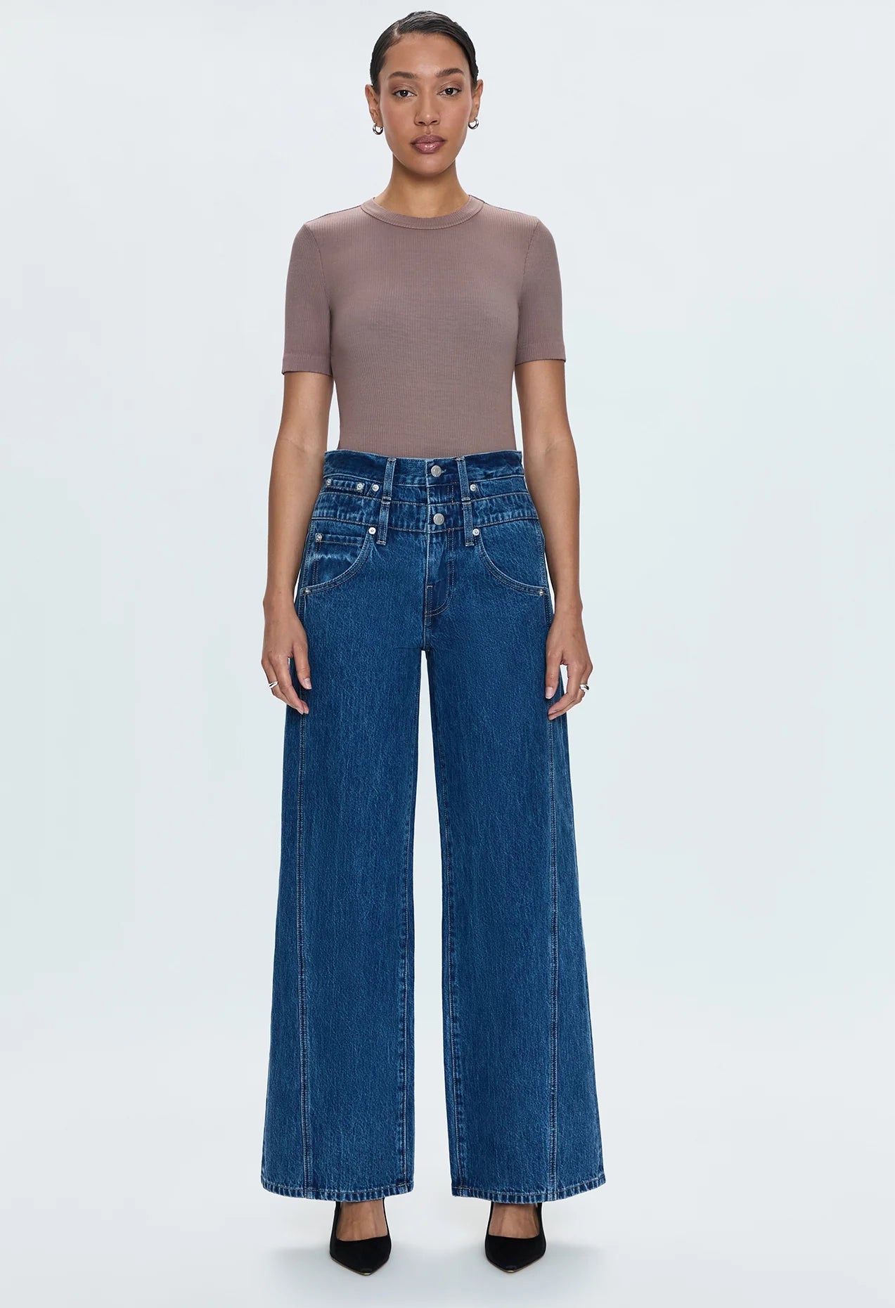 Elevate your denim game with these high rise relaxed jeans. Featuring a wide leg silhouette, full length hem, and double stacked waistband, these jeans also have elevated side seam details.