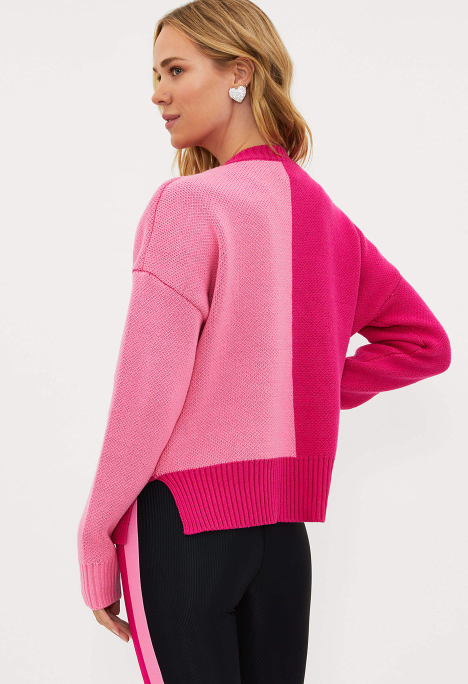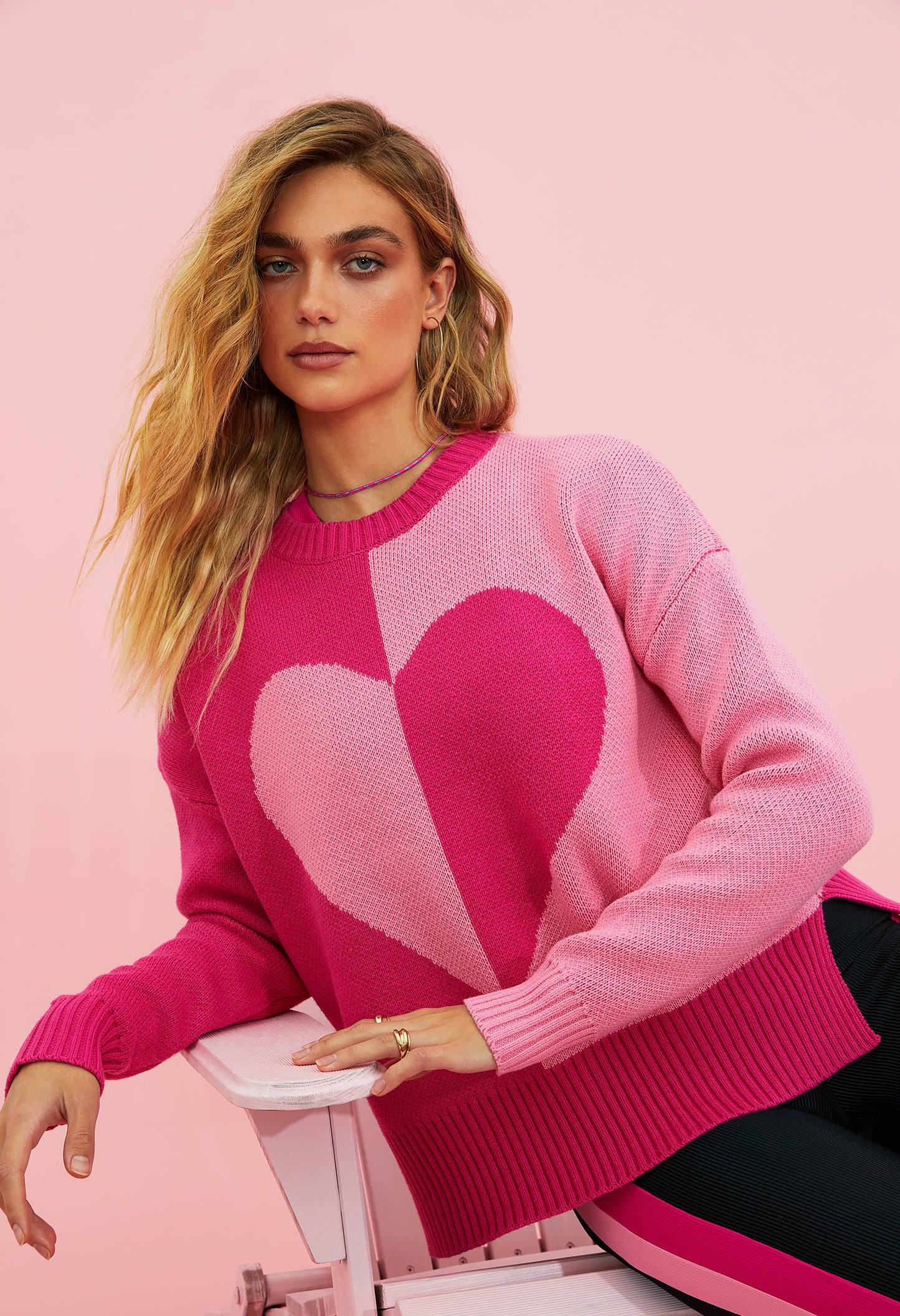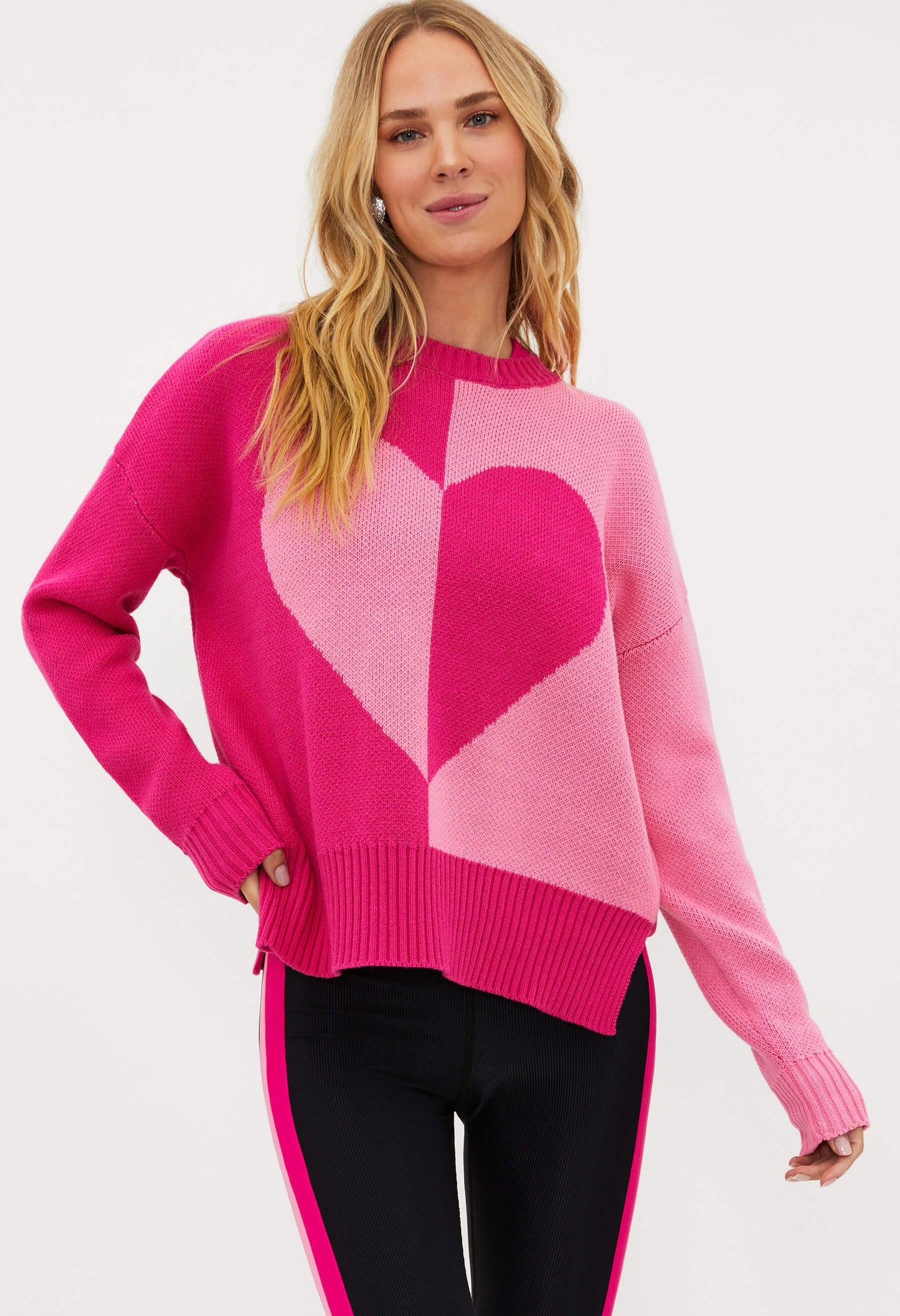 The Callie Sweater is an oversized, crew neck sweater featured in a soft knit fabrication with ribbed knit trim and a fun pink color-blocking heart print. This cozy sweater can be pulled on post-workout with your leggings or styled with your favorite pair of jeans.