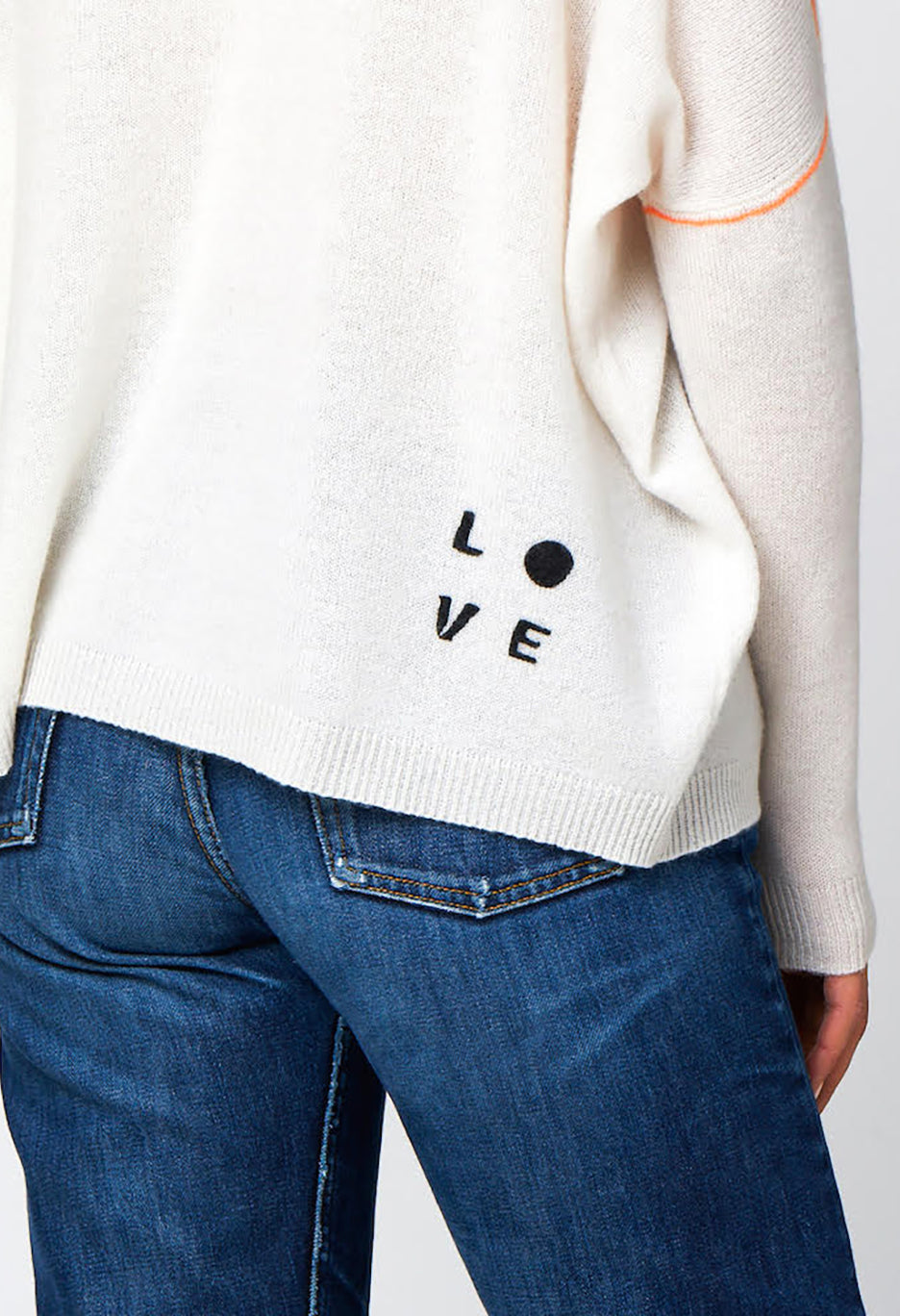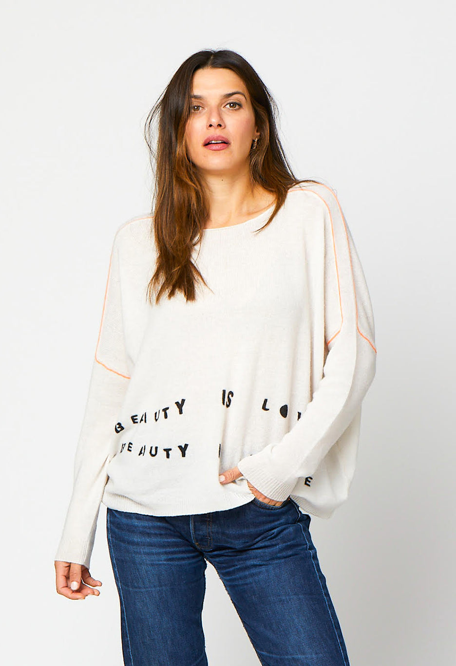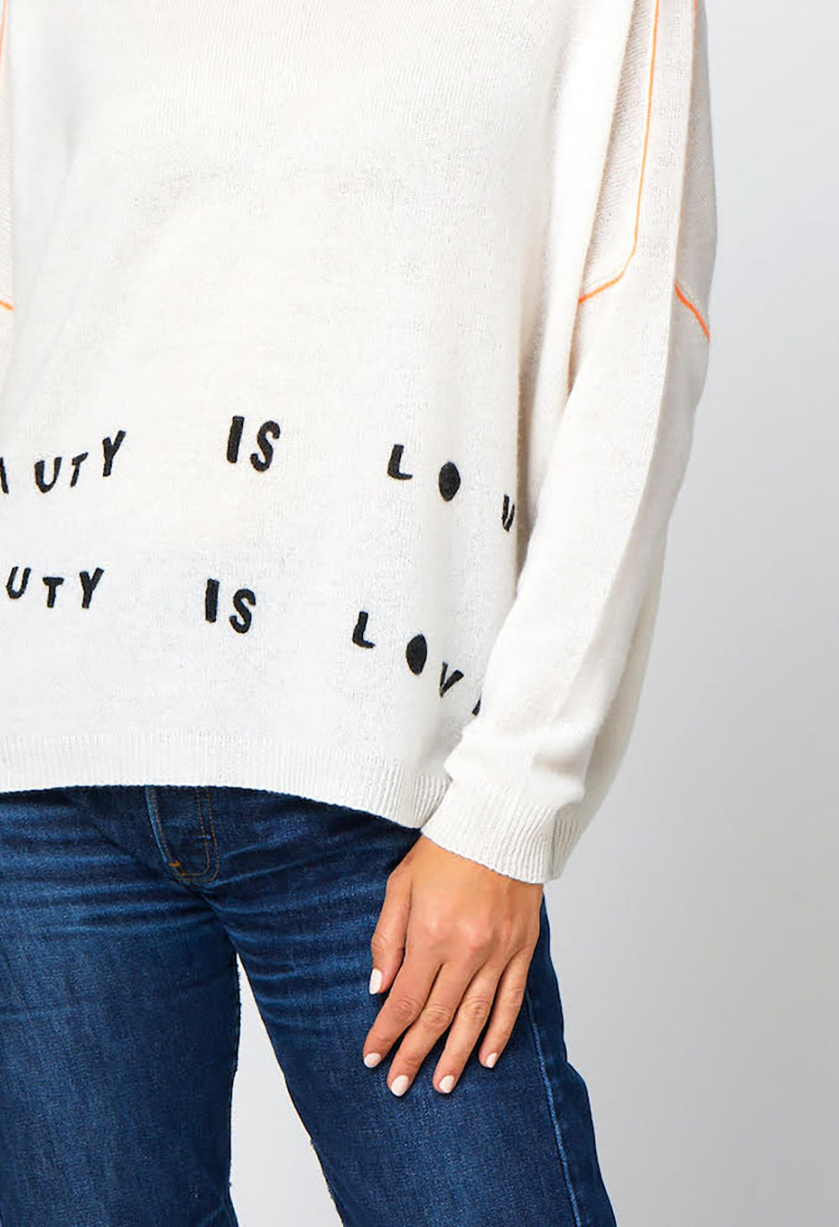 Introducing the luxurious Camille Beauty Is Love Sweater. Made from soft cashmere, this long sleeve sweater features a beautiful word art design by Kerri, adding a touch of sophistication and artistry to your wardrobe. Embrace the essence of love and beauty with this exclusive piece.