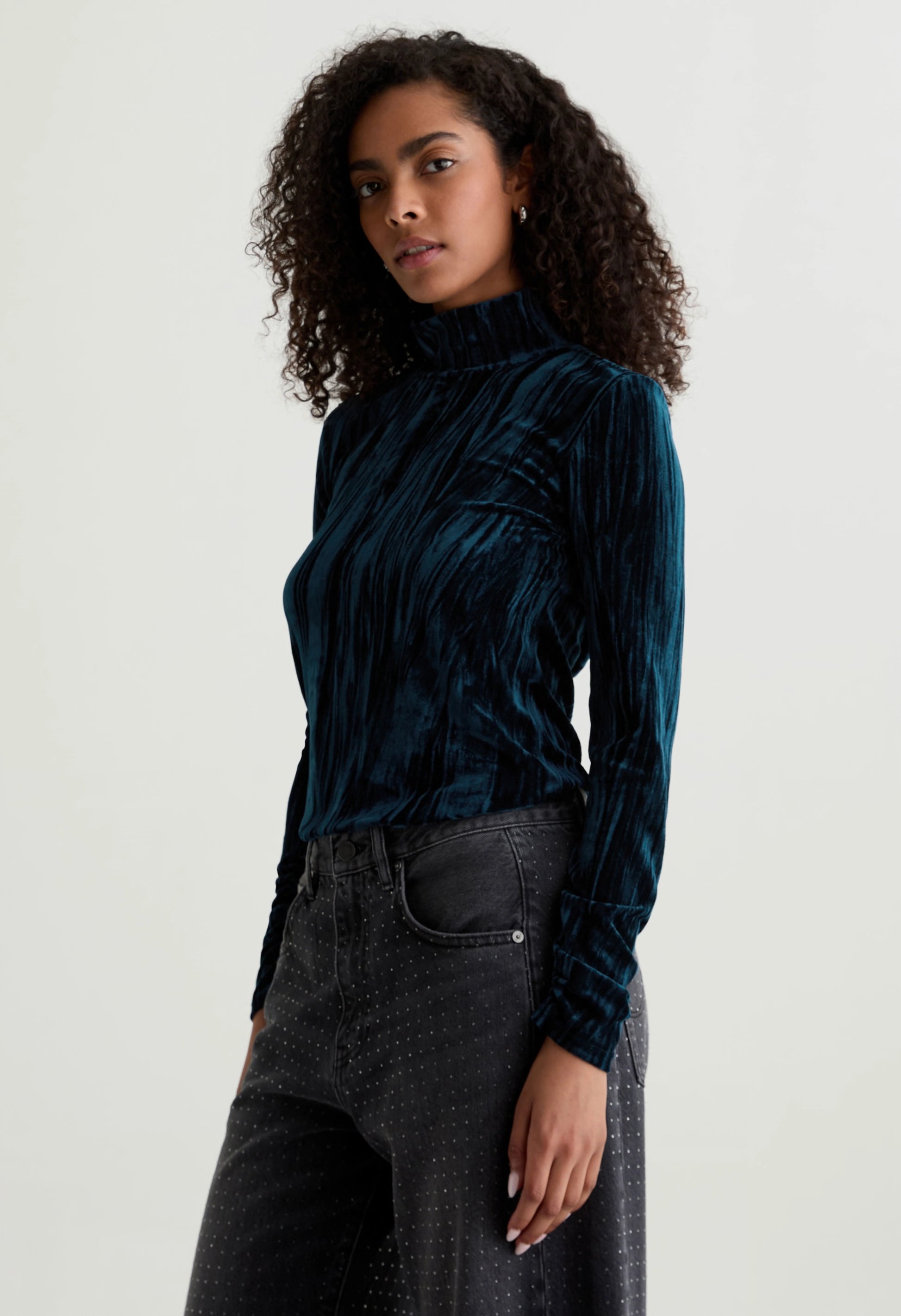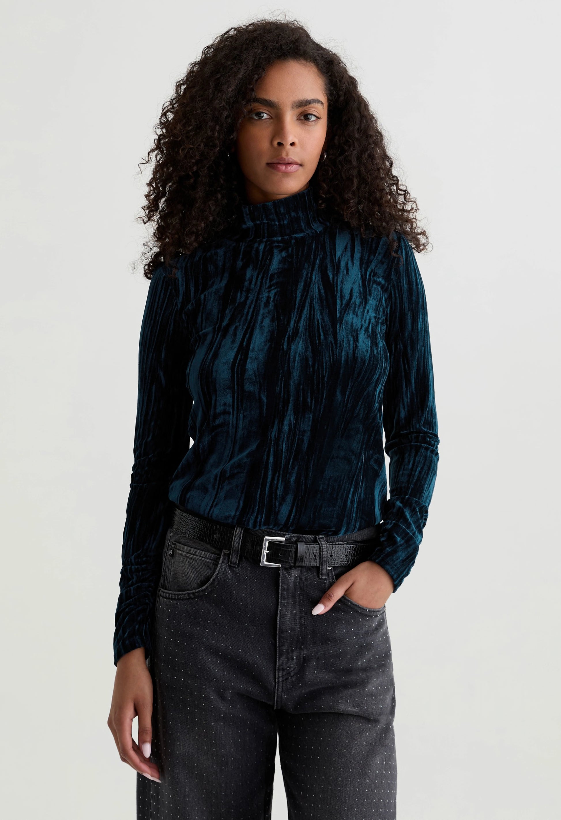 The Candice Velvet Open Back Turtleneck is made from Liquid Velvet, a luxurious blue crushed velvet that elegantly contours to the body. This essential piece features ruched long sleeves, a turtleneck with a button at the center-back neckline, and an open back detail, combining sophistication with a modern edge.