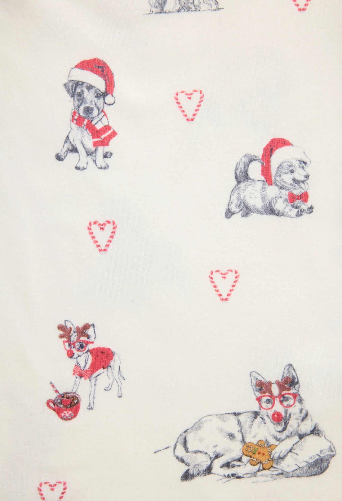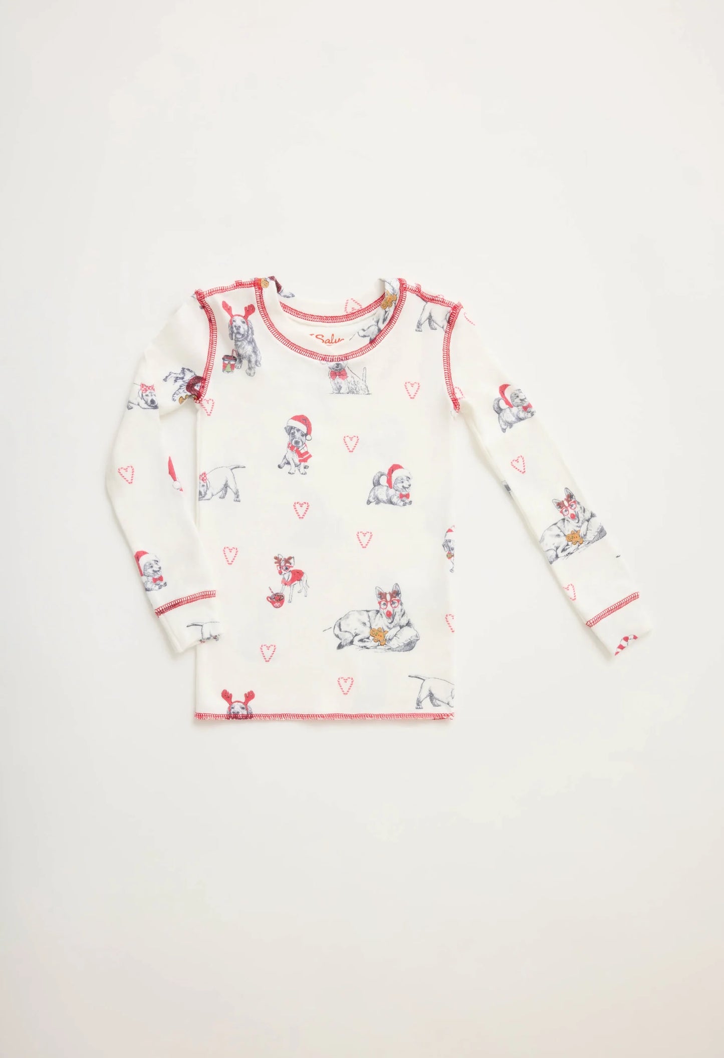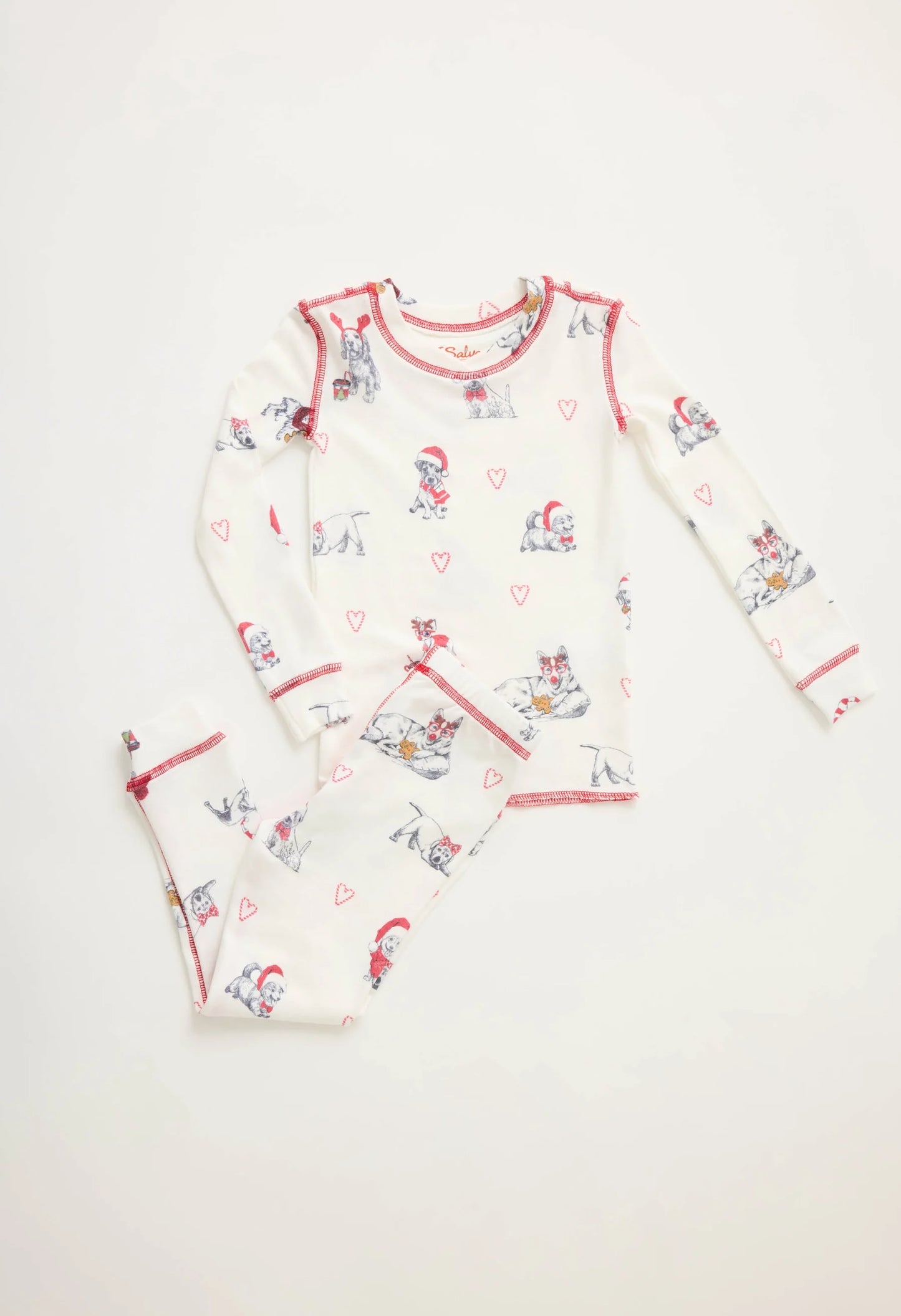 Get your little ones ready for cozy nights with the 'Candy Cane Lane' Kids Pj Set, featuring a long sleeve top and banded pants adorned with playful holiday dogs wearing cheerful red hats. The soft white fabric ensures ultimate comfort, perfect for snuggling up during chilly nights. Ideal for holiday sleepovers, movie nights, or festive mornings, this pajama set adds a fun and festive touch.