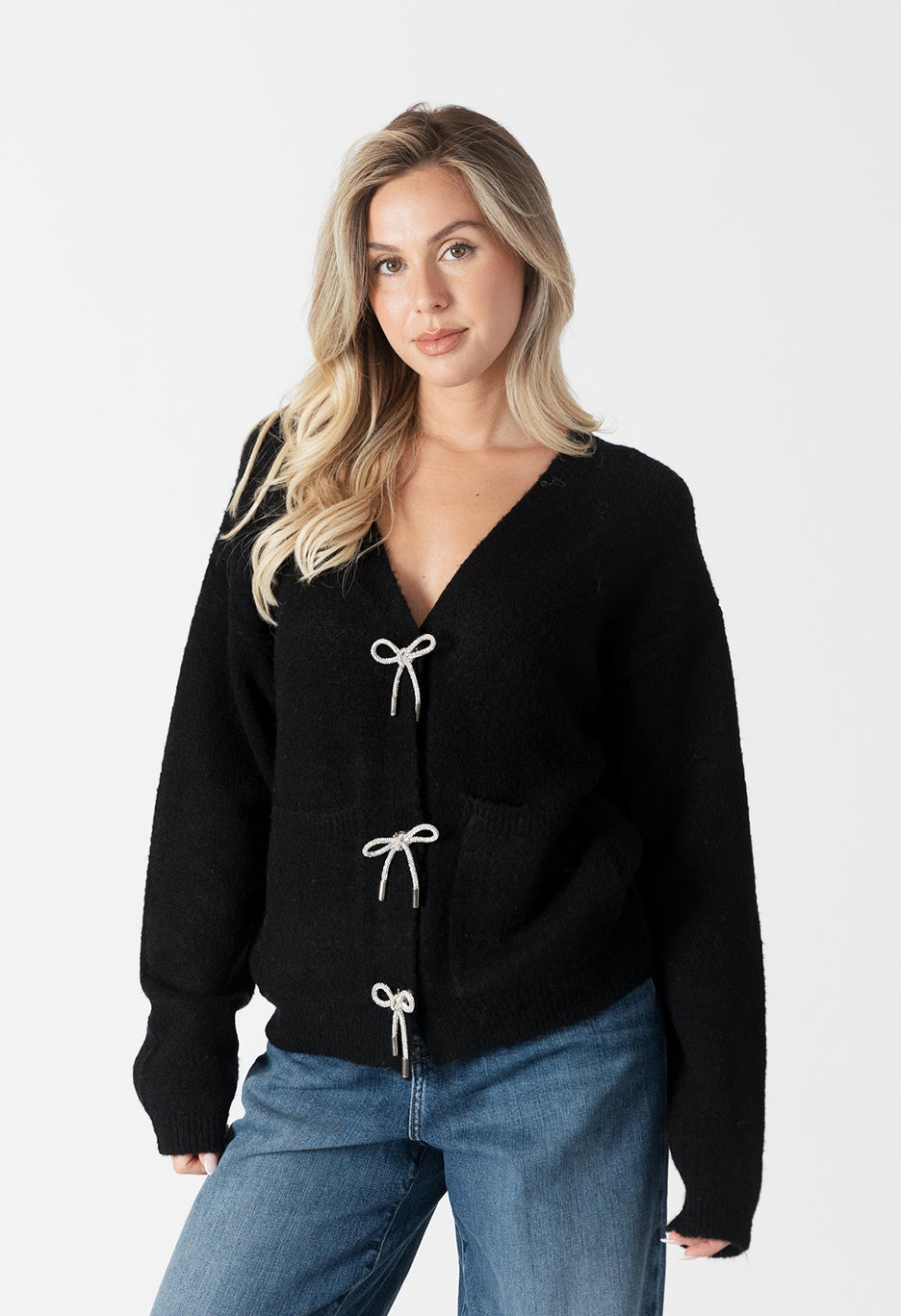 This elegant cardigan features delicate bow crystal buttons, adding a touch of sophistication to any outfit. Made with quality materials, it provides both style and comfort. Perfect for any occasion, this cardigan is a must-have addition to your wardrobe.