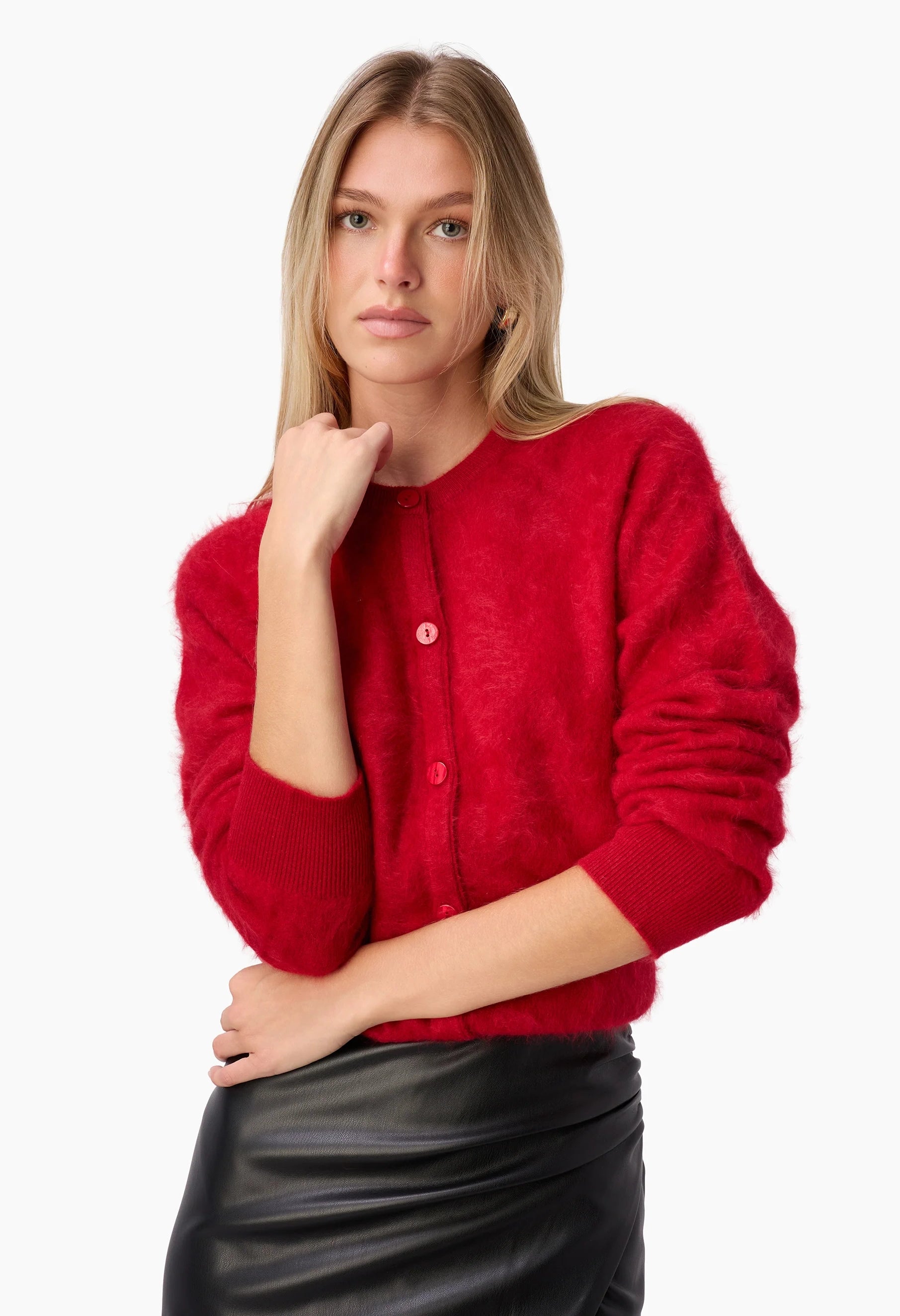 This cashmere cardigan features a soft brushed cashmeruse fabric for ultimate comfort and warmth. Pearlized buttons run down the center front, adding an elegant touch. Rib detailing at the hem and neckline enhances fit and style, while the design hugs at the high hip to create a flattering blouson effect at the body. Perfect for layering in cooler weather with a polished look.