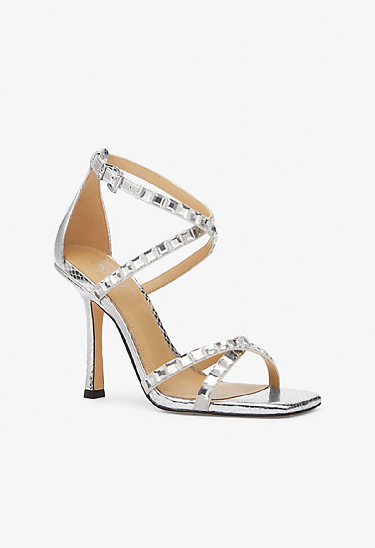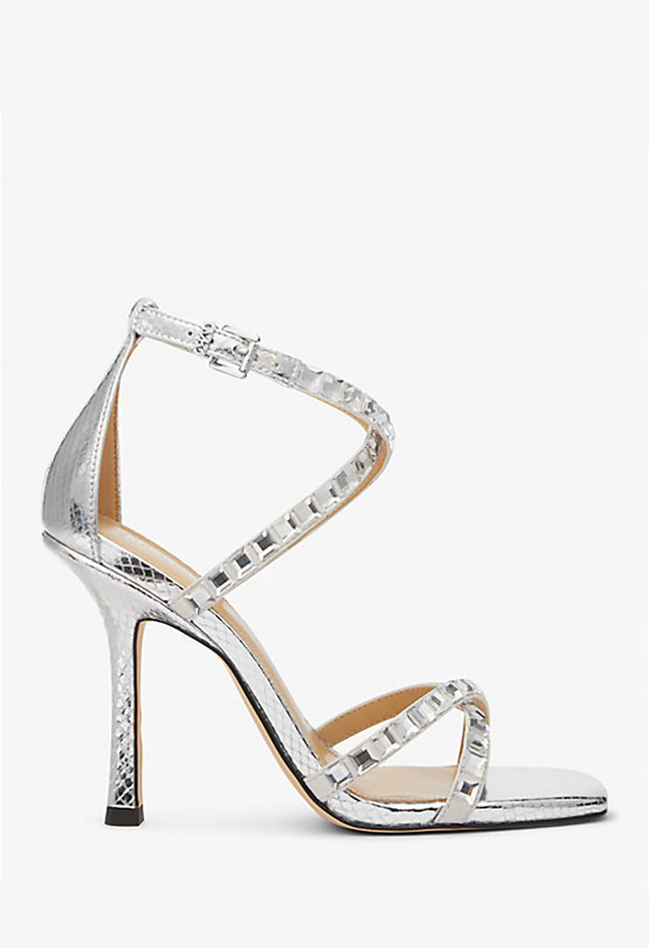 Level up the shine in the striking Celia sandals. Crafted from snake embossed and crystal-embellished leather, these metallic heels have a sky-high silhouette with a bit of edge, delivered by the crisscross straps. Bring the drama by pairing this jewel-encrusted style with sleek trousers or a va-va-voom gown.