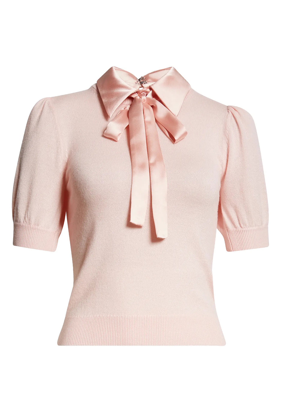 A wool sweater and beautiful statement puff sleeves and a removable bow collar. This is the shirt that takes things up a notch.