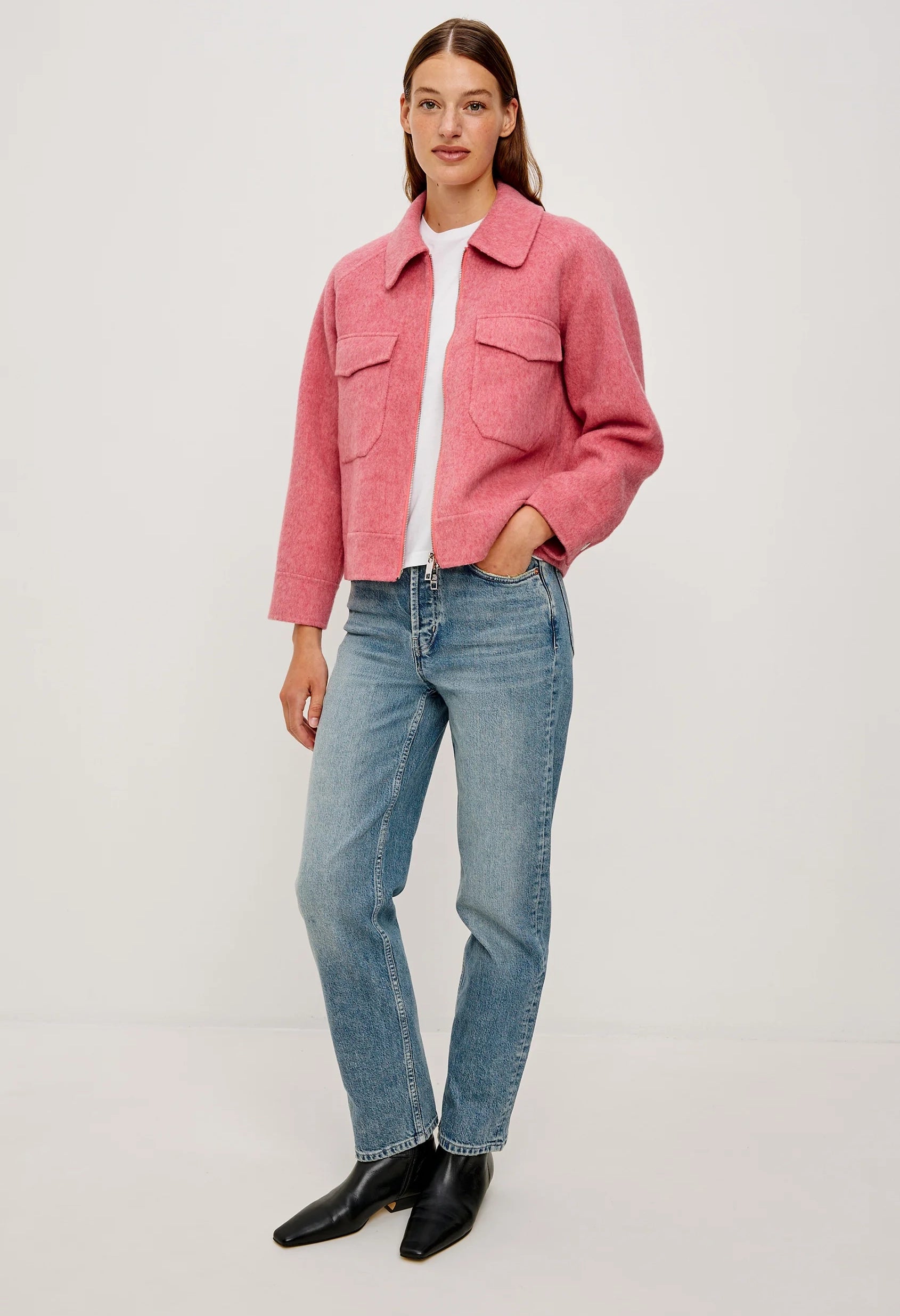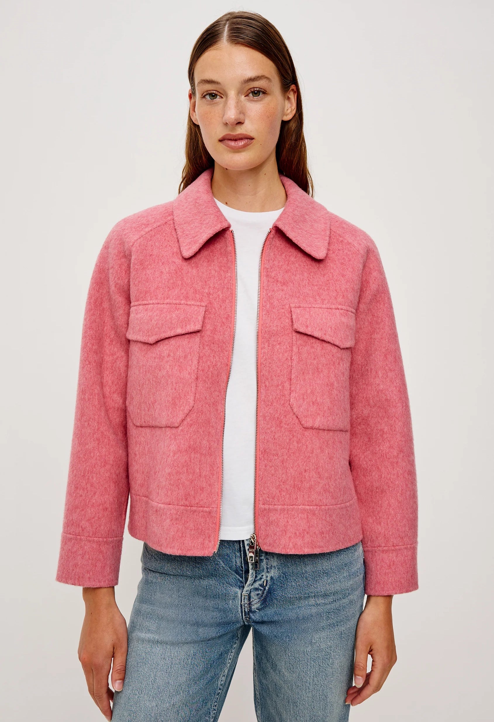 Crafted from a heavyweight wool blend, the Cheyenne is an unlined zip-up jacket that includes an oversized collar, large flap pockets on the chest, and raglan sleeves