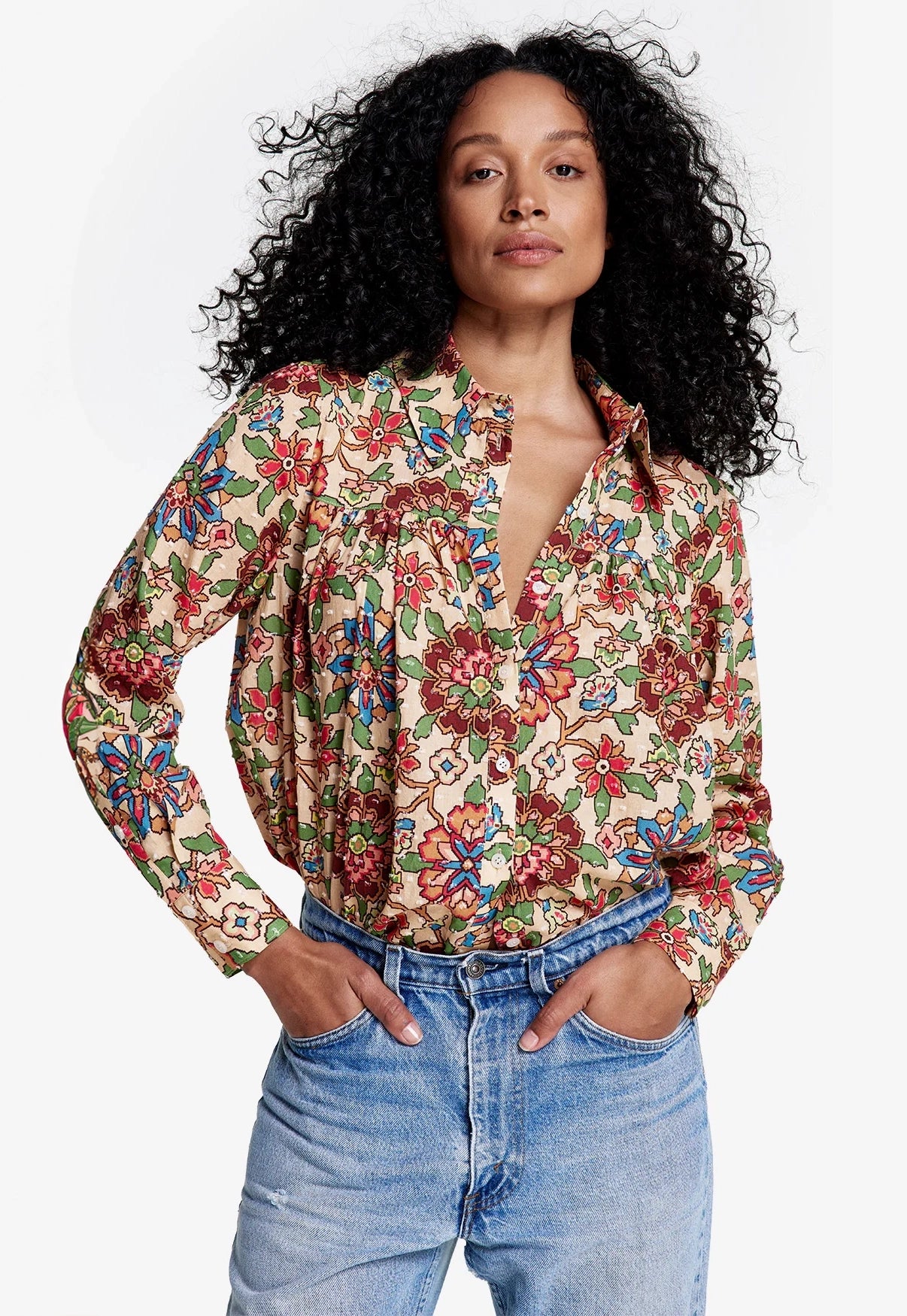 This Swiss dot shirt boasts a classic collar, shirred front and back yoke, and full-length sleeves for a moderately tailored look. This garment fits true to size, take your usual size.