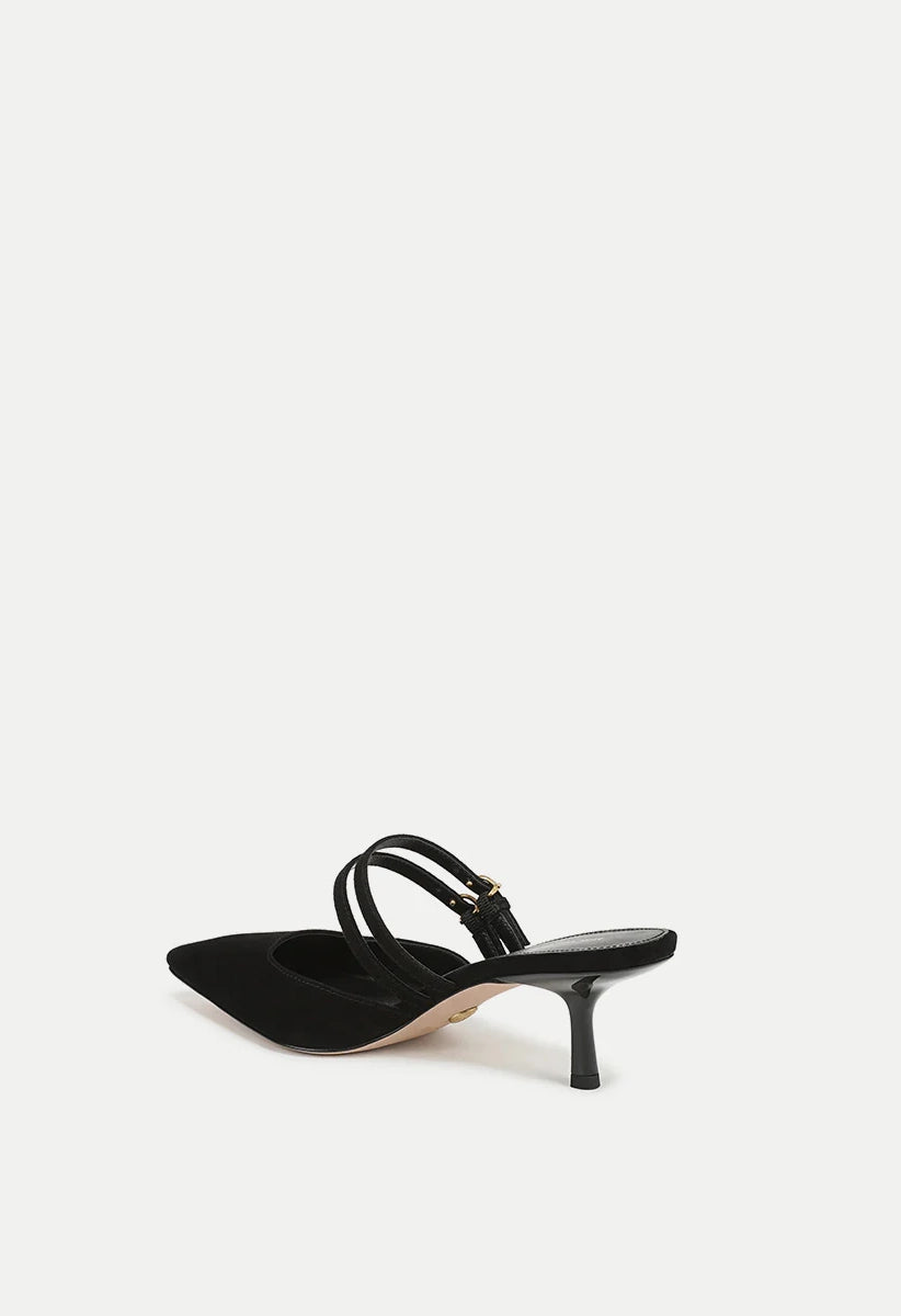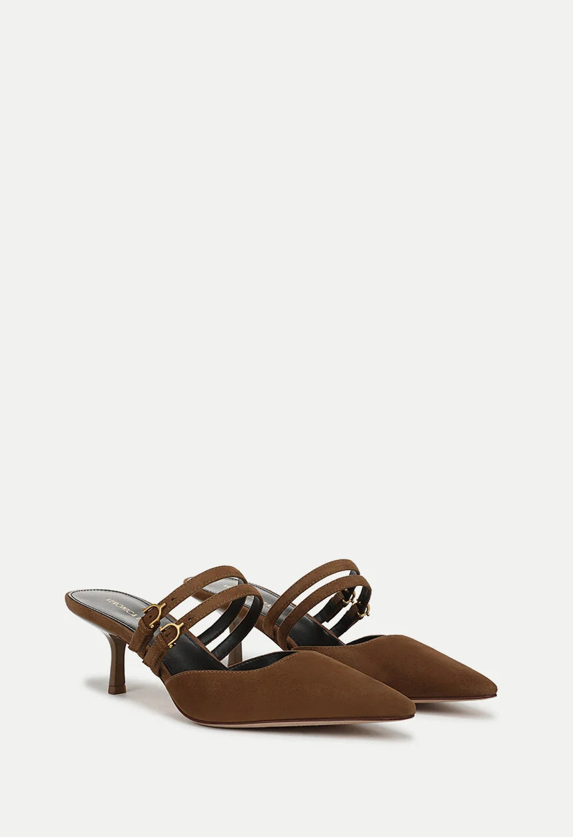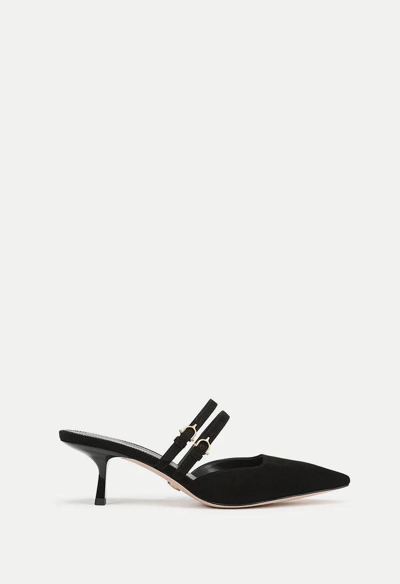 The Corrie mule pump features a refined kitten heel crafted from luxurious suede. Its design highlights a low, gently squared vamp and two Mary Jane-inspired straps across the foot. Finished with a pointed snip toe and a two-inch heel, this shoe pairs effortlessly with a classic little black dress for evening elegance or with wide-leg jeans for a sophisticated daytime look.
