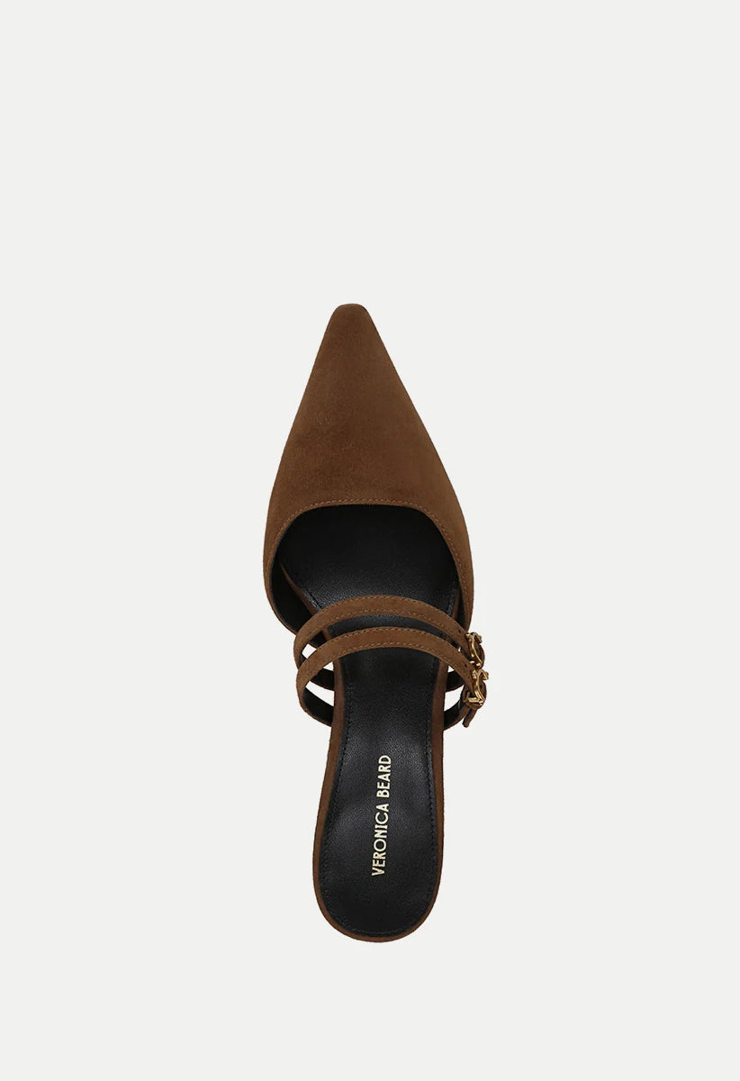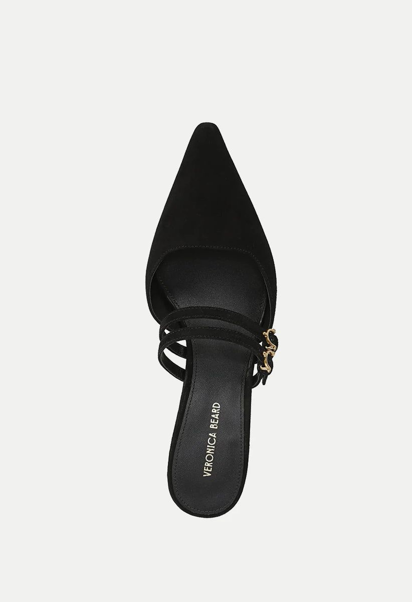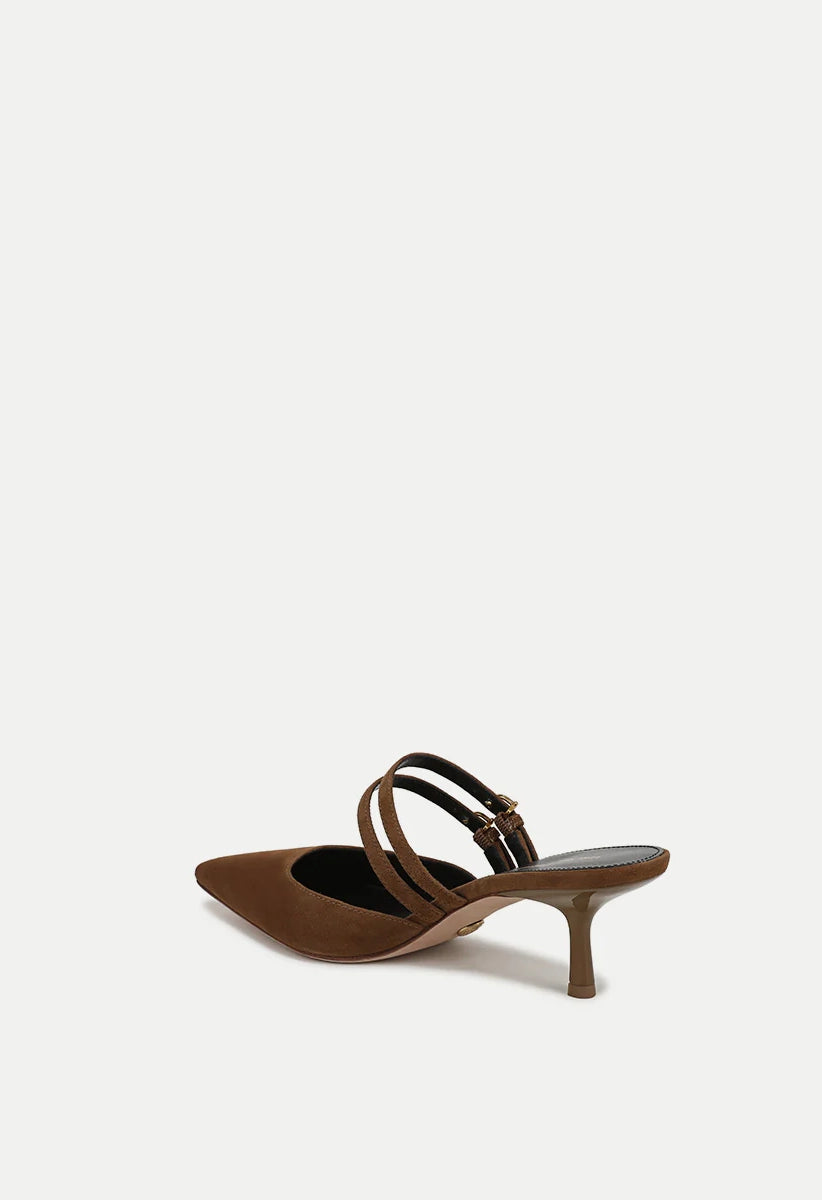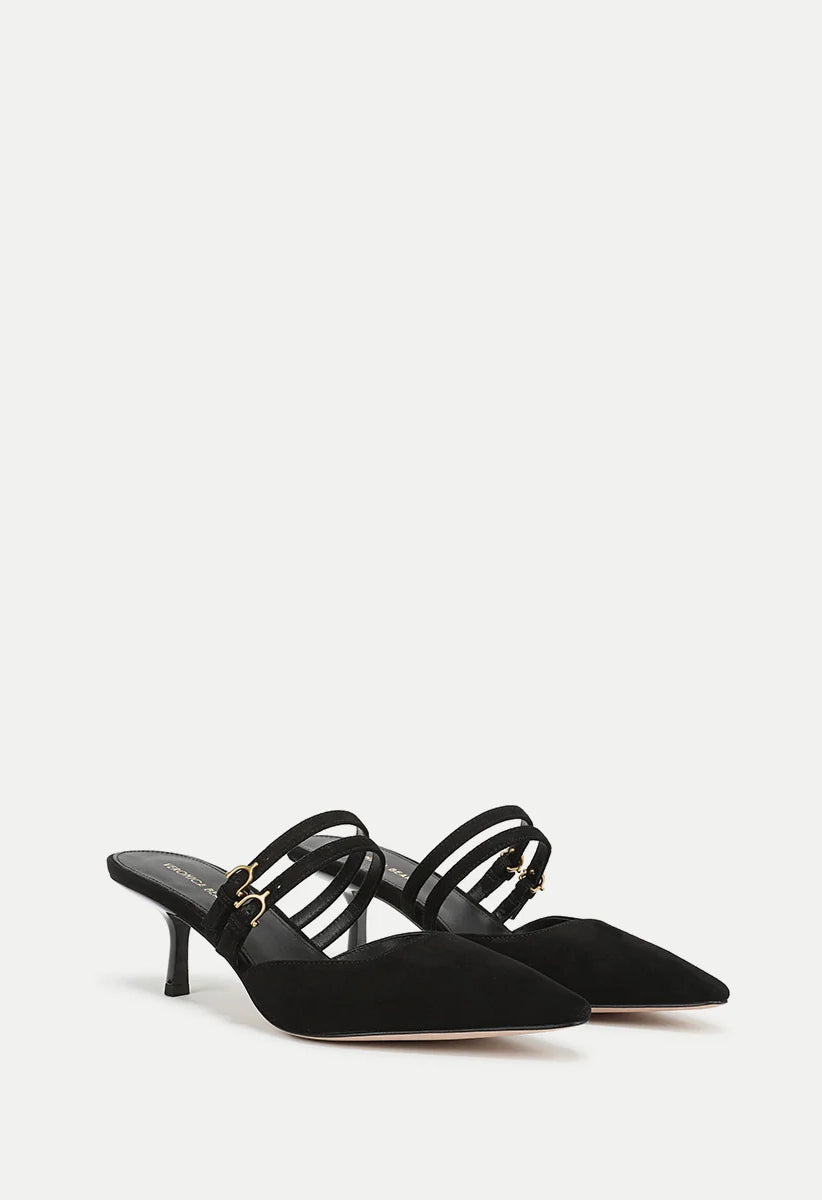 The Corrie mule pump features a refined kitten heel crafted from luxurious suede. Its design highlights a low, gently squared vamp and two Mary Jane-inspired straps across the foot. Finished with a pointed snip toe and a two-inch heel, this shoe pairs effortlessly with a classic little black dress for evening elegance or with wide-leg jeans for a sophisticated daytime look.