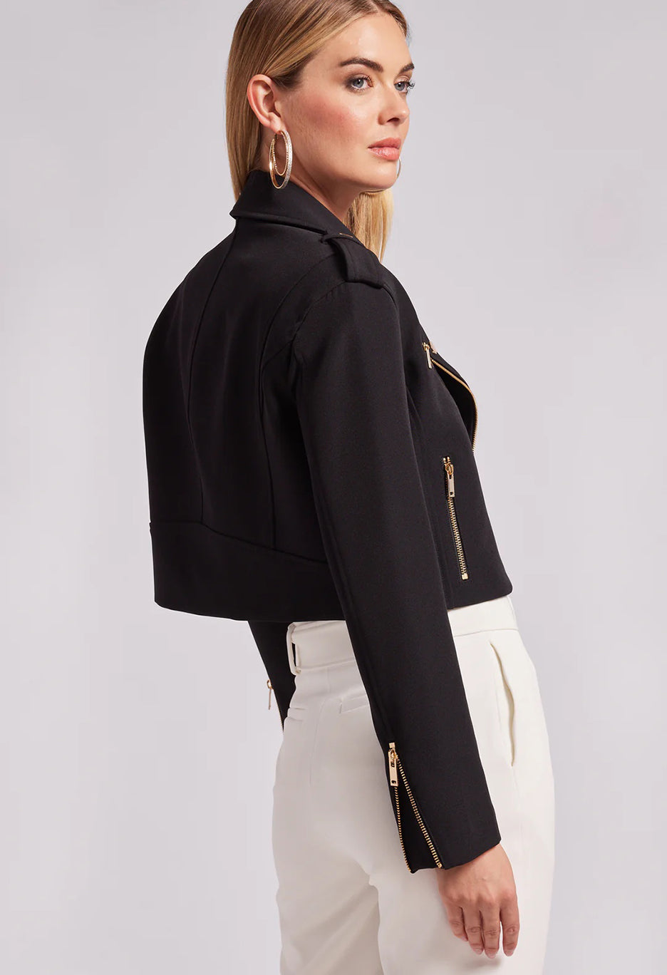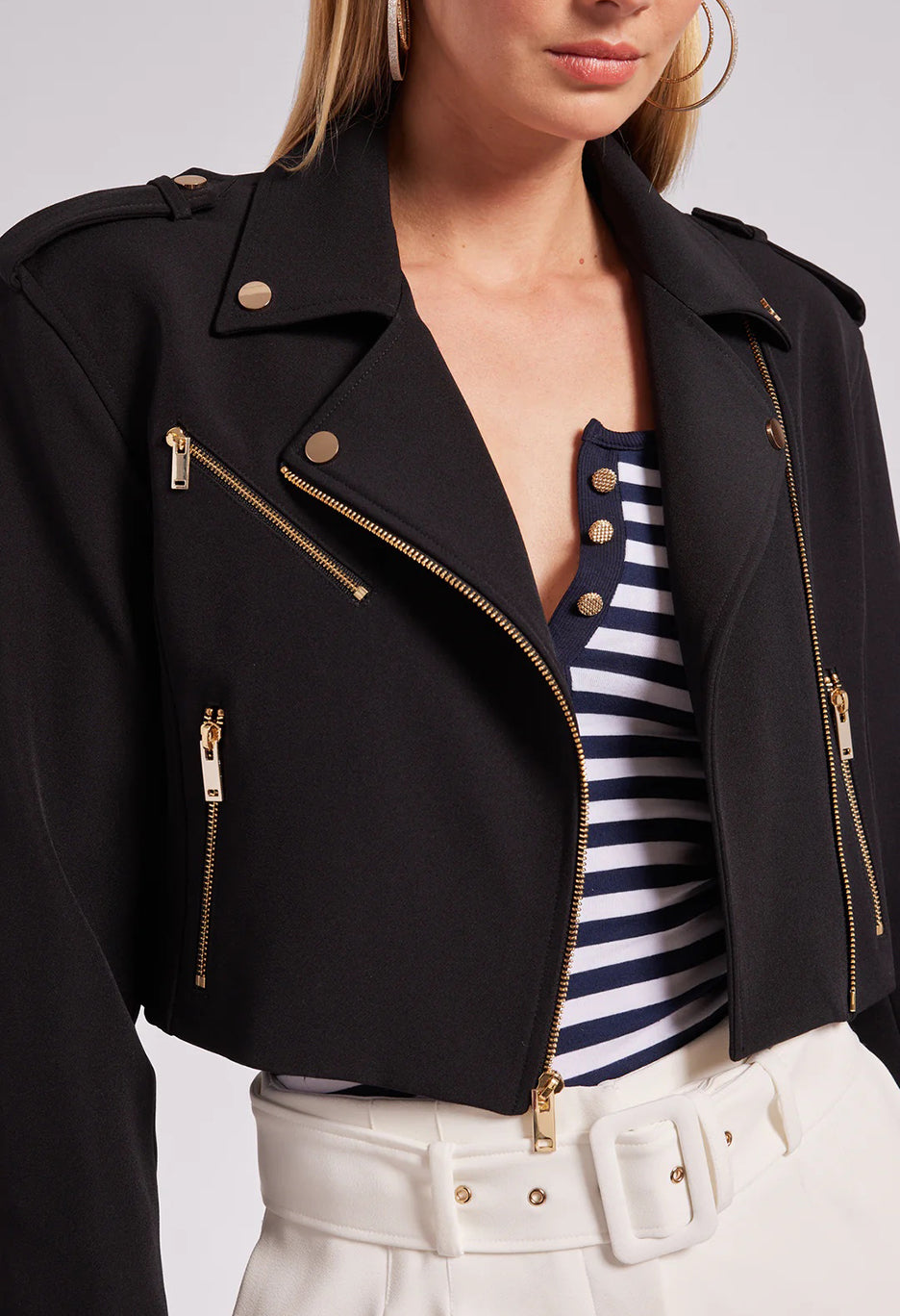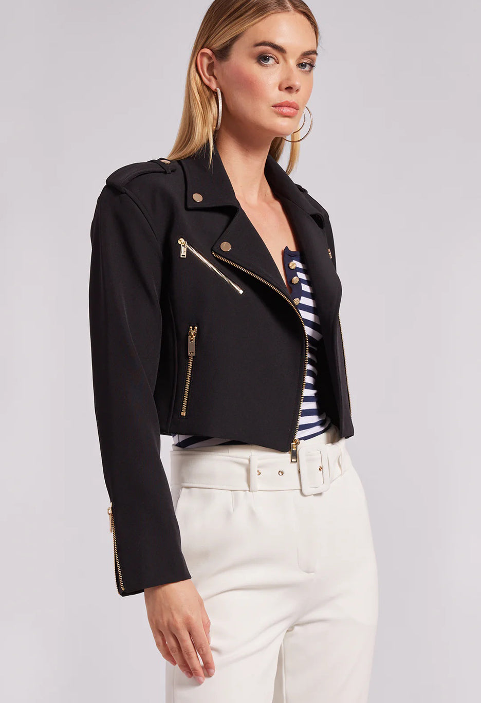 Rev up your wardrobe in the Cosita. Made with smooth crepe and gold hardware, this moto will pair perfectly with distressed jeans and a band tee for the ultimate edgy look.