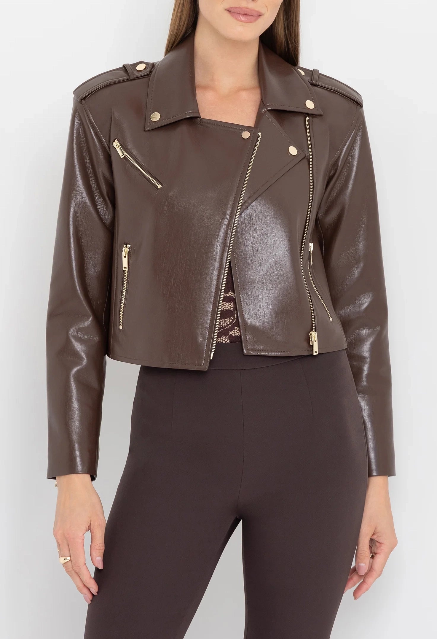 The Cosita Vegan Leather Jacket offers a fresh take on a timeless style. Crafted from smooth stretch vegan leather in a deep mahogany shade, it showcases a cropped, boyfriend-inspired silhouette with striking moto design elements. Enhanced with gold hardware on the asymmetric front, zippered cuffs, and slanted pockets, this jacket elevates any look. Pair it effortlessly with a tee, dress, or knitwear for an instant style upgrade.