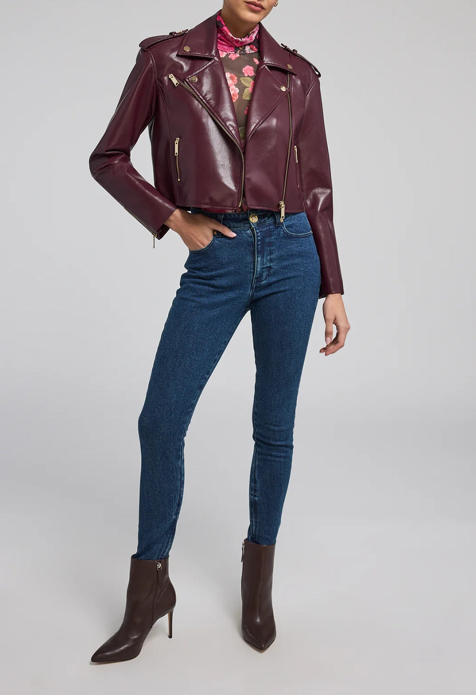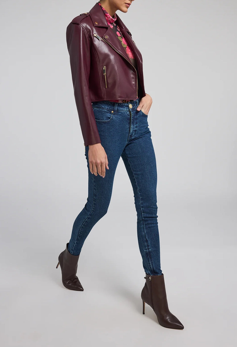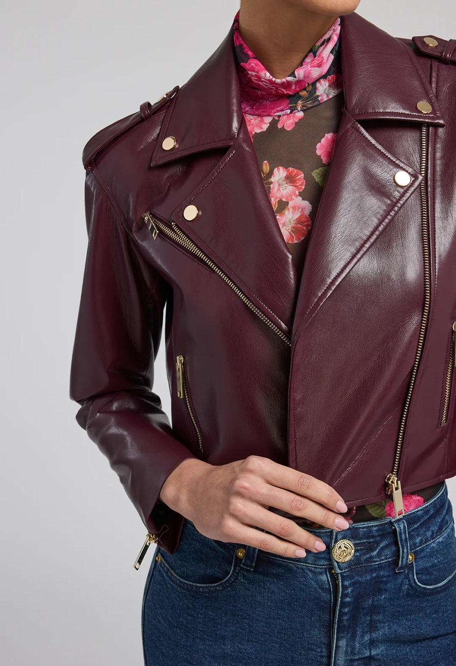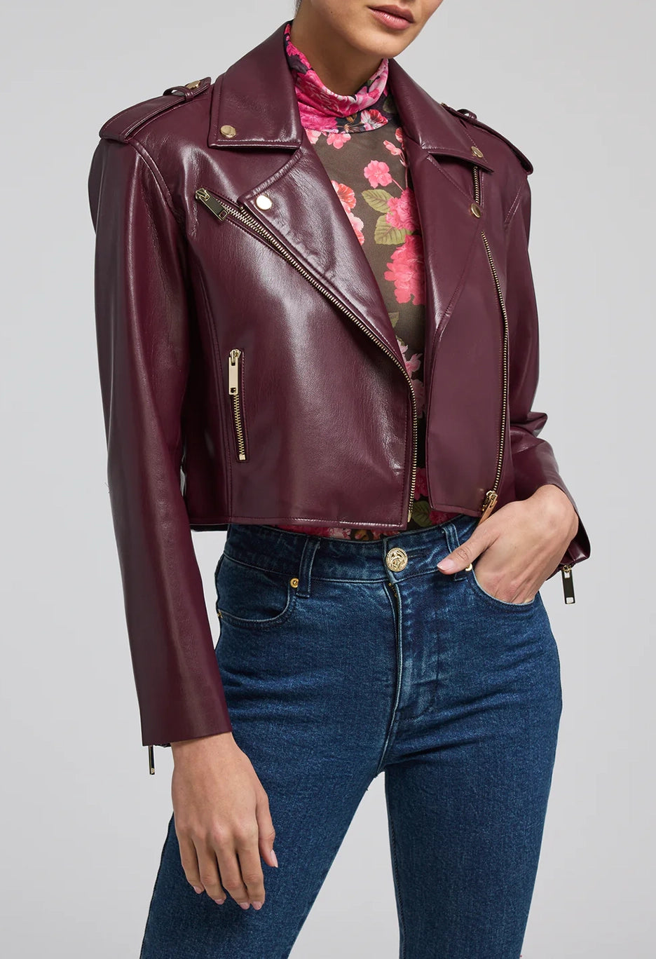 This cropped length Cosita Moto Jacket is made with high-quality vegan leather in a deep Malbec red color. Enjoy a stylish and sustainable look with this cruelty-free alternative to traditional leather.
