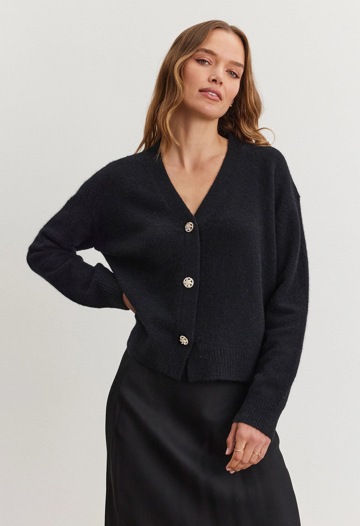 Indulge in luxurious warmth and style with the Marti Cozy Alpaca Blend Cardigan. Made from a soft alpaca blend, this long sleeve cardigan features jewelled buttons for a touch of elegance. Perfect for chilly days and nights, you'll love how this cardigan keeps you cozy while looking chic.