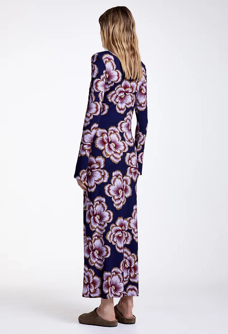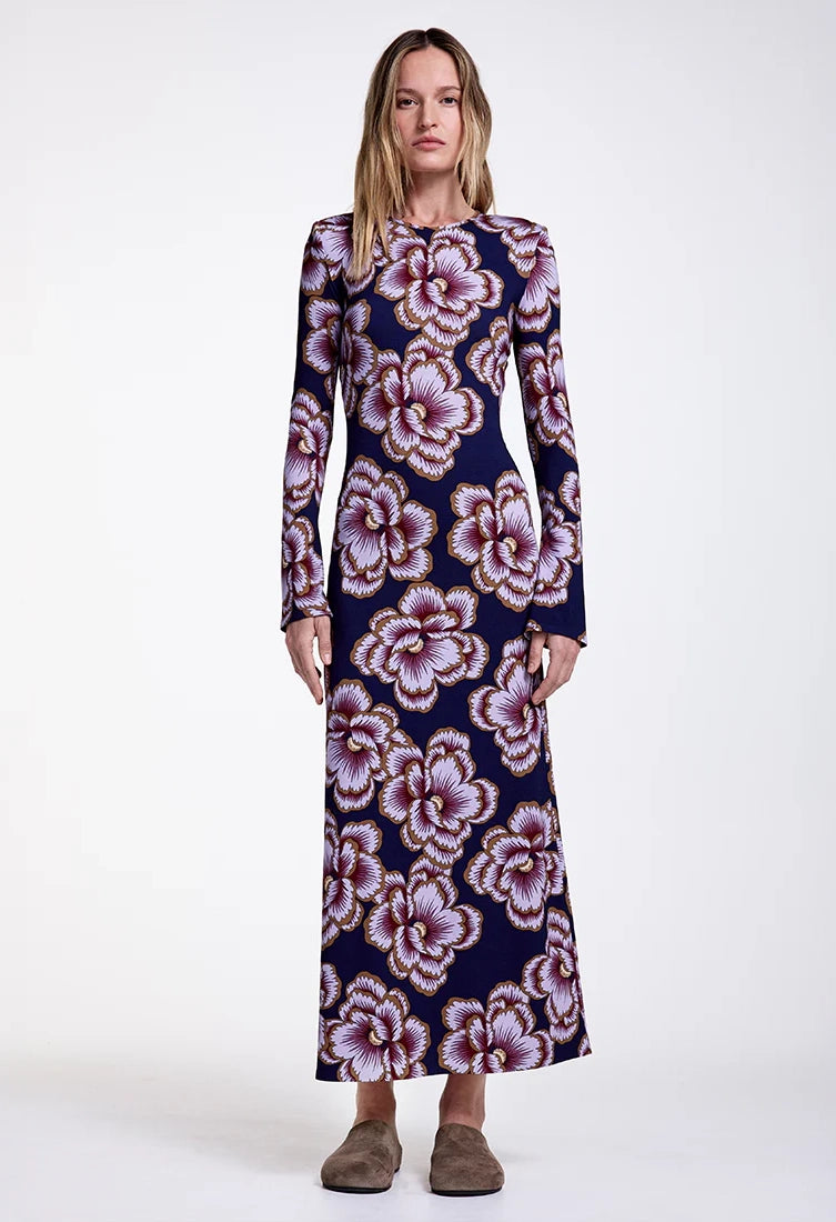 The Crewneck Midi Dress from Smythe combines sophisticated simplicity with subtle drama through its flowing bell sleeves and graceful A-line shape. Featuring a tonal floral pattern, it offers a refined charm, while the stretchy jersey knit provides comfortable wear throughout the day without sacrificing style