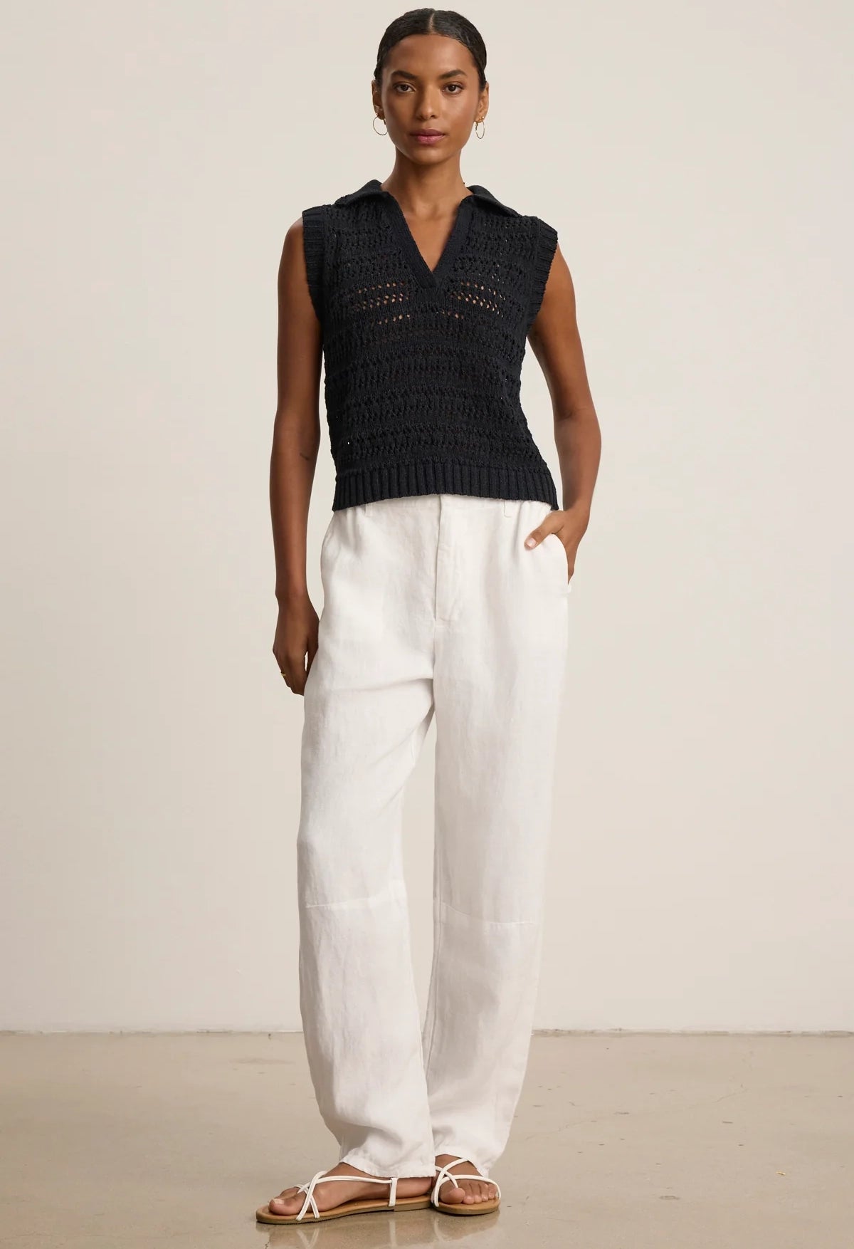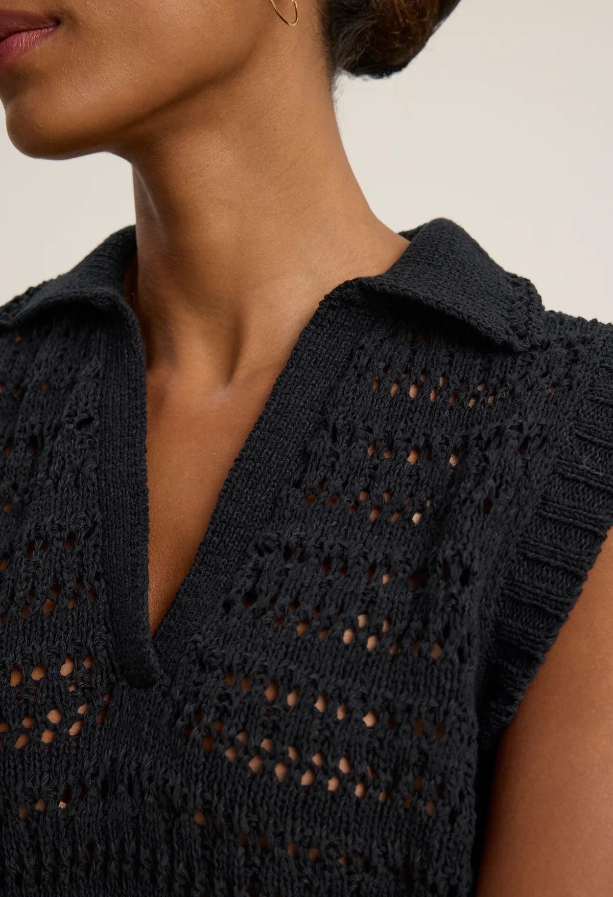 Designed with a stylish collar and ribbed trims, this V-neck sweater polo is crafted from our new cotton crochet stitch fabric, offering a subtle sheerness for a delicate, airy look. Combining breathable comfort with a unique texture, this sweater is the perfect balance of classic and contemporary.