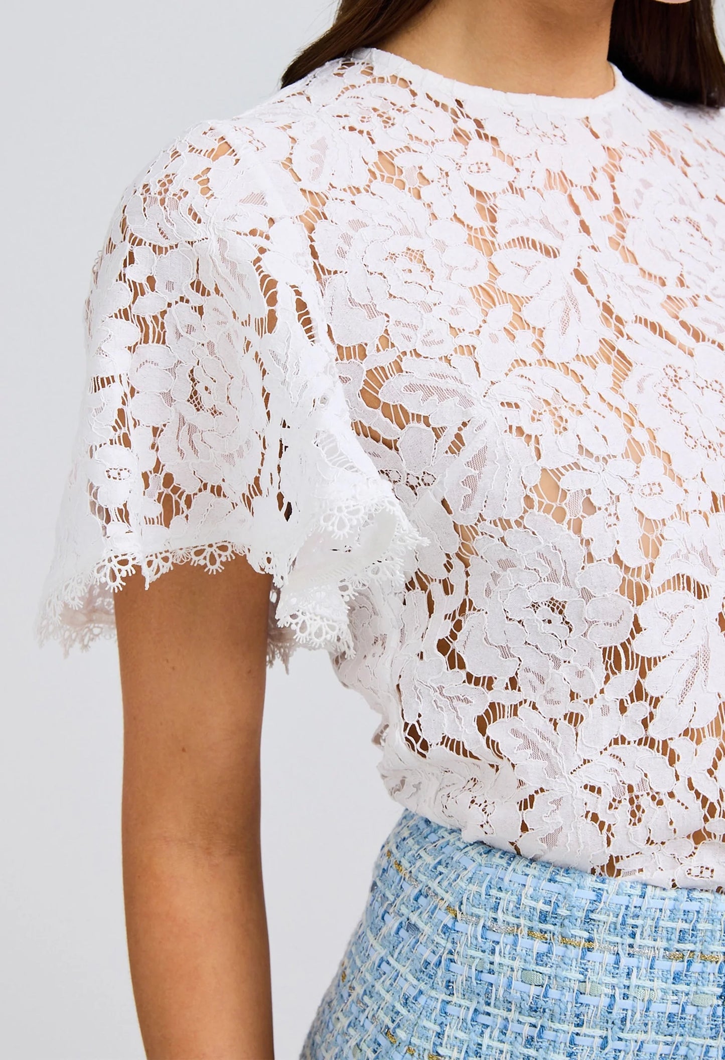 This charming top combines semi-sheer white floral lace with crew neck t-shirt styling. The scalloped eyelash lace at the sleeves and hem adds a romantic touch. Dress it up with jeans for a chic look or pair it with skirts for a contemporary vibe.