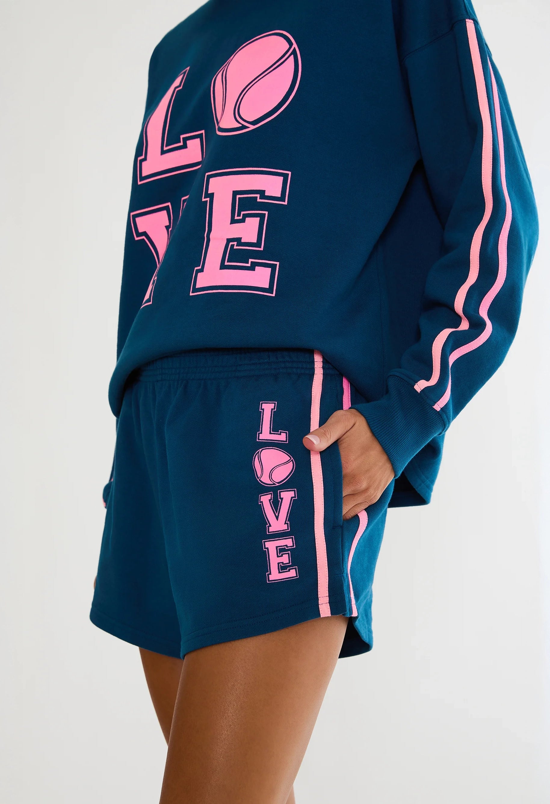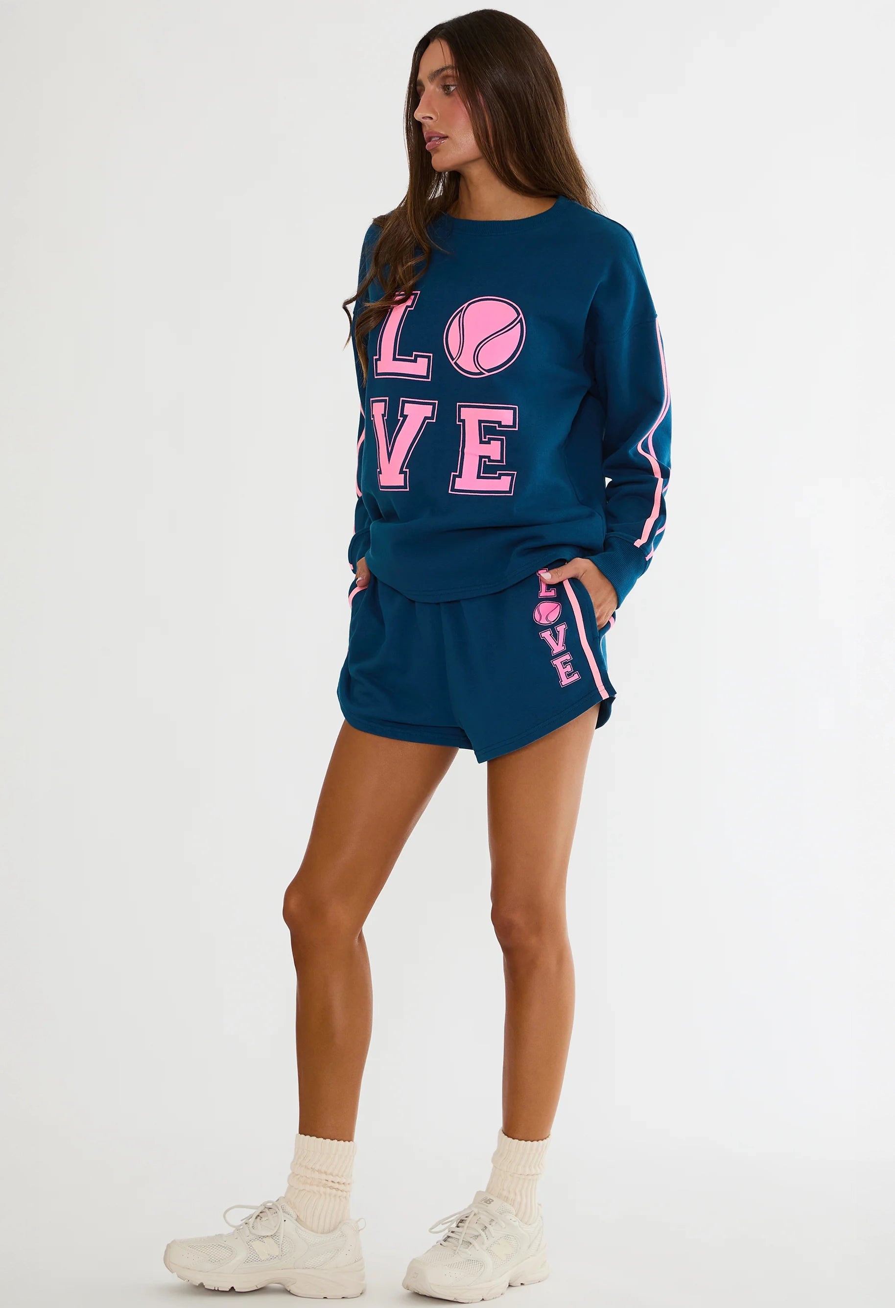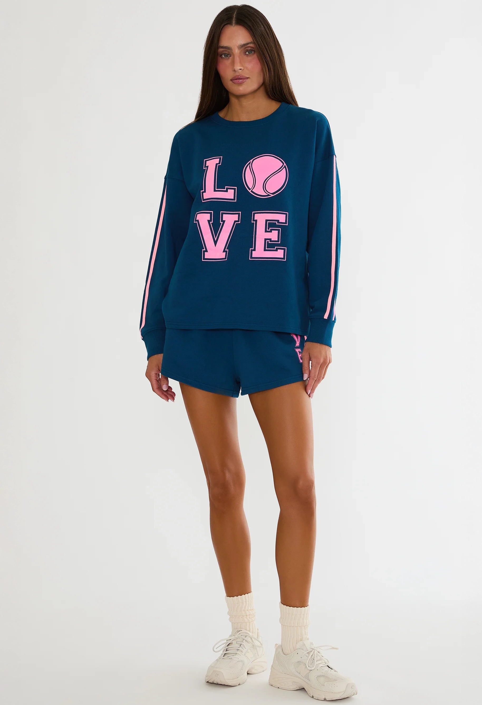 Relaxed crewneck sweatshirt with a bold "LOVE" graphic and tennis-inspired detail. Features contrast stripes on the sleeves, ribbed cuffs and neckline, and soft midweight cotton for everyday comfort.