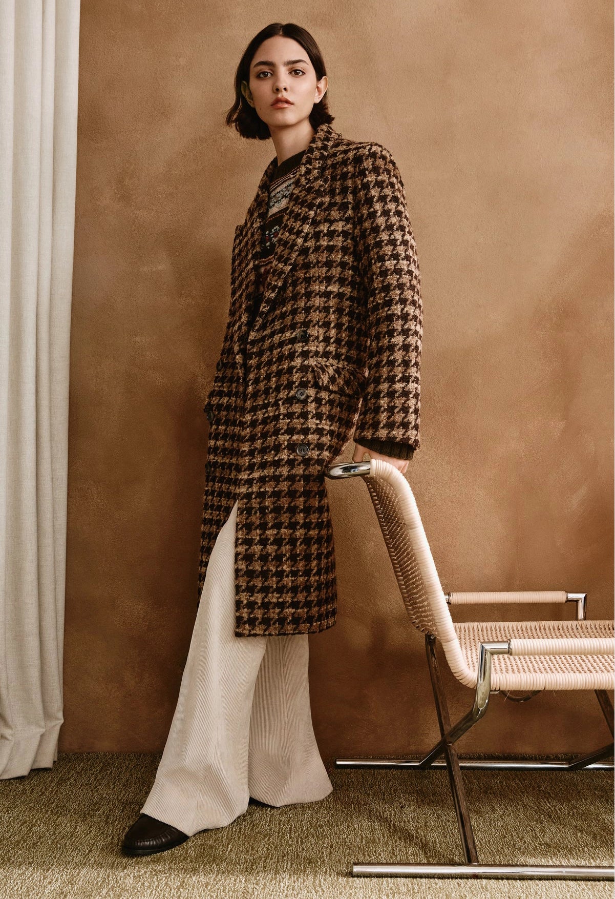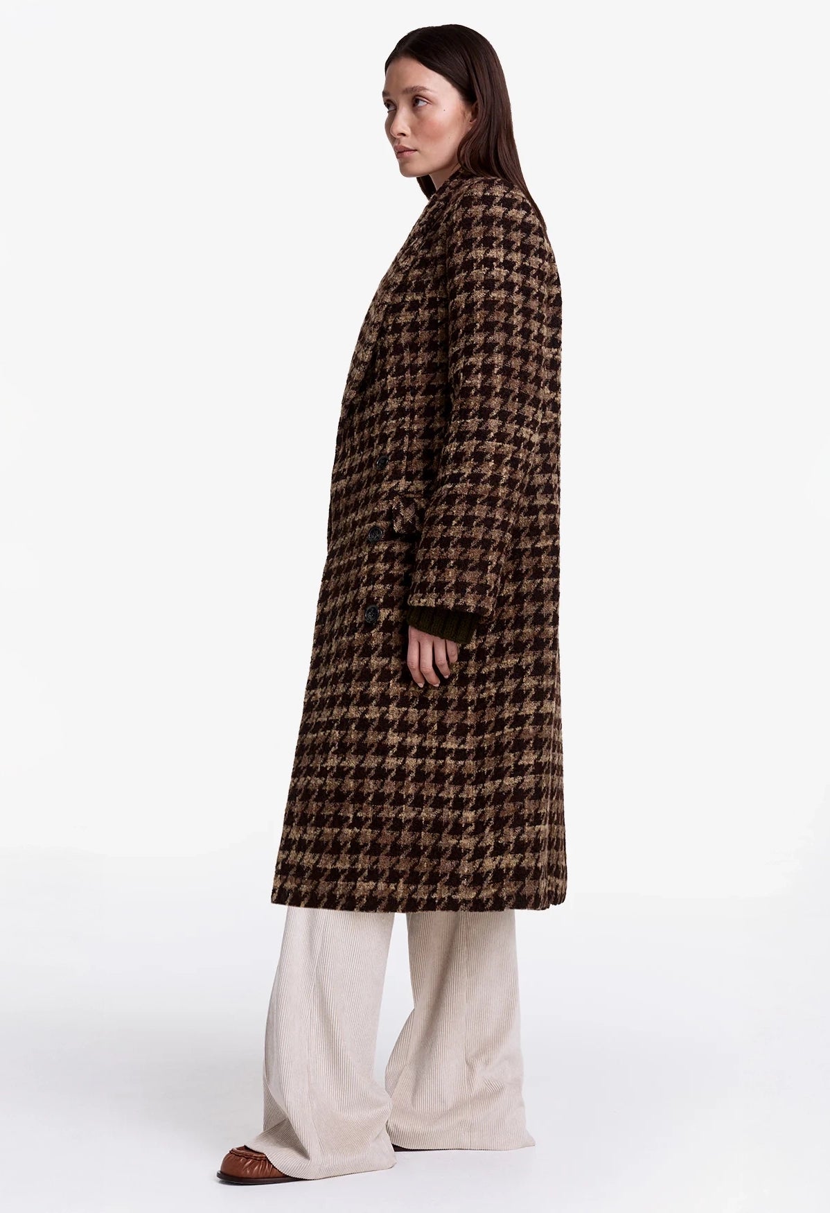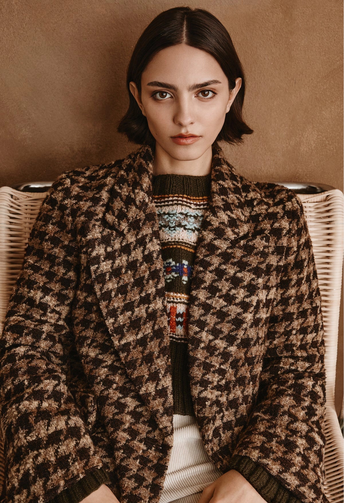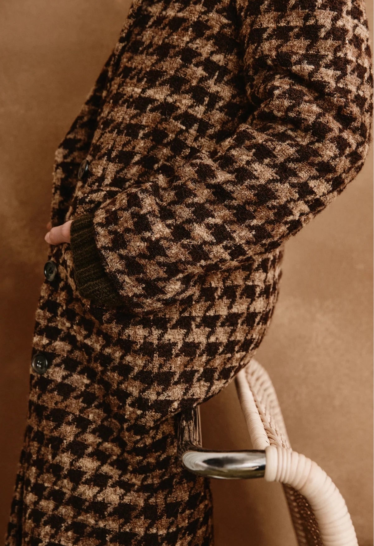 This double-breasted overcoat showcases an oversized silhouette with prominent shoulders and a peaked lapel, crafted from textured boucle houndstooth fabric. The fit is true to size, so select your regular size.